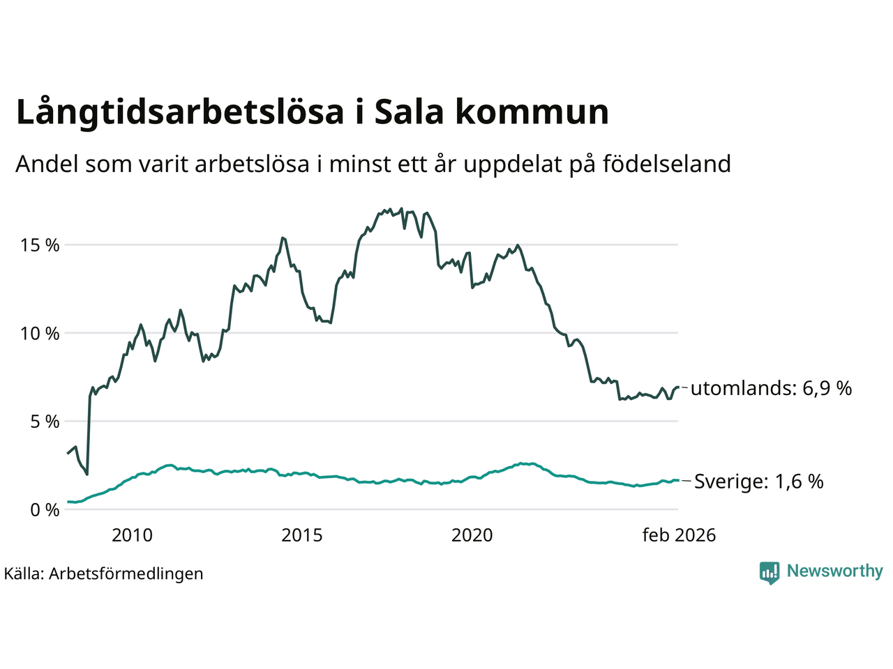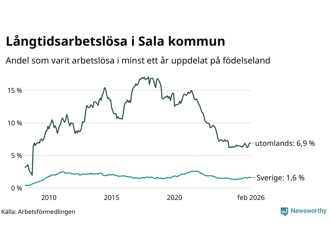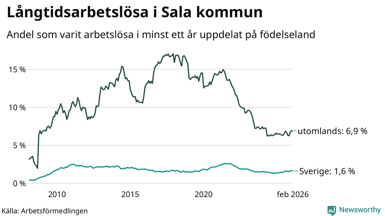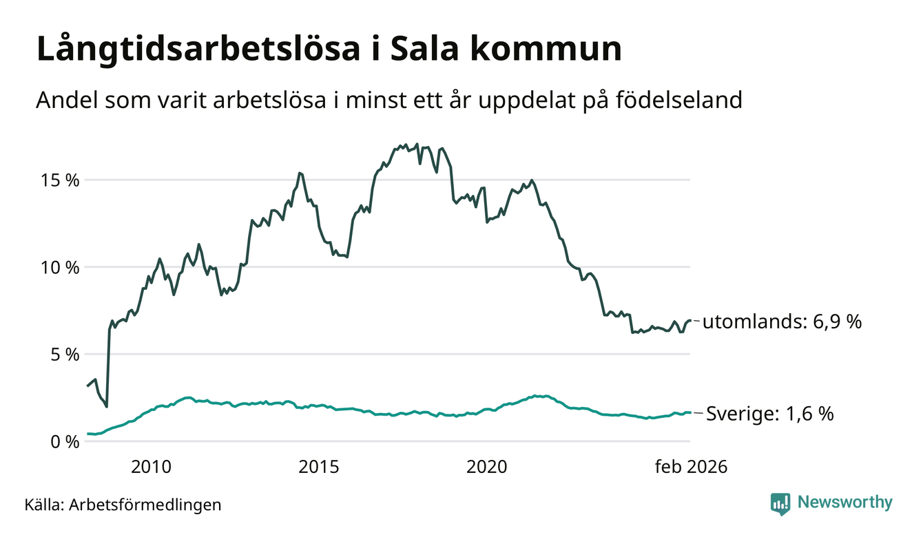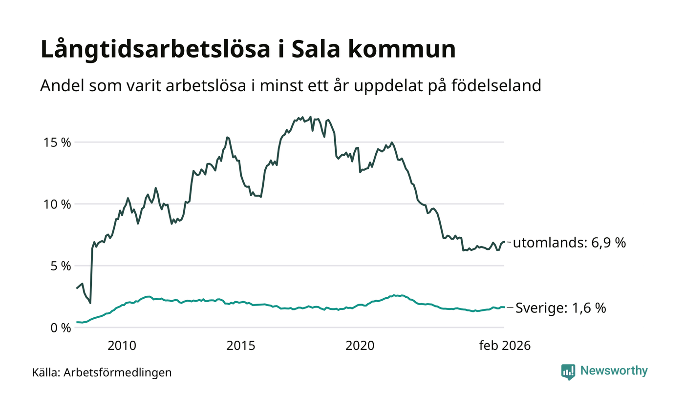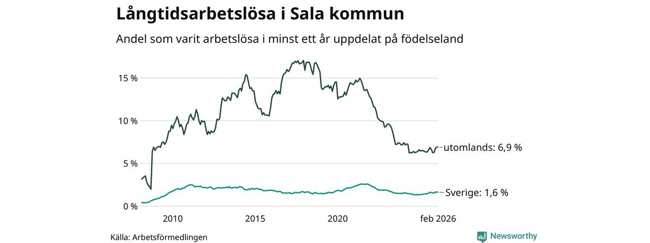 142 av de långtidsarbetslösa i Sala är födda i Sverige, medan 133 är födda utomlands. Det innebär att långtidsarbetslösheten bland Sverigefödda är 1,6 procent, medan den är fyra gånger så hög – 6,9 procent – bland födda utomlands. Även i riket som helhet är arbetslösheten högre bland utrikesfödda.