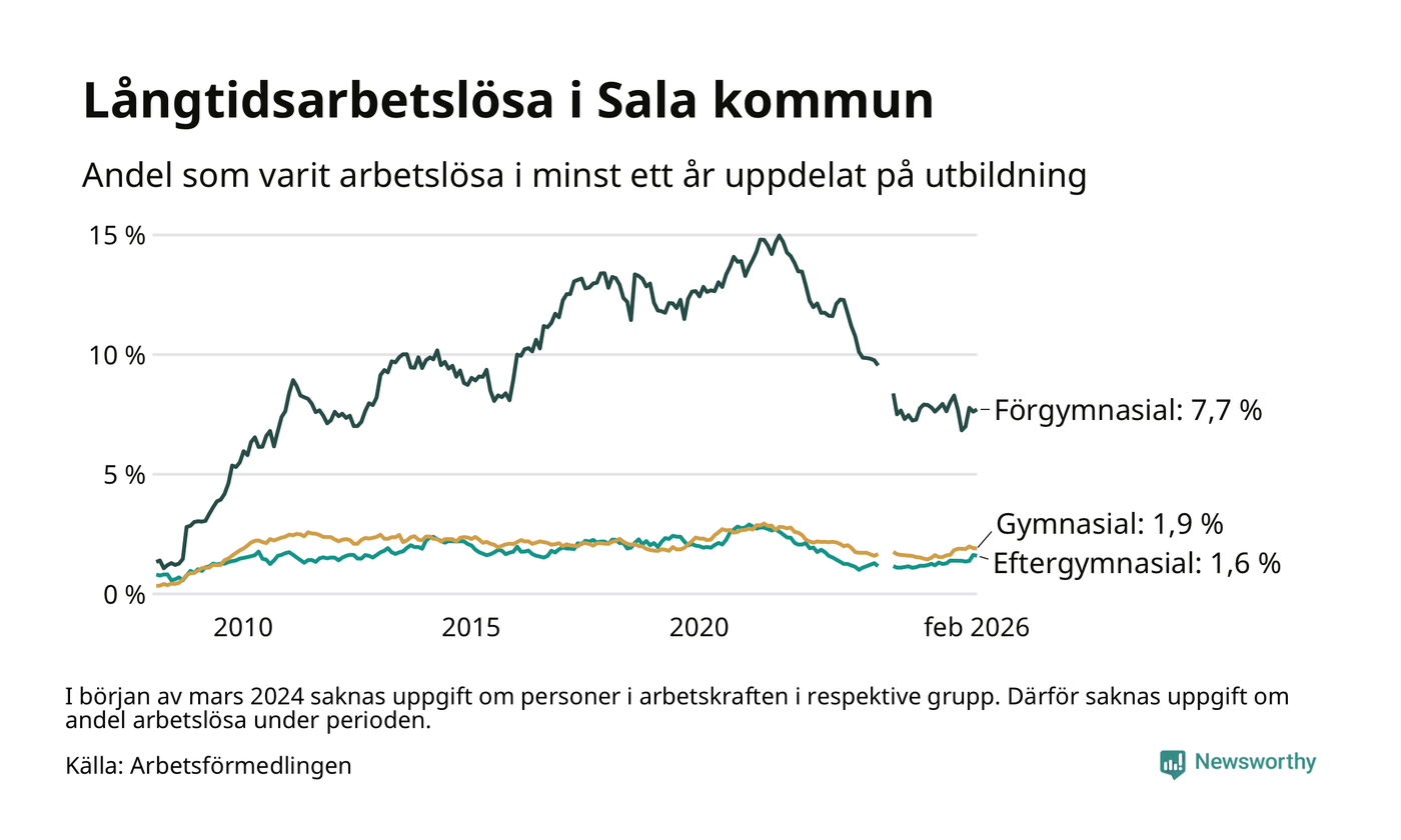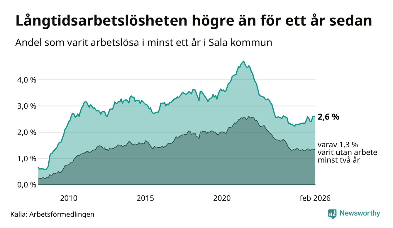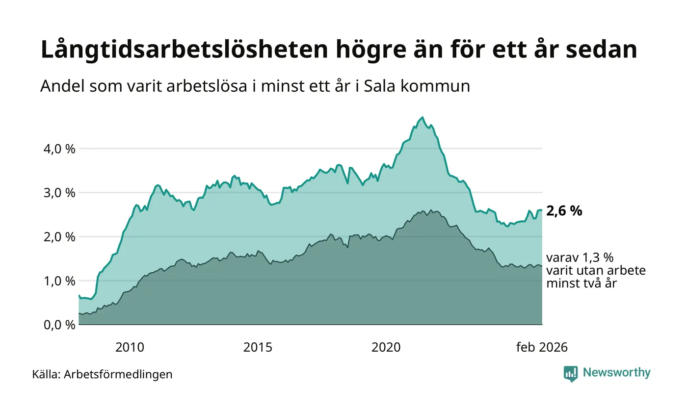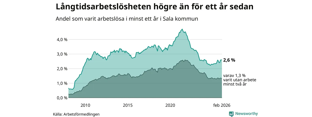 Andelen som varit utan arbete i minst ett år i Sala i februari var högre än för ett år sedan. Men jämfört med i januari har antalet långtidsarbetslösa minskat.