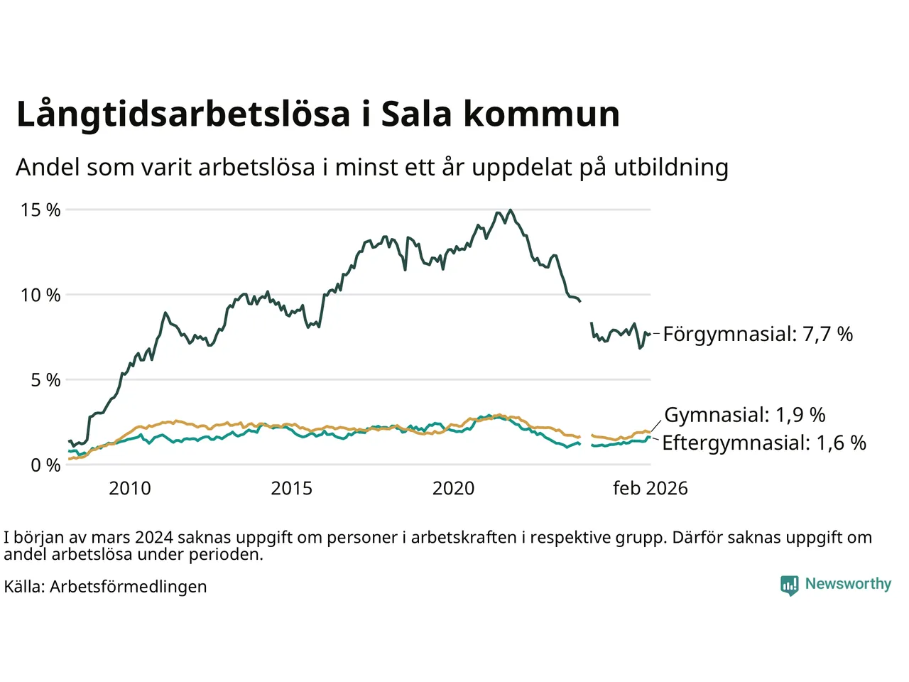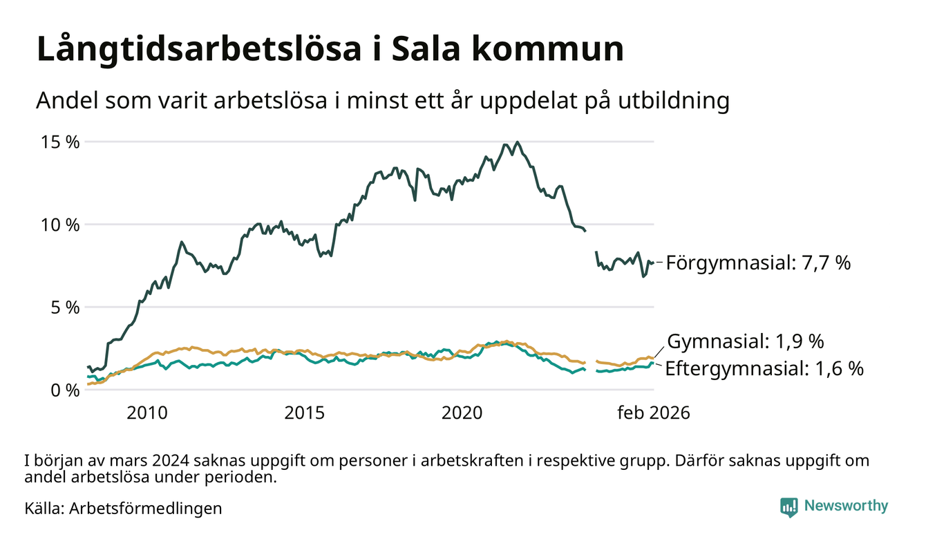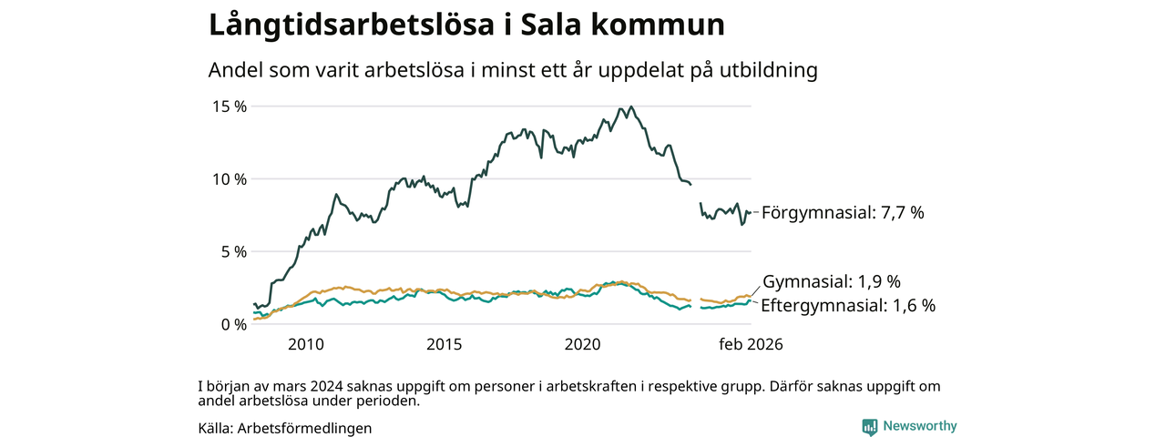 Andelen som varit utan arbete i minst ett år i Sala i februari var högre än för ett år sedan. Men jämfört med i januari har antalet långtidsarbetslösa minskat.