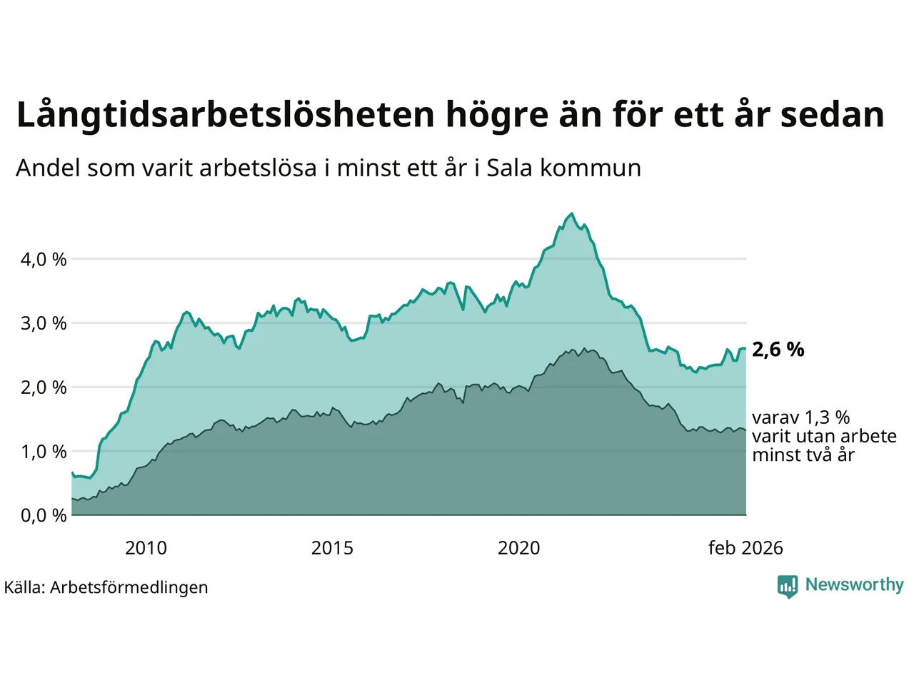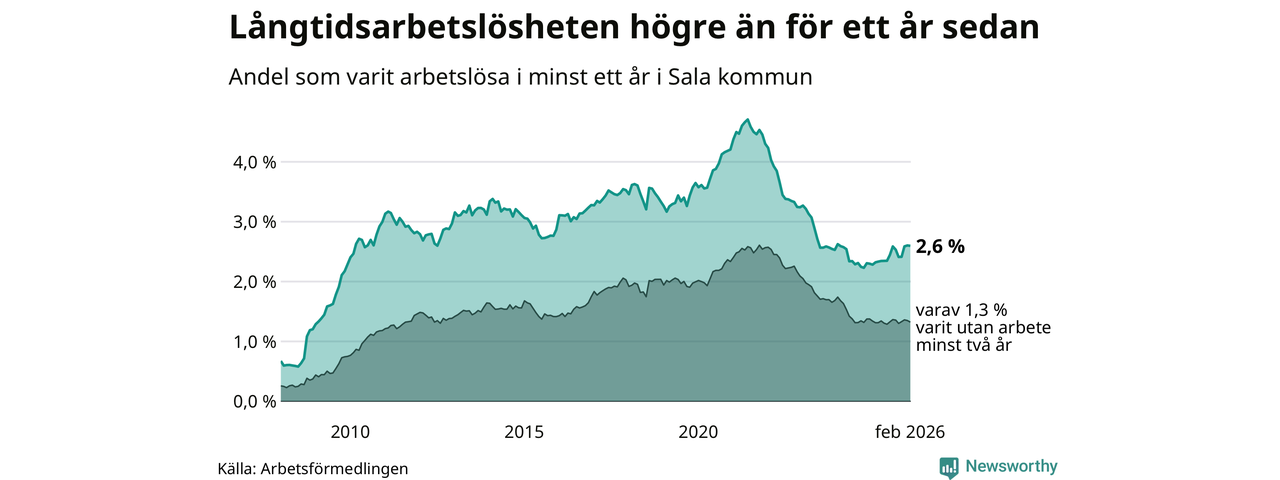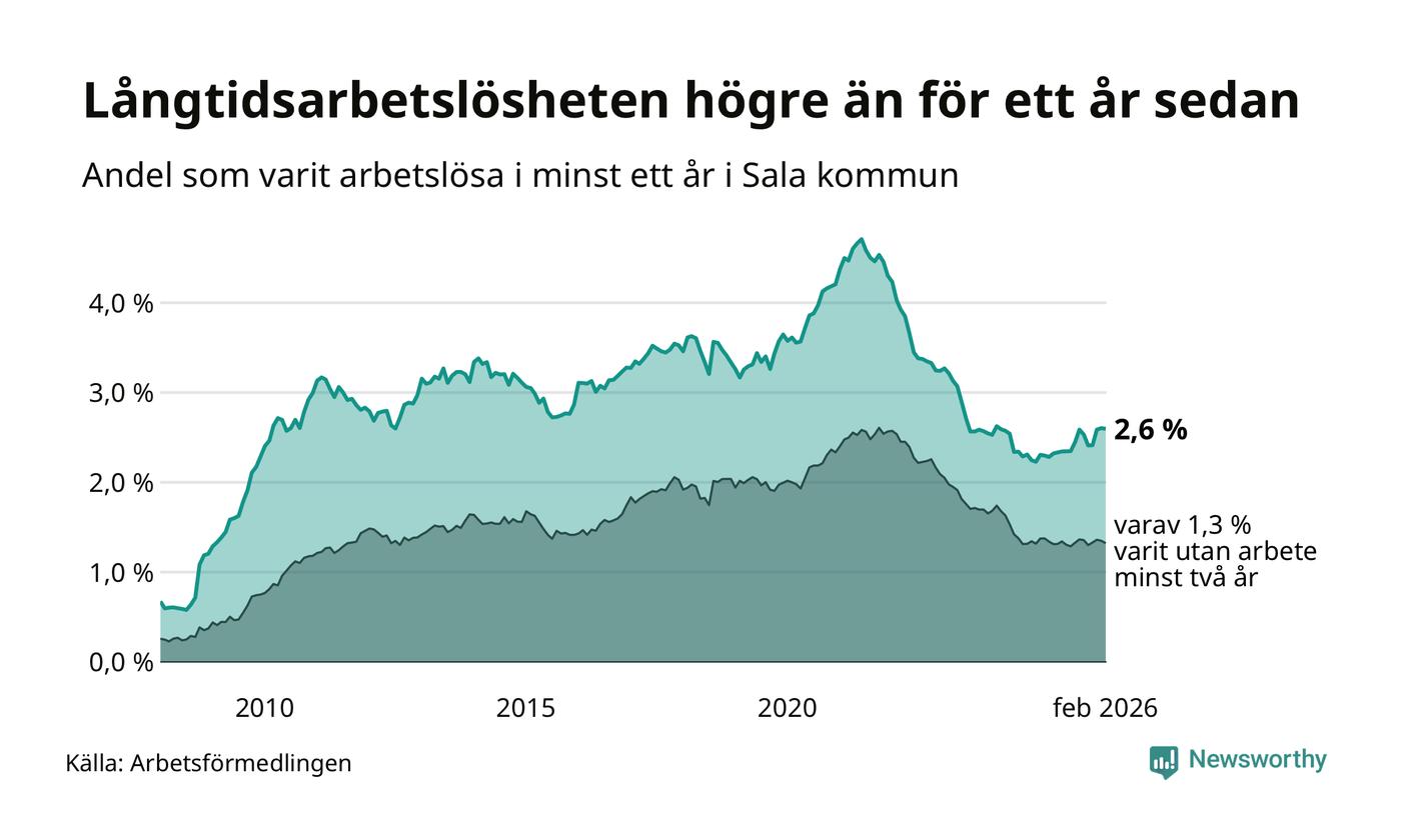 Andelen långtidsarbetslösa i Sala är den näst lägsta i Västmanlands län, bara i Surahammar är andelen lägre (2,5 procent). I Fagersta finns länets högsta långtidsarbetslöshet, 4,4 procent. I Västmanland som helhet hade 4 958 personer (3,6 procent) varit arbetslösa i minst ett år i februari. Det är en person fler än månaden innan.