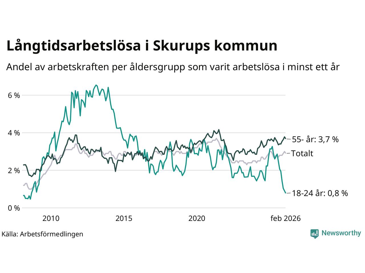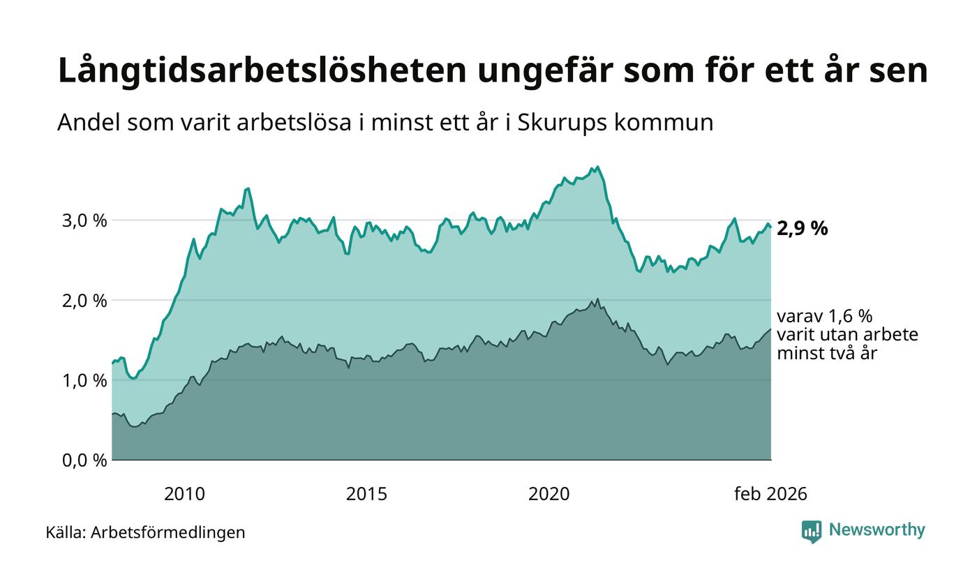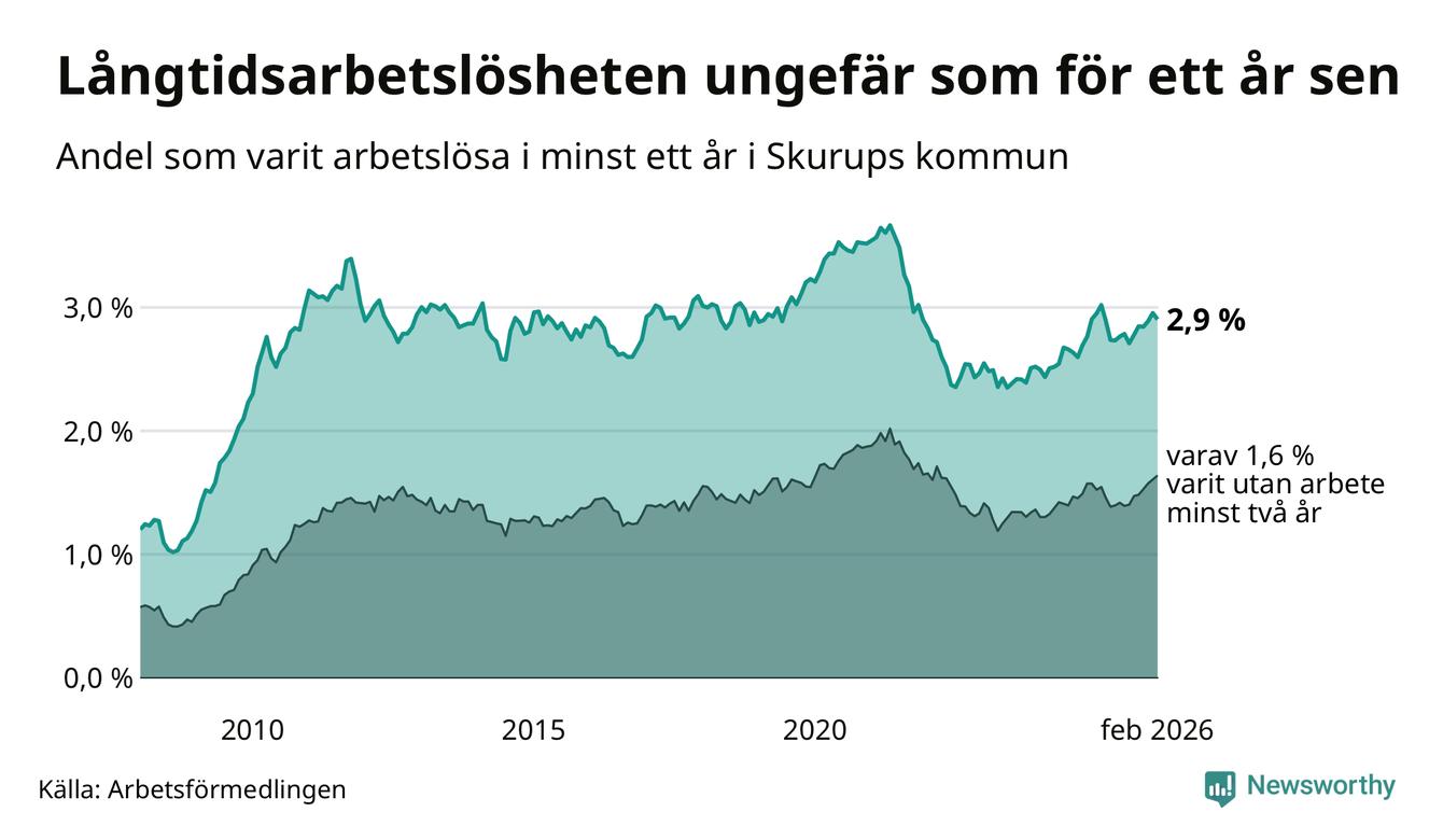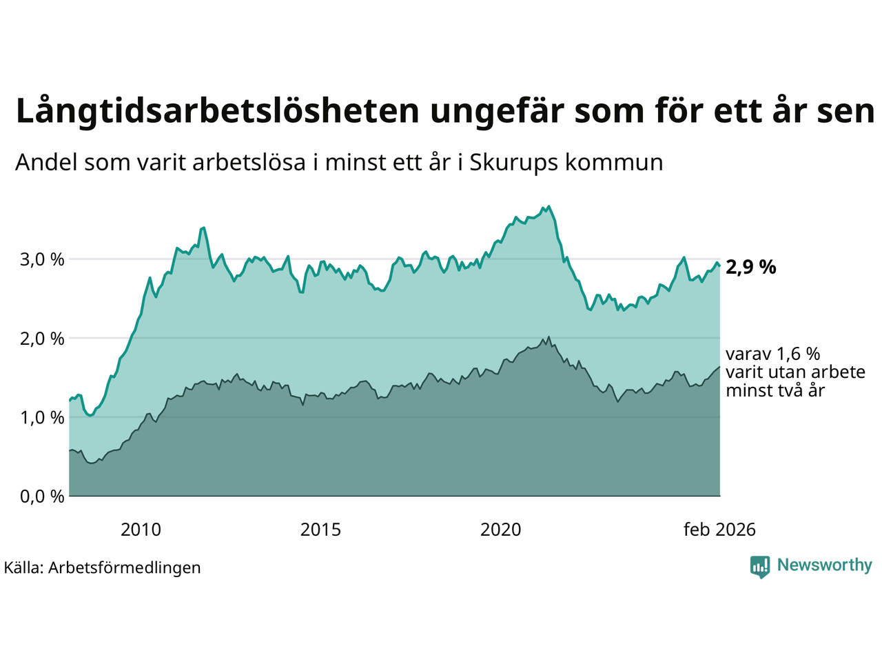 I februari hade 248 Skurupsbor varit arbetslösa i minst ett år, vilket är fyra färre än månaden innan. Det är den första månaden sedan augusti 2025 som antalet arbetslösa minskar. 248 personer motsvarar 2,9 procent av arbetskraften i kommunen – andelen långtidsarbetslösa är ungefär på samma nivå som för ett år sedan.