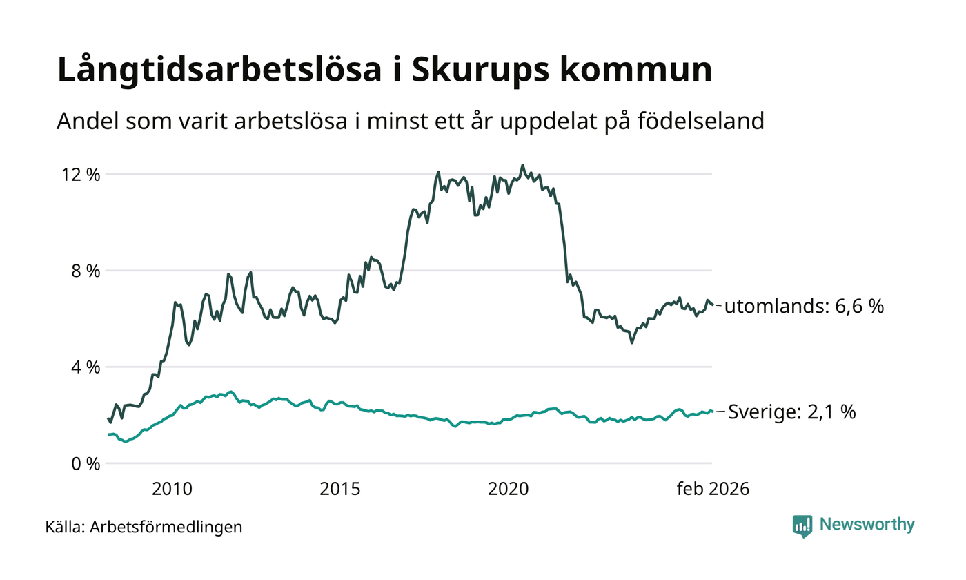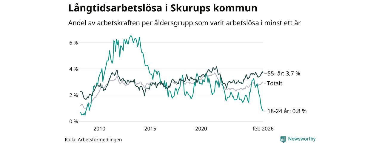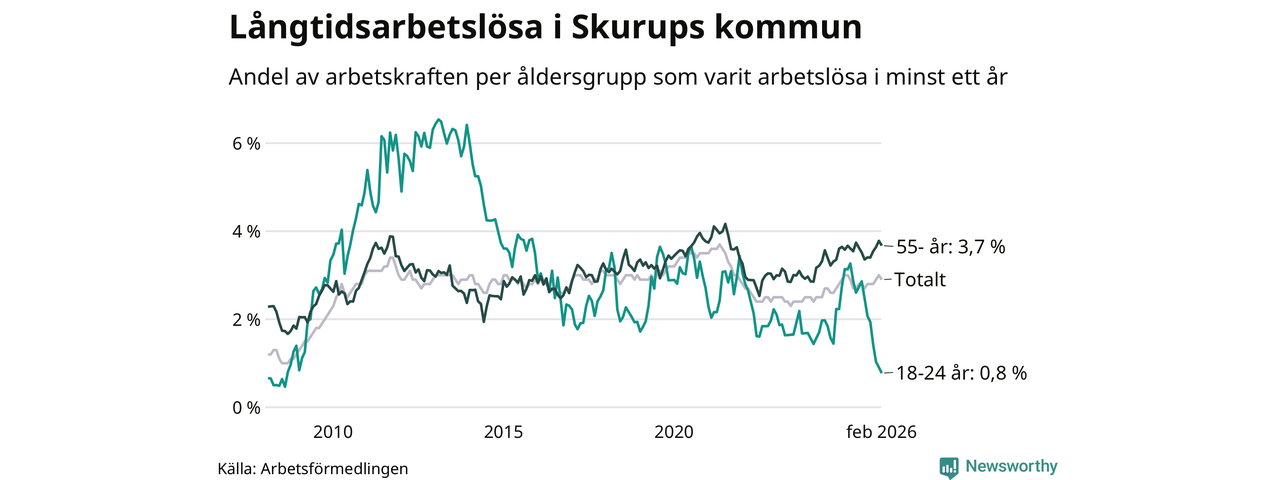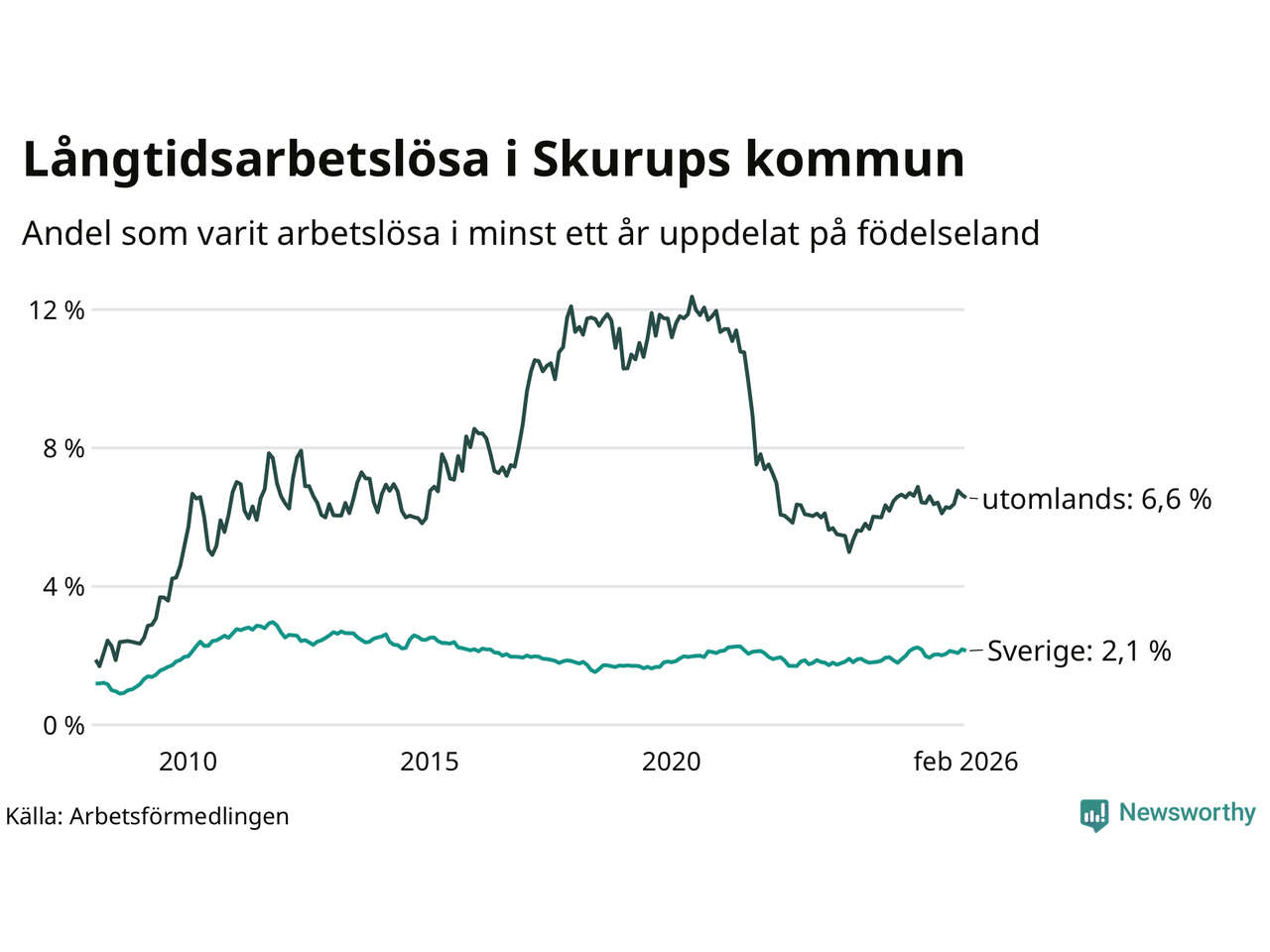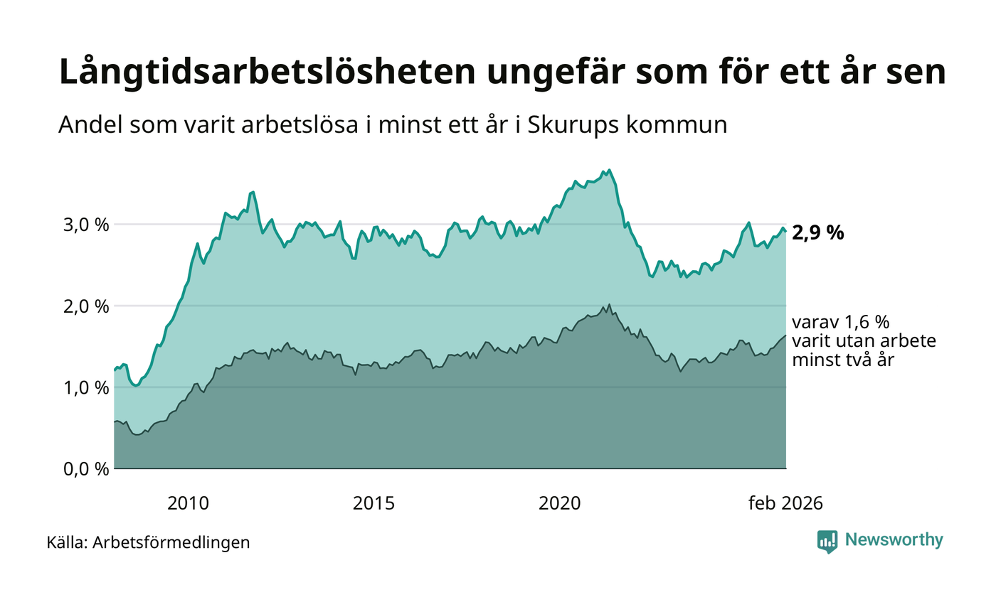 I februari hade 248 Skurupsbor varit arbetslösa i minst ett år, vilket är fyra färre än månaden innan. Det är den första månaden sedan augusti 2025 som antalet arbetslösa minskar. 248 personer motsvarar 2,9 procent av arbetskraften i kommunen – andelen långtidsarbetslösa är ungefär på samma nivå som för ett år sedan.