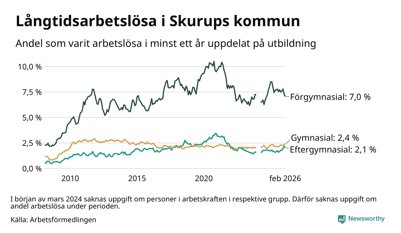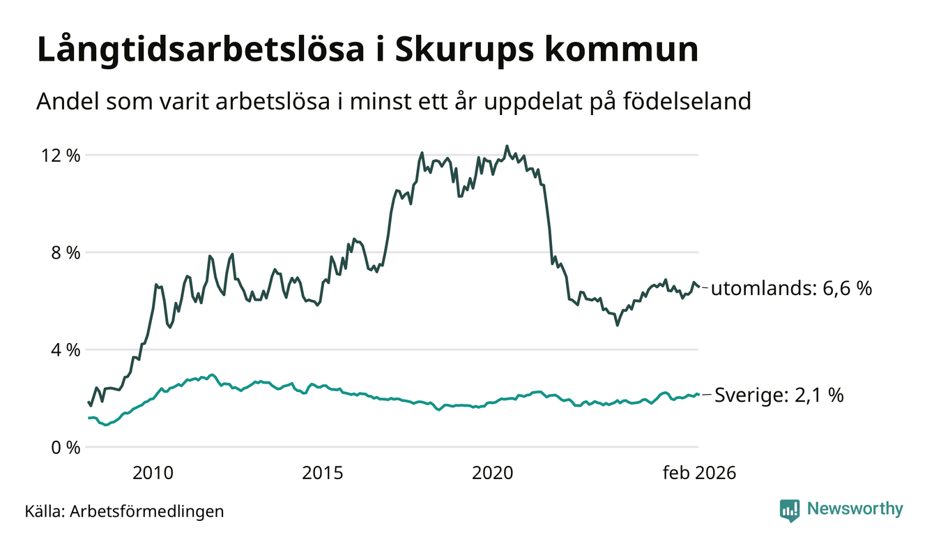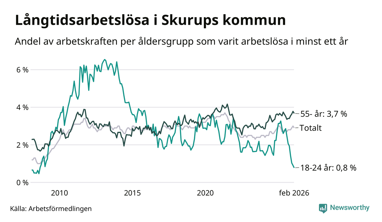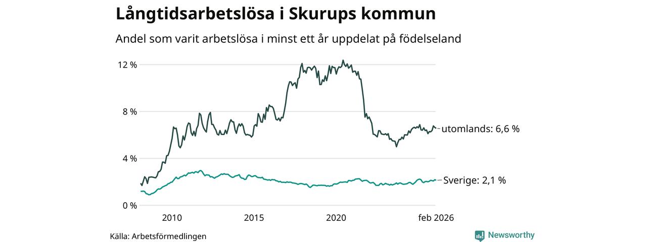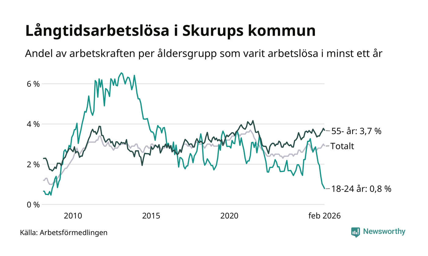 I februari hade 248 Skurupsbor varit arbetslösa i minst ett år, vilket är fyra färre än månaden innan. Det är den första månaden sedan augusti 2025 som antalet arbetslösa minskar. 248 personer motsvarar 2,9 procent av arbetskraften i kommunen – andelen långtidsarbetslösa är ungefär på samma nivå som för ett år sedan.