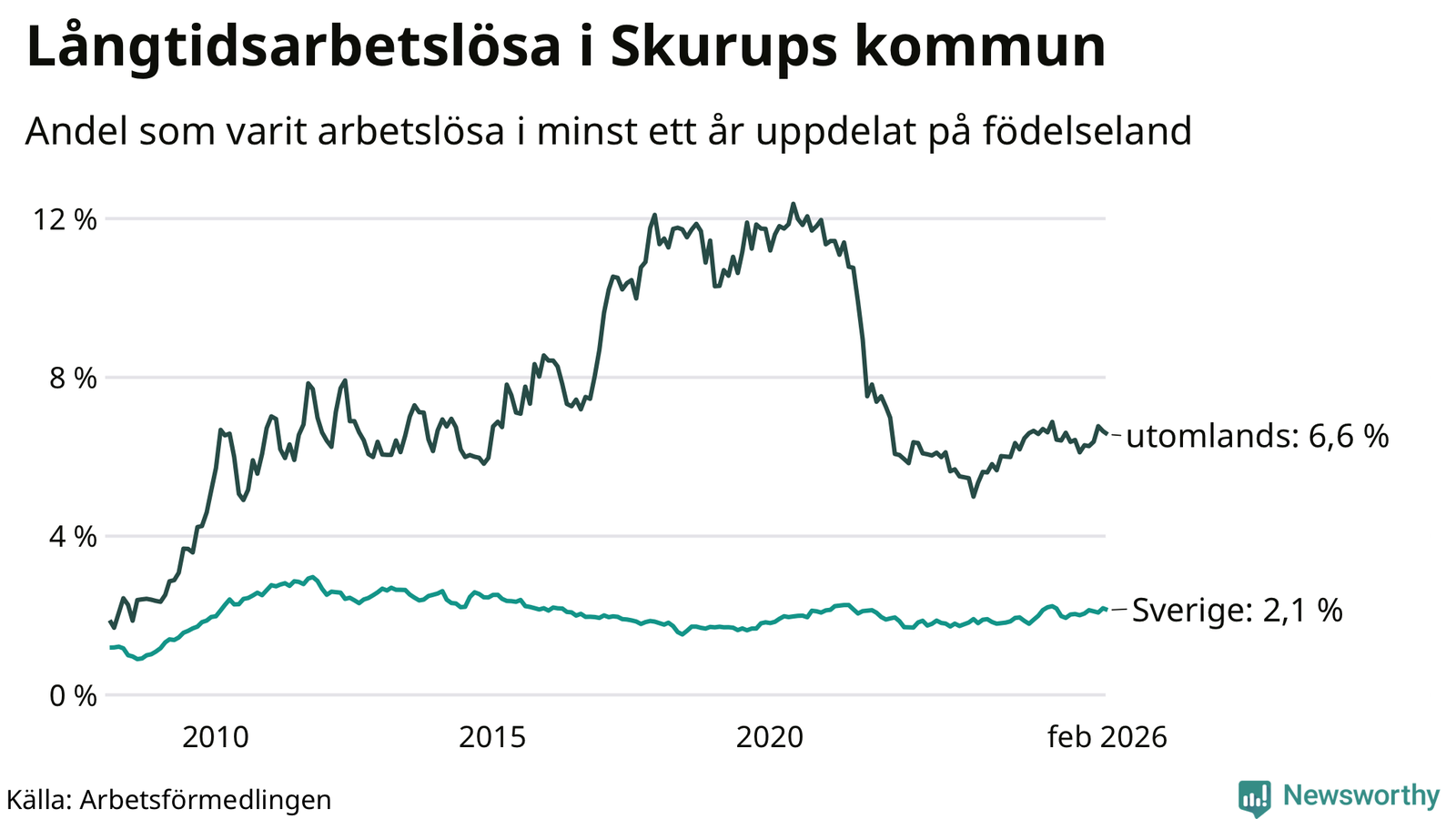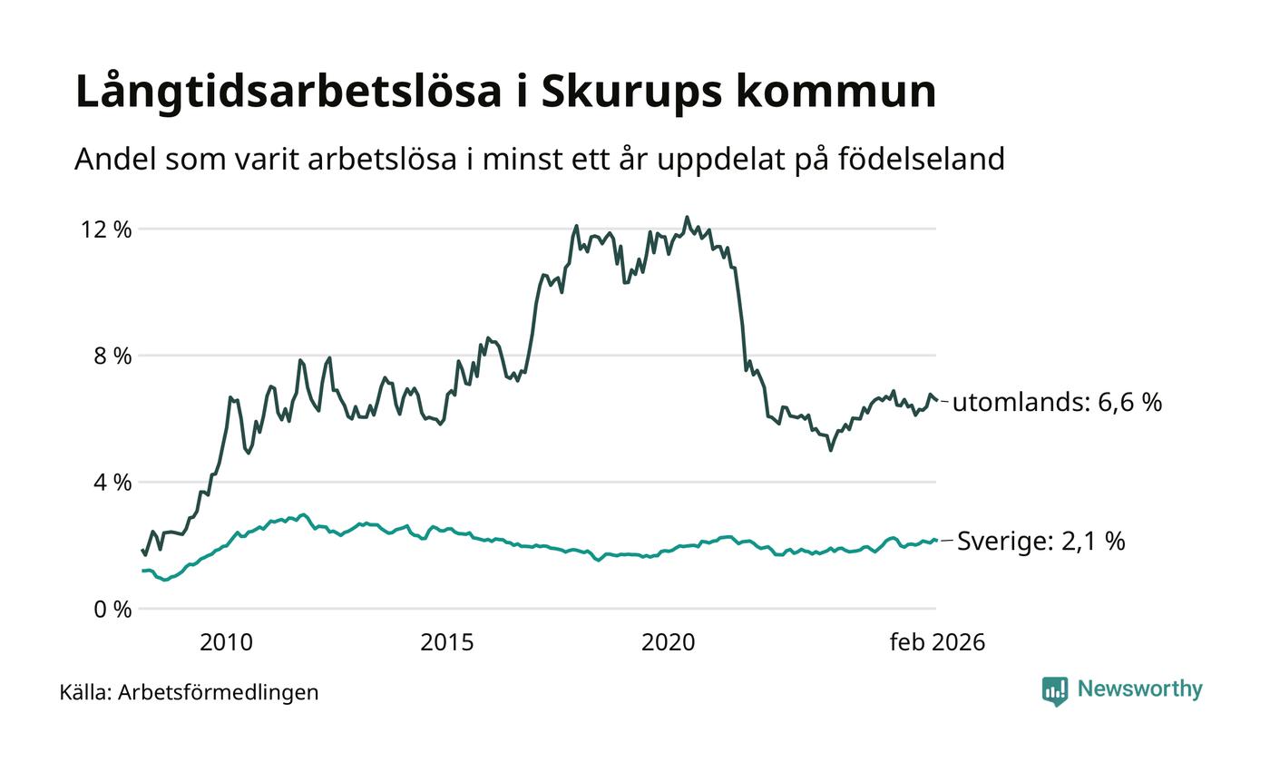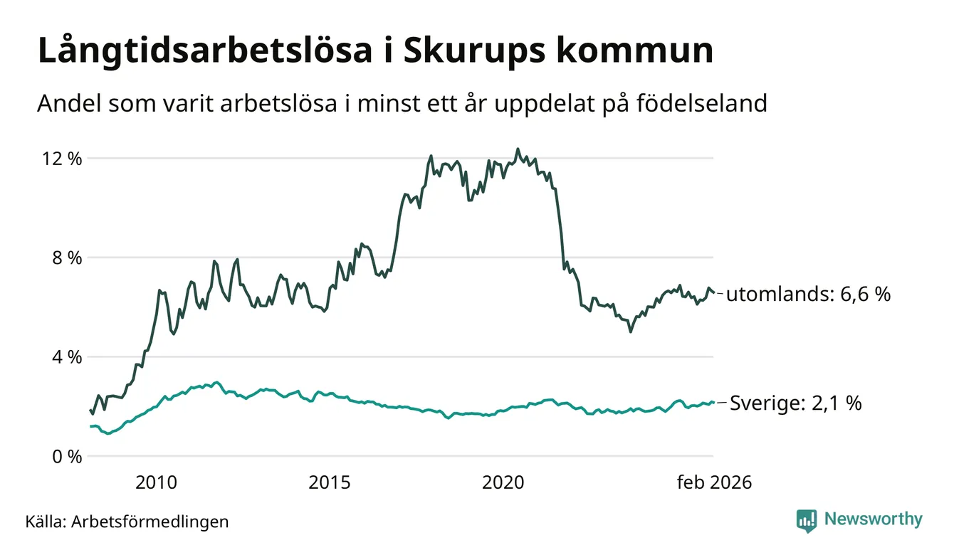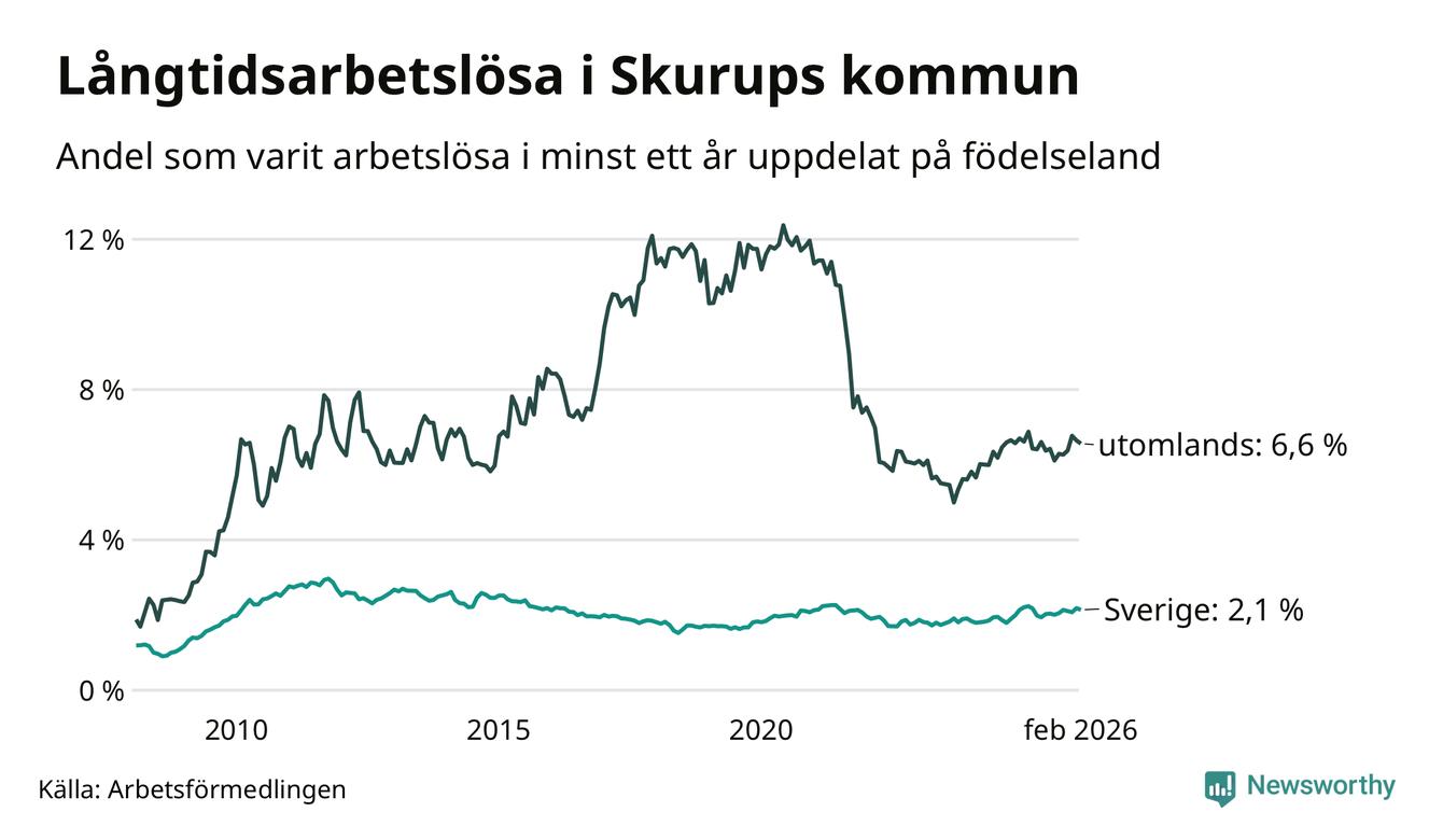 151 av de långtidsarbetslösa i Skurup är födda i Sverige, medan 97 är födda utomlands. Det innebär att långtidsarbetslösheten bland Sverigefödda är 2,1 procent, medan den är tre gånger så hög – 6,6 procent – bland födda utomlands. Även i riket som helhet är arbetslösheten högre bland utrikesfödda.