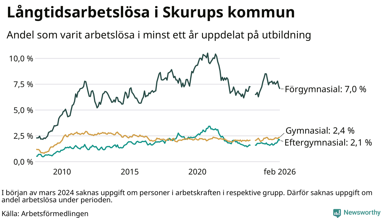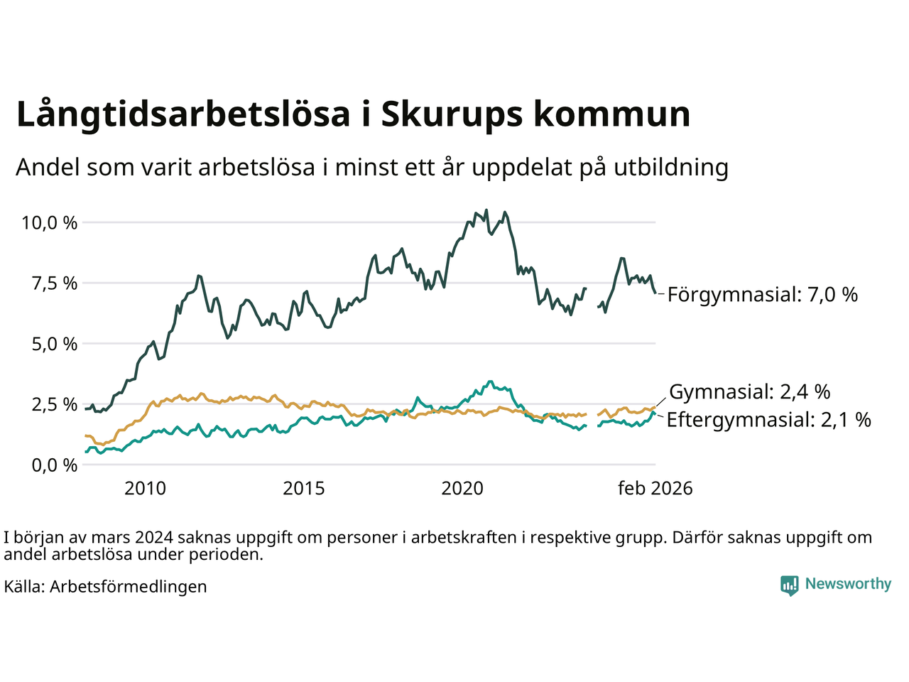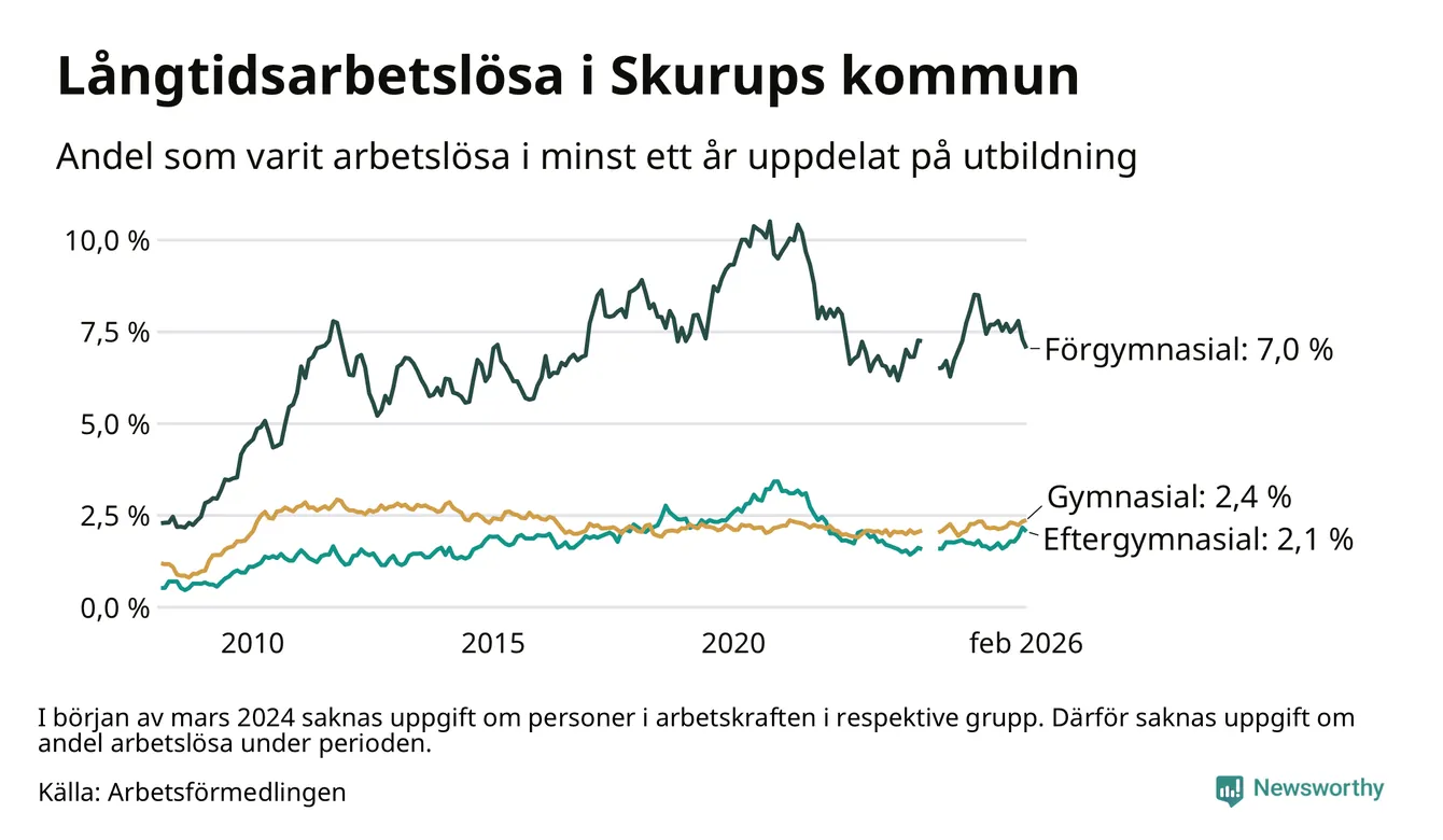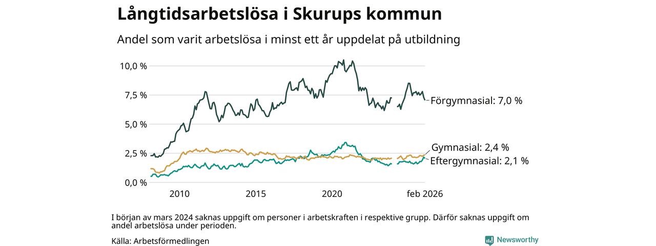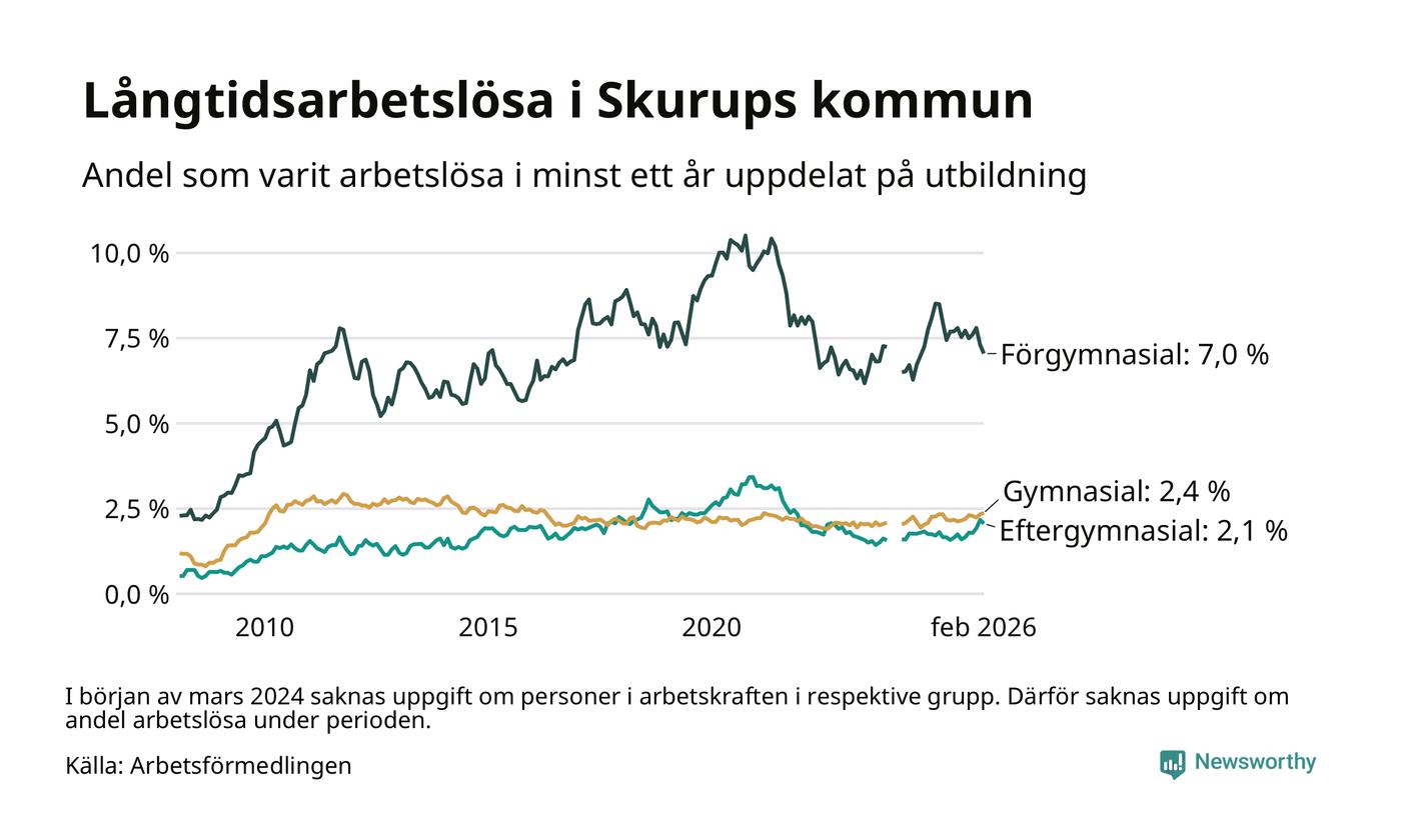Andelen som varit utan arbete i minst ett år i Skurup var ungefär lika stor i februari jämfört med samma månad för ett år sedan. Det visar Arbetsfömedlingens senaste månadsstatistik.
