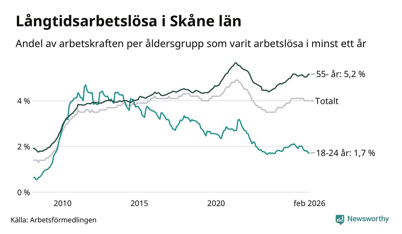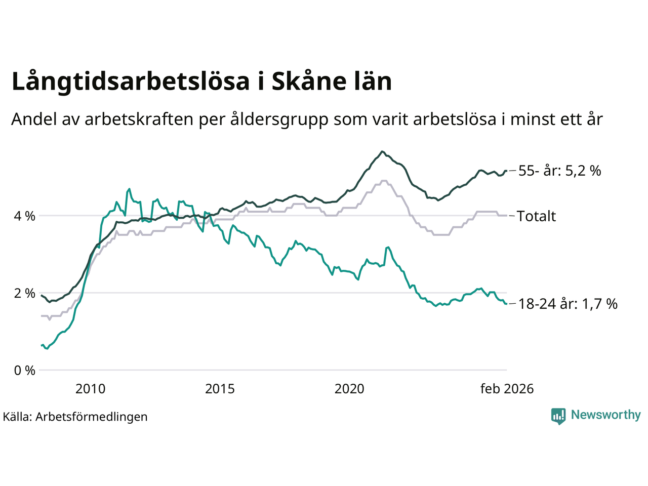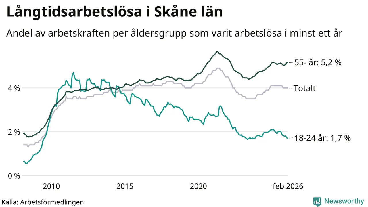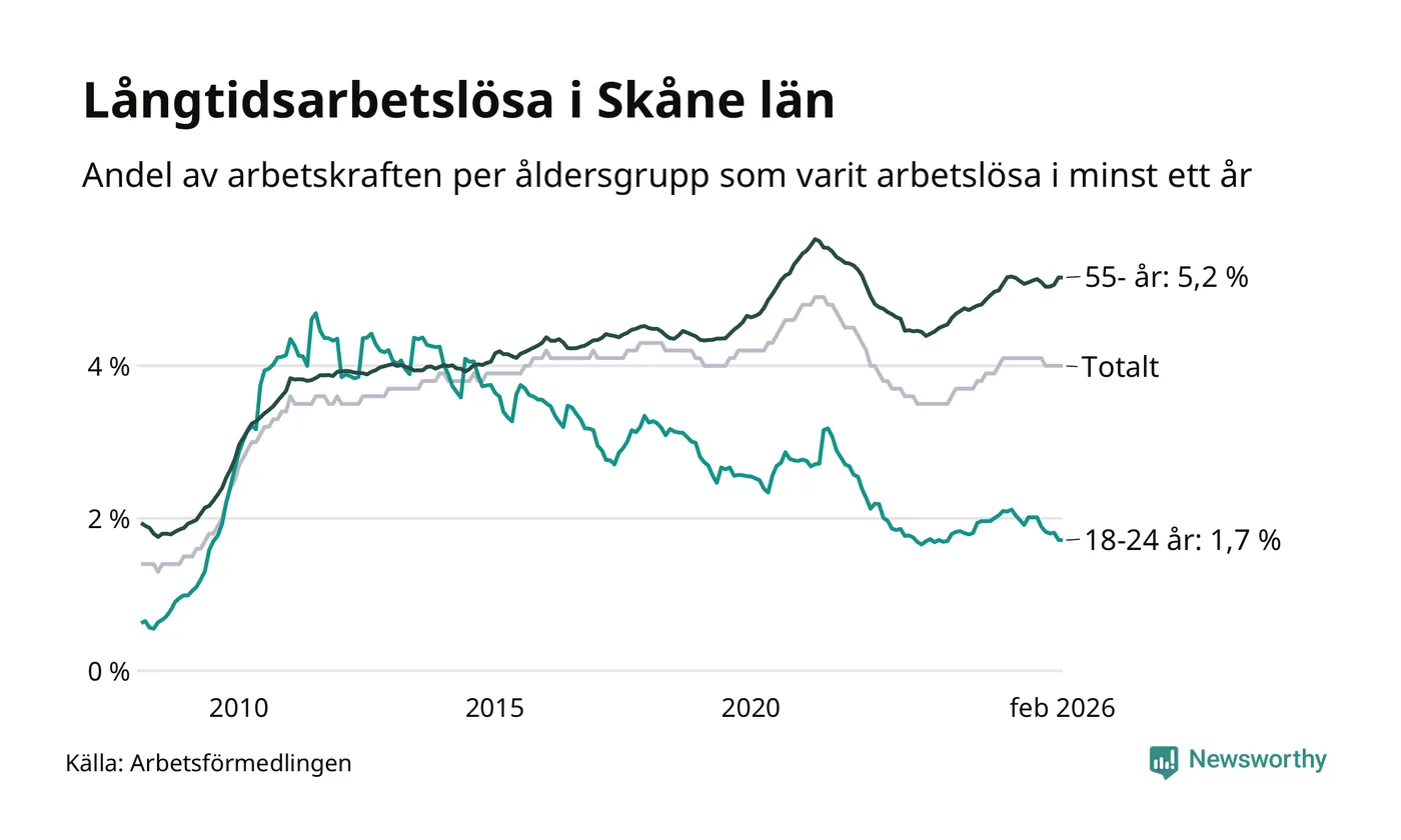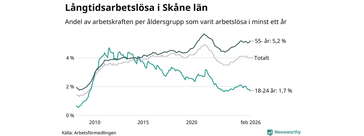 Av de 27 964 personerna som varit arbetslösa i mer än ett år i Skåne län är 7 587 personer mellan 55 och 661 år och 1 195 är mellan 18 och 24 år. För den äldre gruppen är andelen arbetslösa 5,2 procent medan den i den yngre gruppen är 1,7 procent. Även i riket som helhet är långtidsarbetslösheten högre i gruppen äldre.