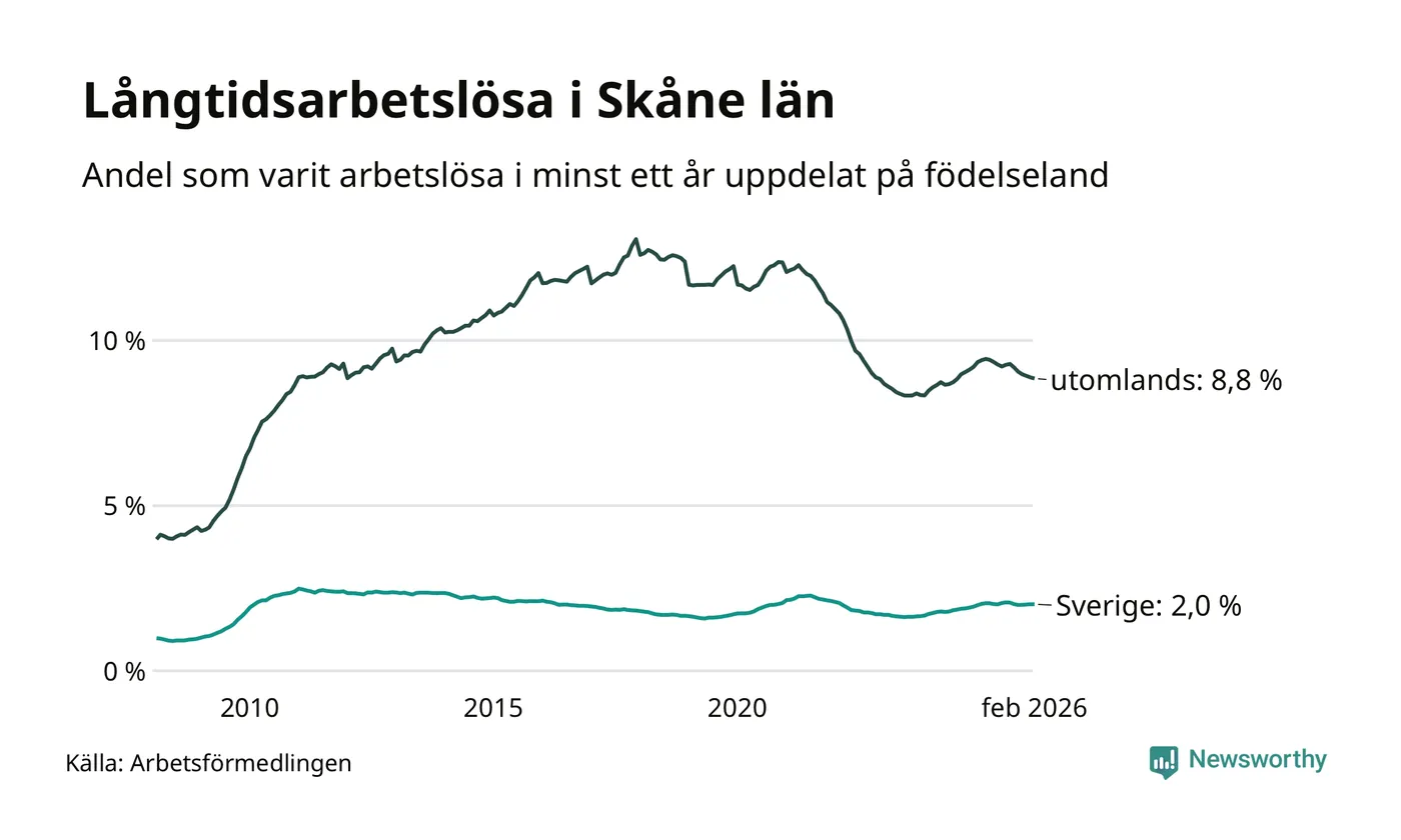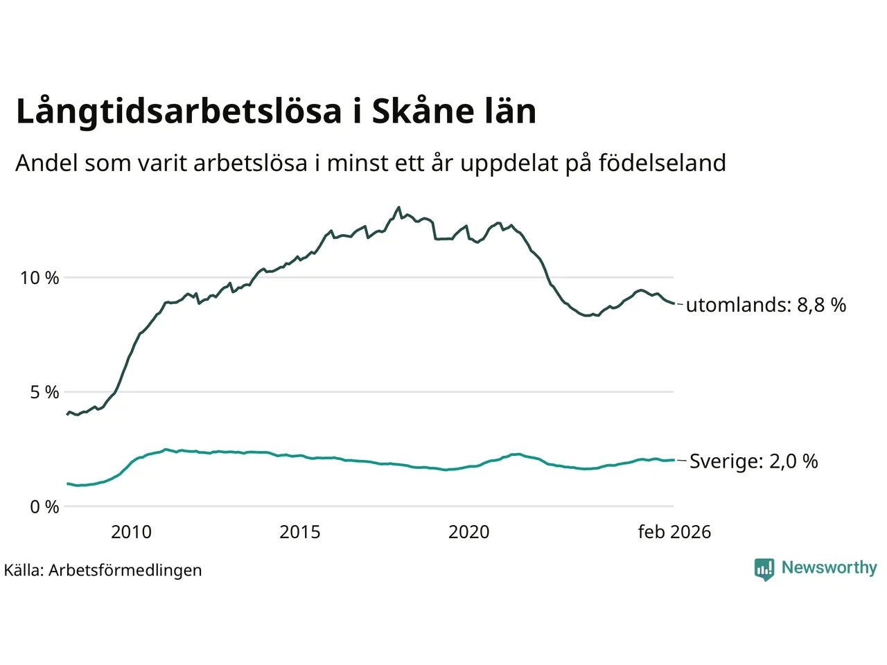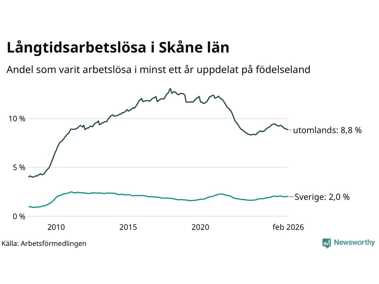 10 164 av de långtidsarbetslösa i Skåne är födda i Sverige och mellan 17 801 och 17 804 är födda utomlands. Det innebär att långtidsarbetslösheten bland Sverigefödda är 2,0 procent, medan den ligger på 8,8 procent för utlandsfödda.