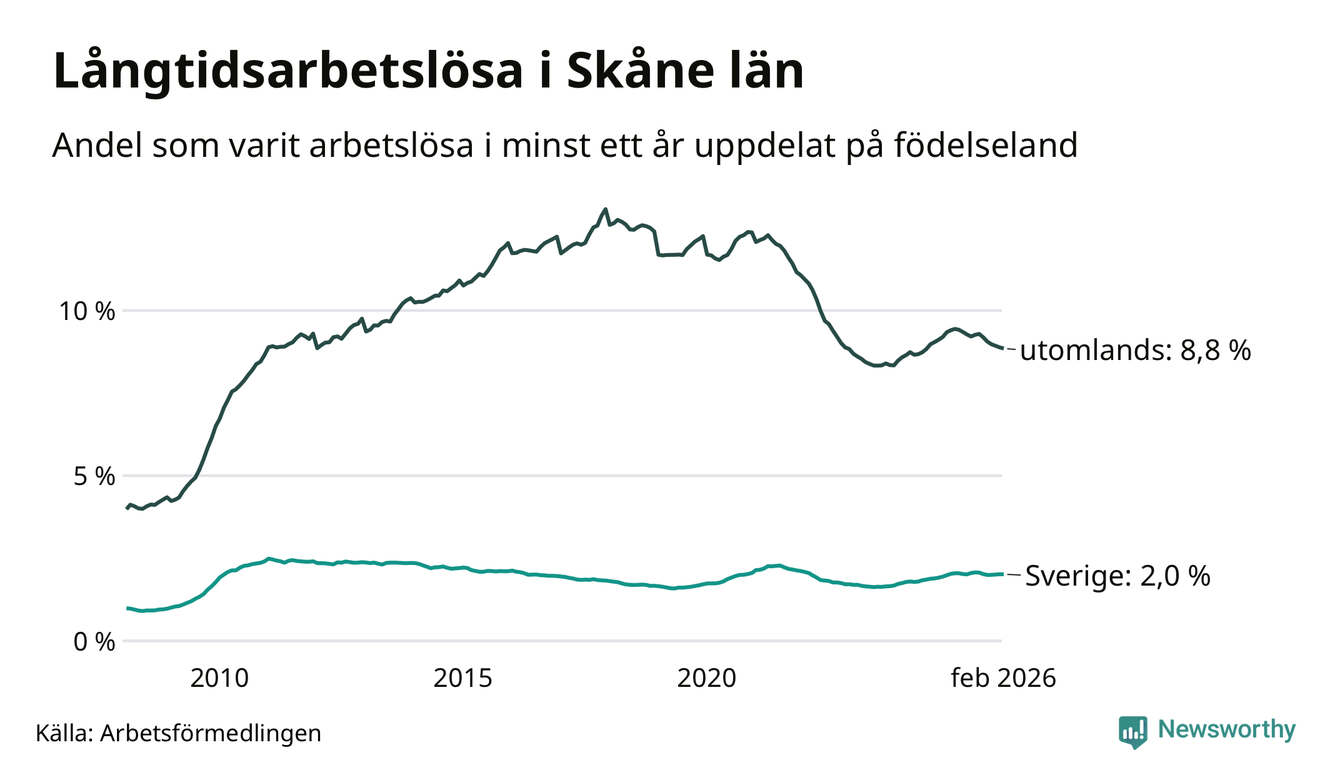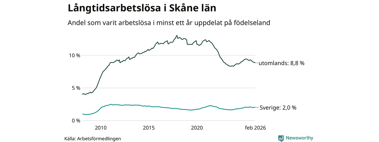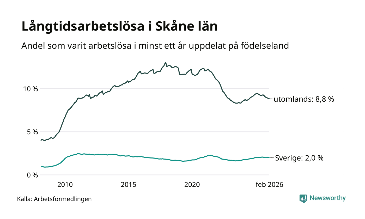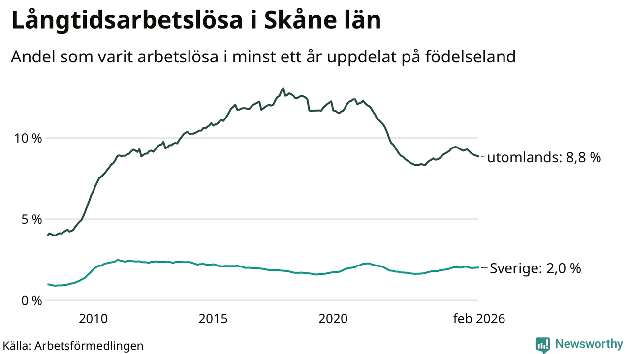 10 164 av de långtidsarbetslösa i Skåne är födda i Sverige och mellan 17 801 och 17 804 är födda utomlands. Det innebär att långtidsarbetslösheten bland Sverigefödda är 2,0 procent, medan den ligger på 8,8 procent för utlandsfödda.