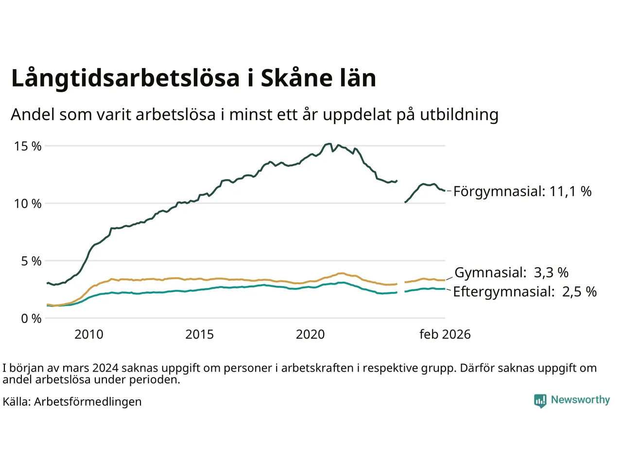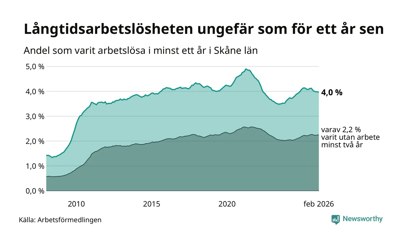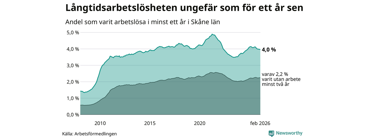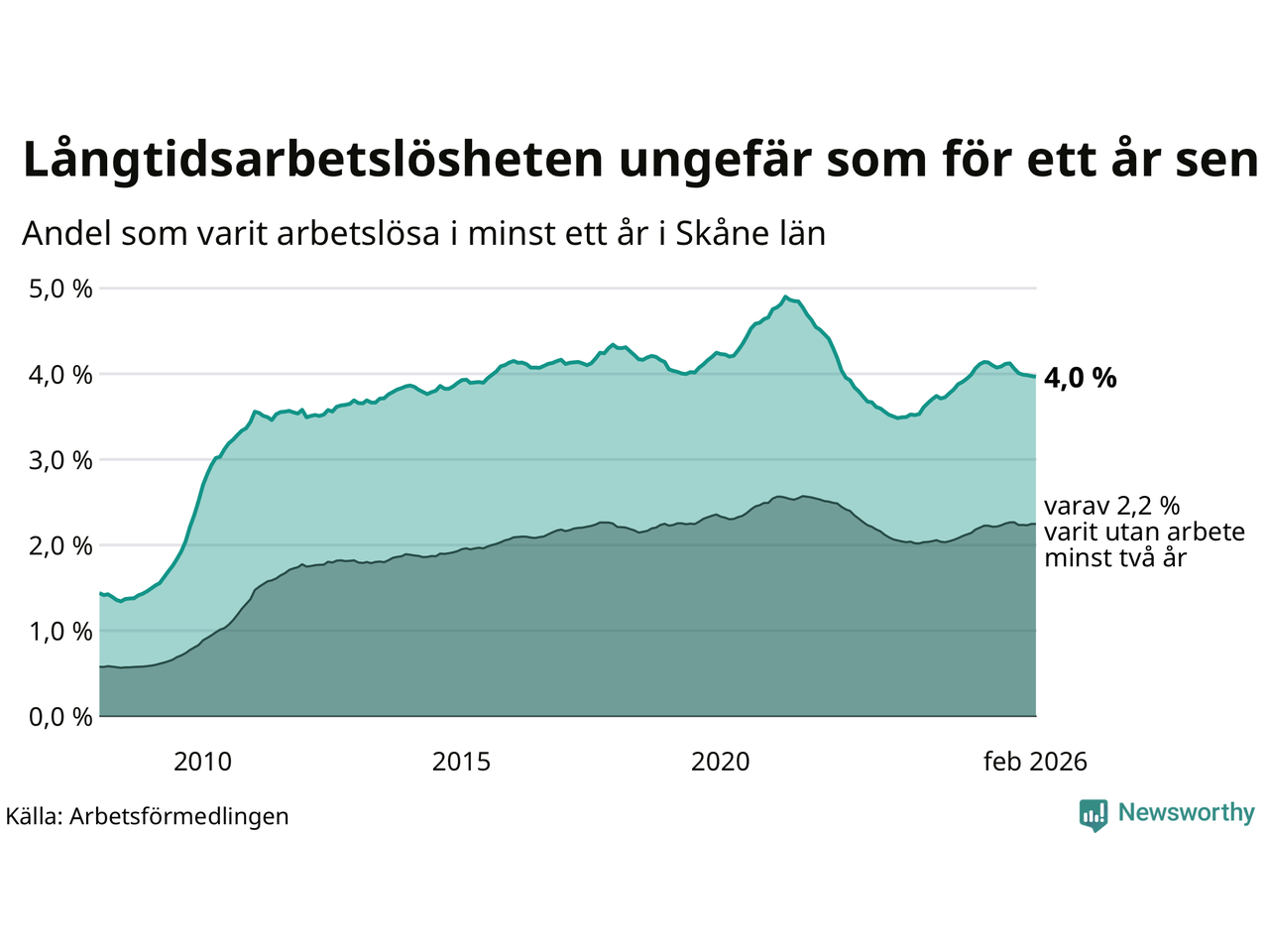 I februari hade 27 964 Skånebor varit arbetslösa i minst ett år, vilket är 50 färre än månaden innan. 27 964 personer motsvarar 4,0 procent av arbetskraften i länet – andelen långtidsarbetslösa är ungefär på samma nivå som för ett år sedan. Skåne län hade högst andel långtidsarbetslösa i landet i februari.