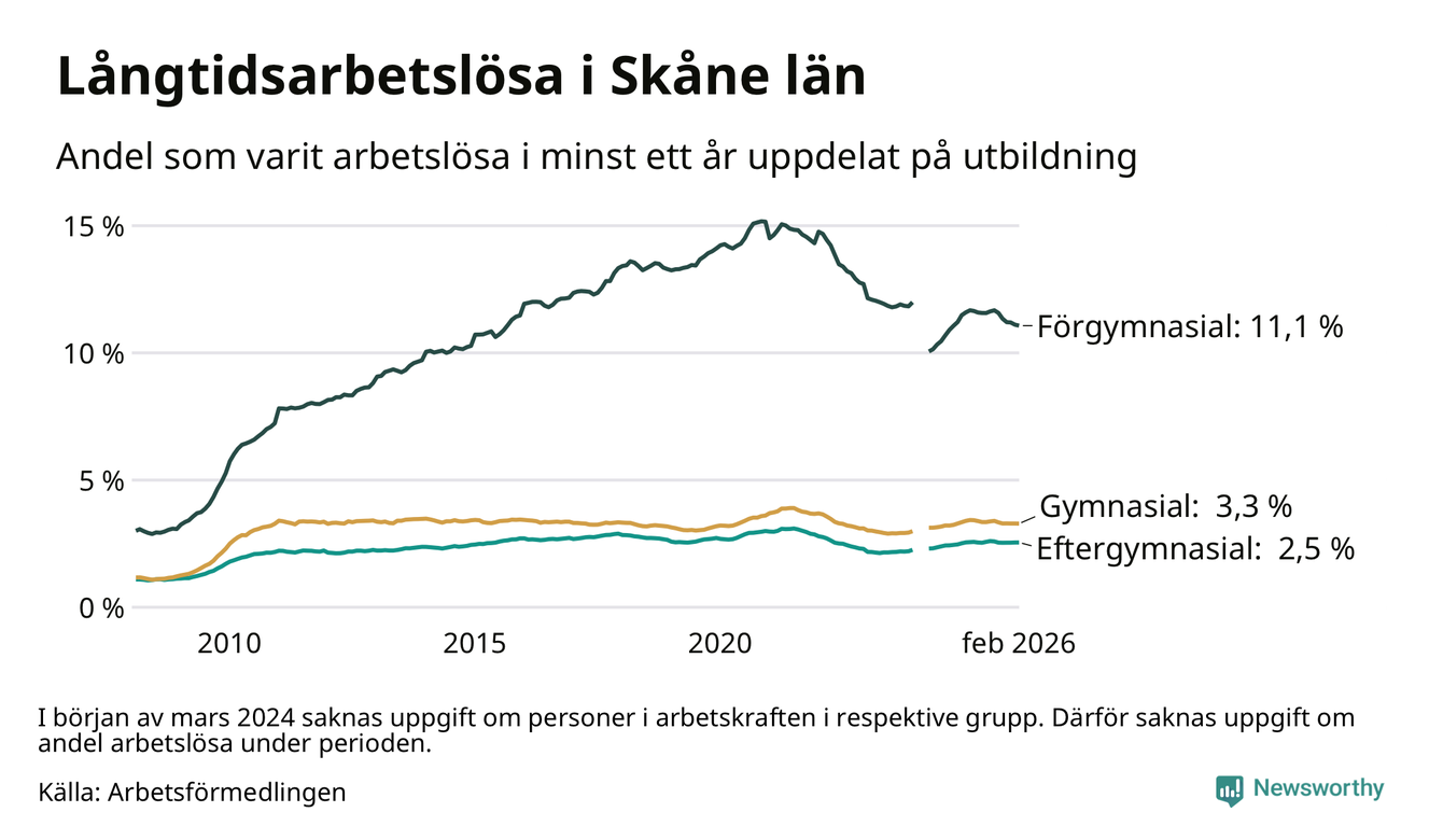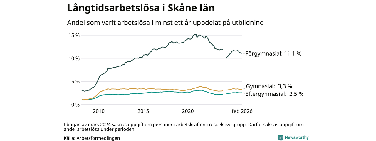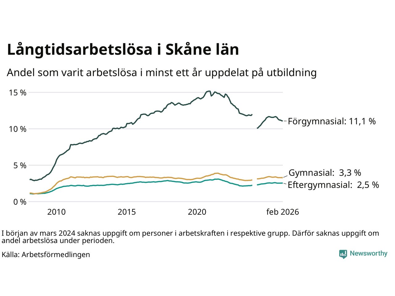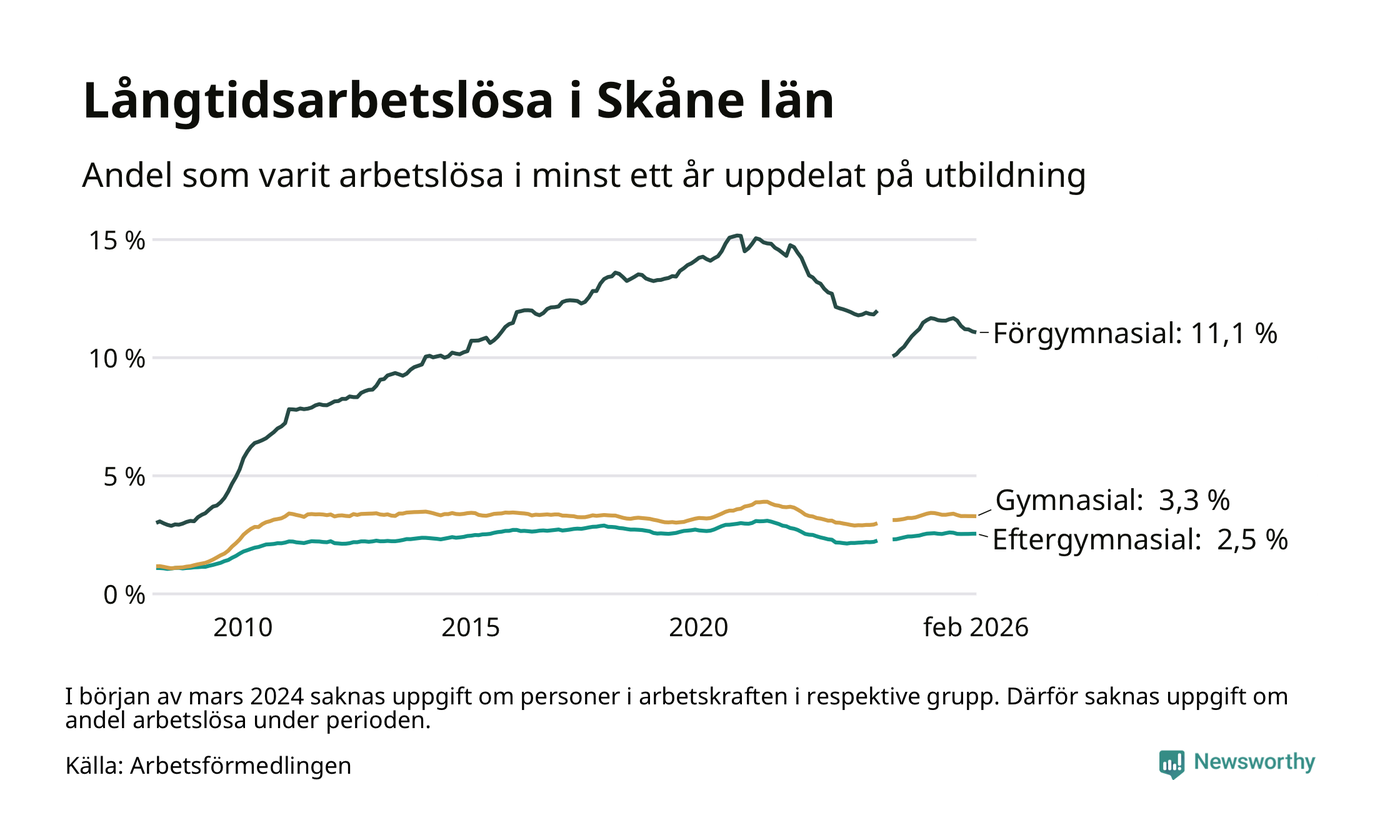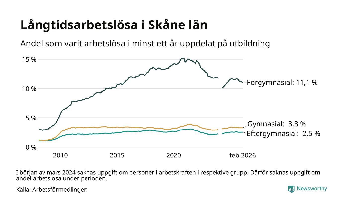 I februari hade 27 964 Skånebor varit arbetslösa i minst ett år, vilket är 50 färre än månaden innan. 27 964 personer motsvarar 4,0 procent av arbetskraften i länet – andelen långtidsarbetslösa är ungefär på samma nivå som för ett år sedan. Skåne län hade högst andel långtidsarbetslösa i landet i februari.