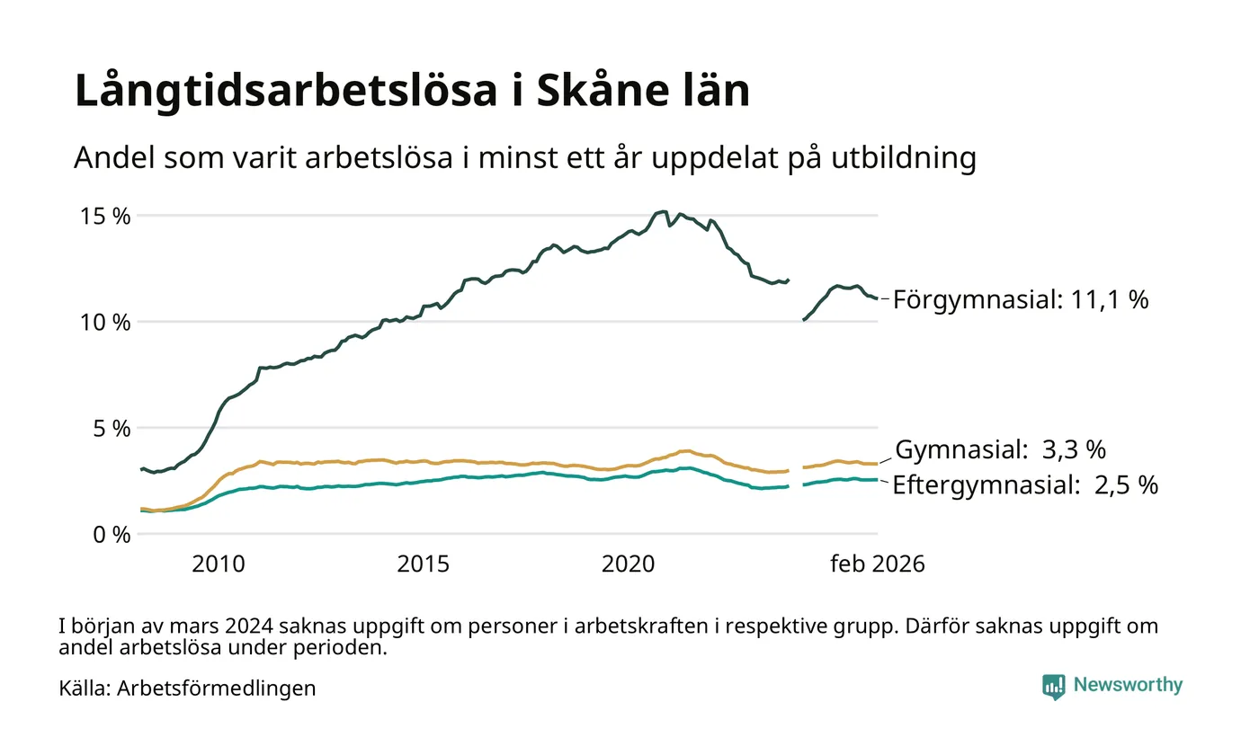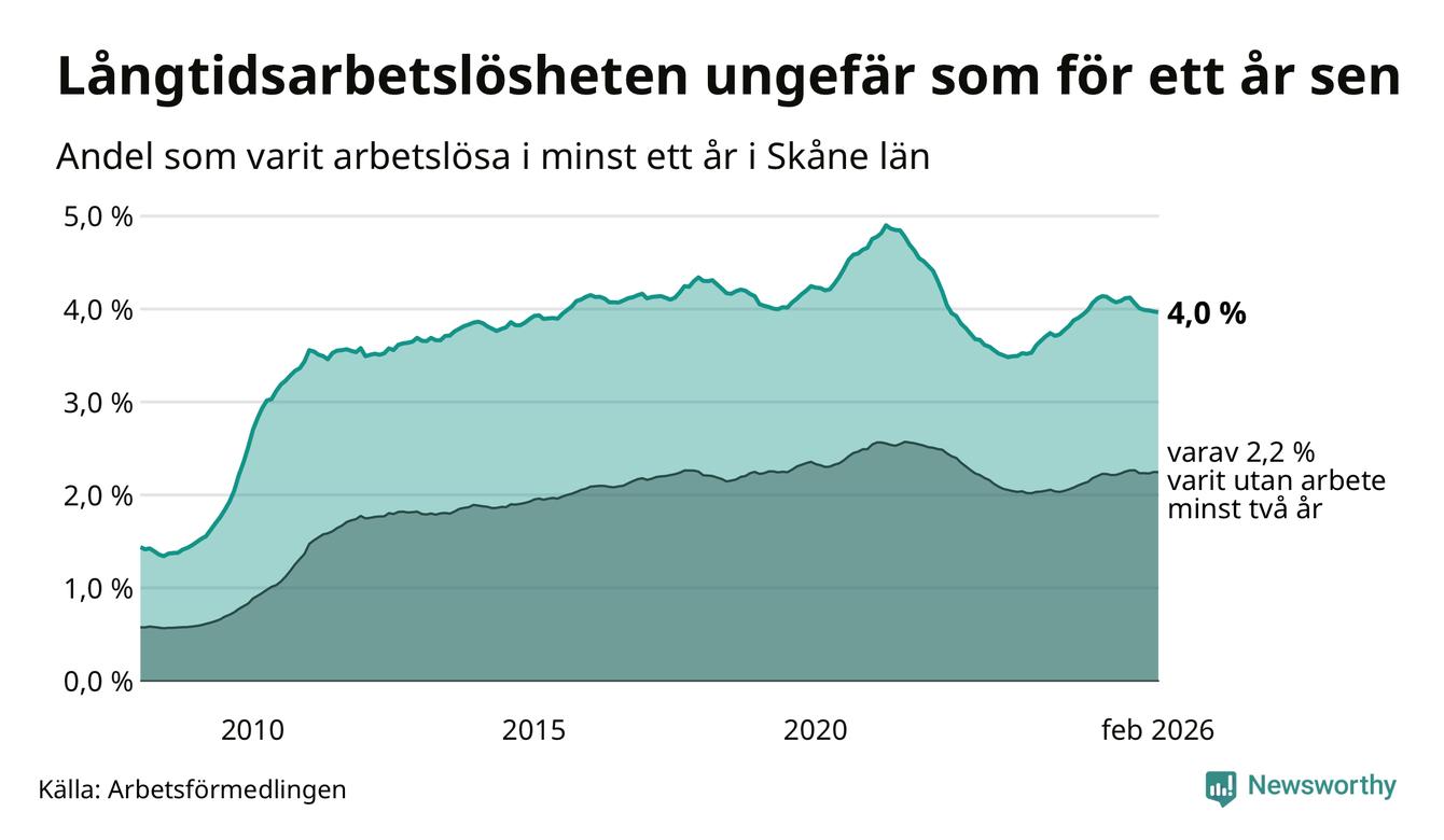Andelen som varit utan arbete i minst ett år i Skåne var ungefär lika stor i februari jämfört med samma månad för ett år sedan. Det visar Arbetsfömedlingens senaste månadsstatistik.