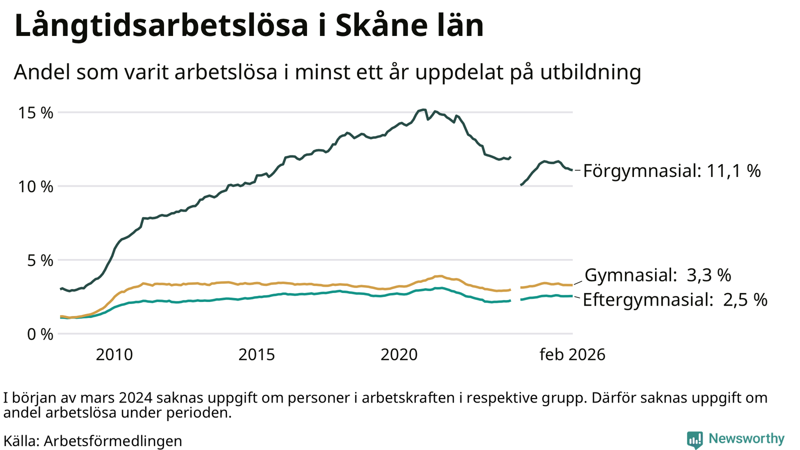 Även när det gäller utbildningsnivå är skillnaderna stora. 10 278 av de som varit arbetslösa i minst ett år har inte någon gymnasieutbildning, vilket motsvarar en långtidsarbetslöhet på 11,1 procent i den gruppen. Det kan jämföras med 3,3 procent bland dem som gått ut gymnasiet och 2,5 procent bland dem som studerat vidare efter gymnasiet.