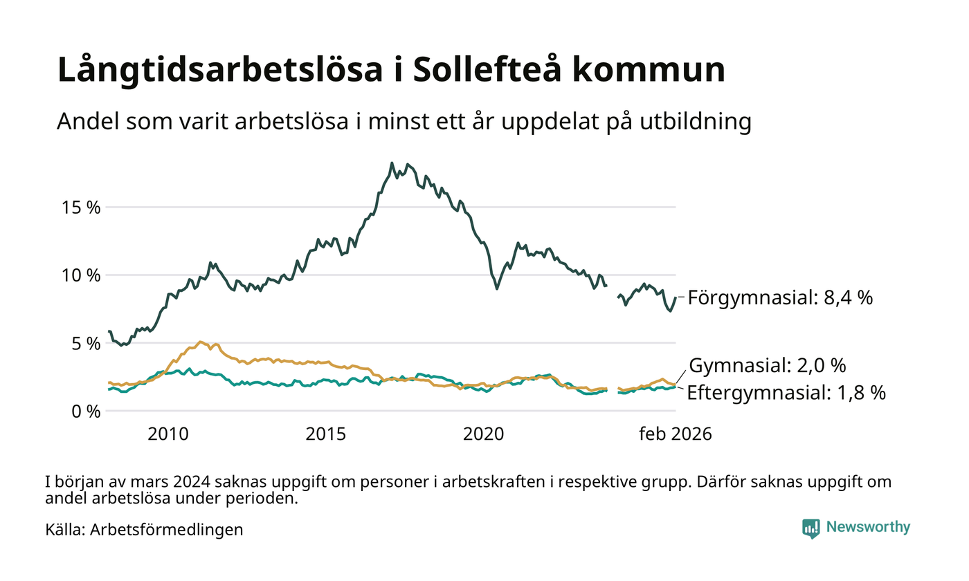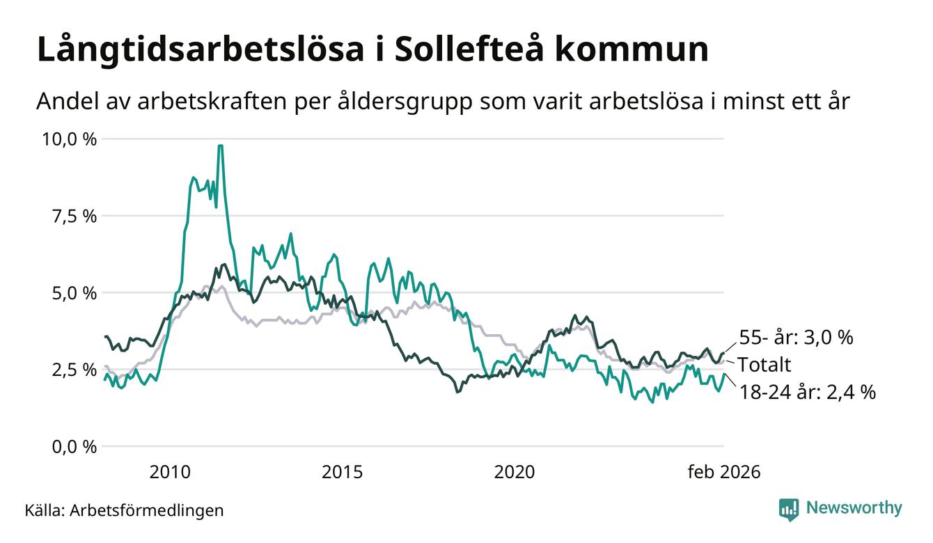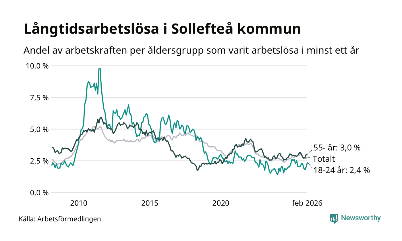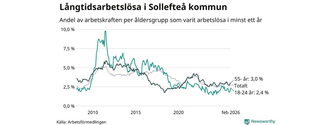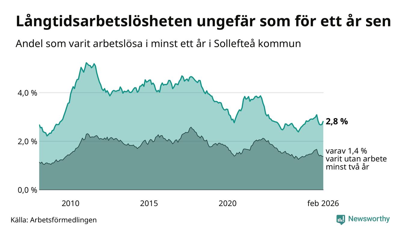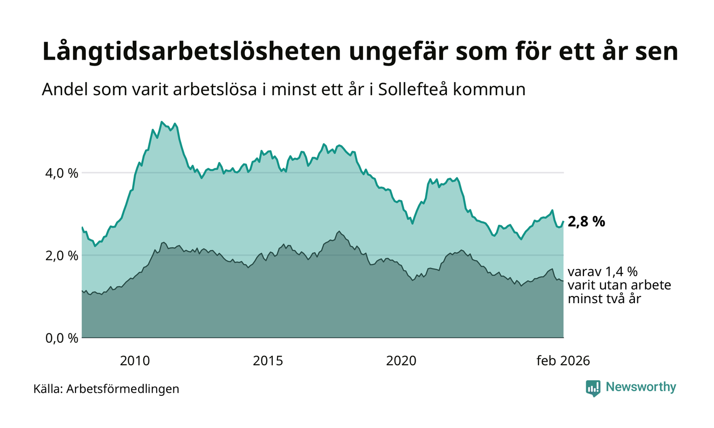 I februari hade 231 Sollefteåbor varit arbetslösa i minst ett år, vilket är elva fler än månaden innan. 231 personer motsvarar 2,8 procent av arbetskraften i kommunen – andelen långtidsarbetslösa är ungefär på samma nivå som för ett år sedan.