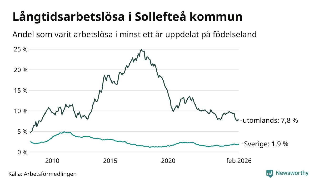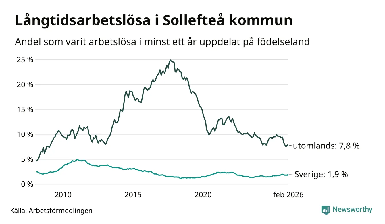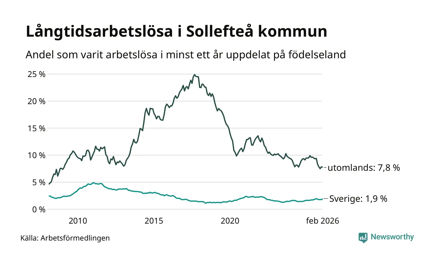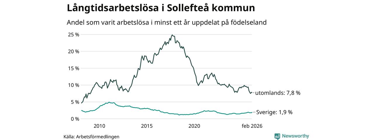 135 av de långtidsarbetslösa i Sollefteå är födda i Sverige, medan 96 är födda utomlands. Det innebär att långtidsarbetslösheten bland Sverigefödda är 1,9 procent, medan den är fyra gånger så hög – 7,8 procent – bland födda utomlands. Även i riket som helhet är arbetslösheten högre bland utrikesfödda.