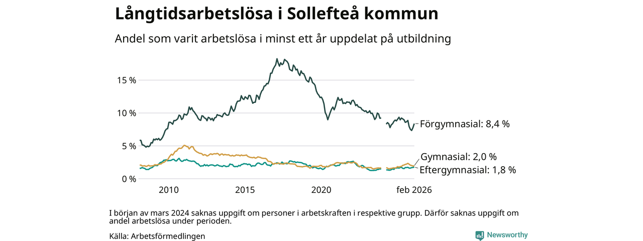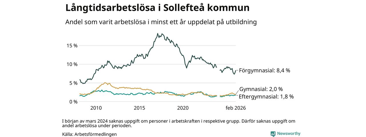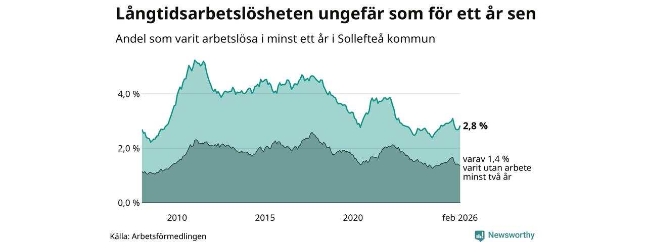 Andelen som varit utan arbete i minst ett år i Sollefteå var ungefär lika stor i februari jämfört med samma månad för ett år sedan. Det visar Arbetsfömedlingens senaste månadsstatistik.