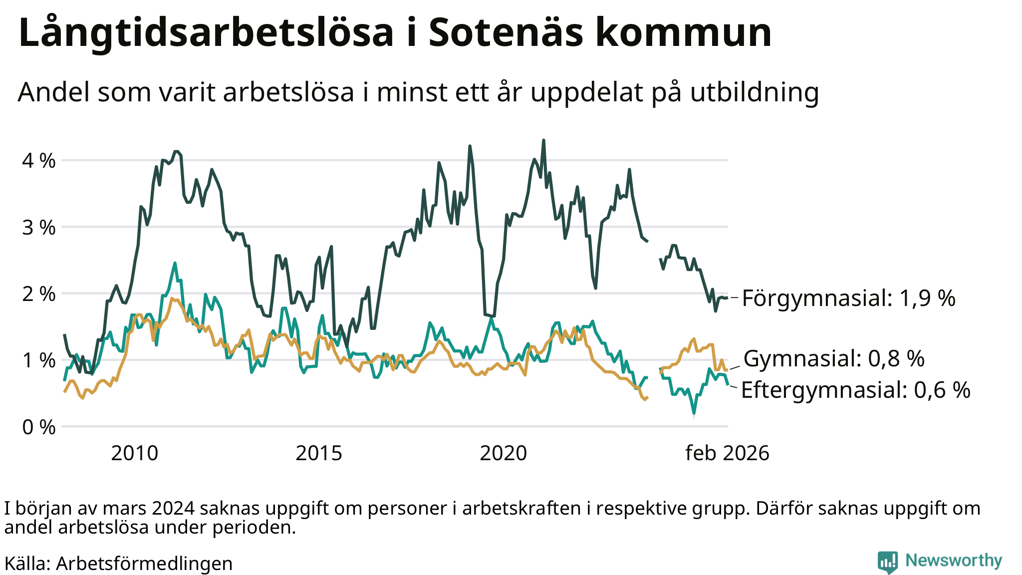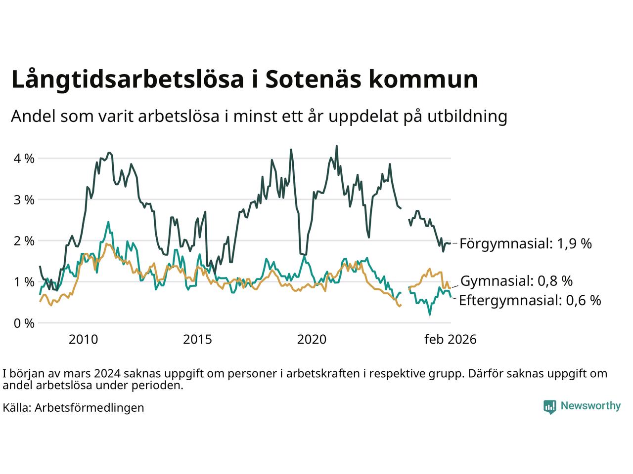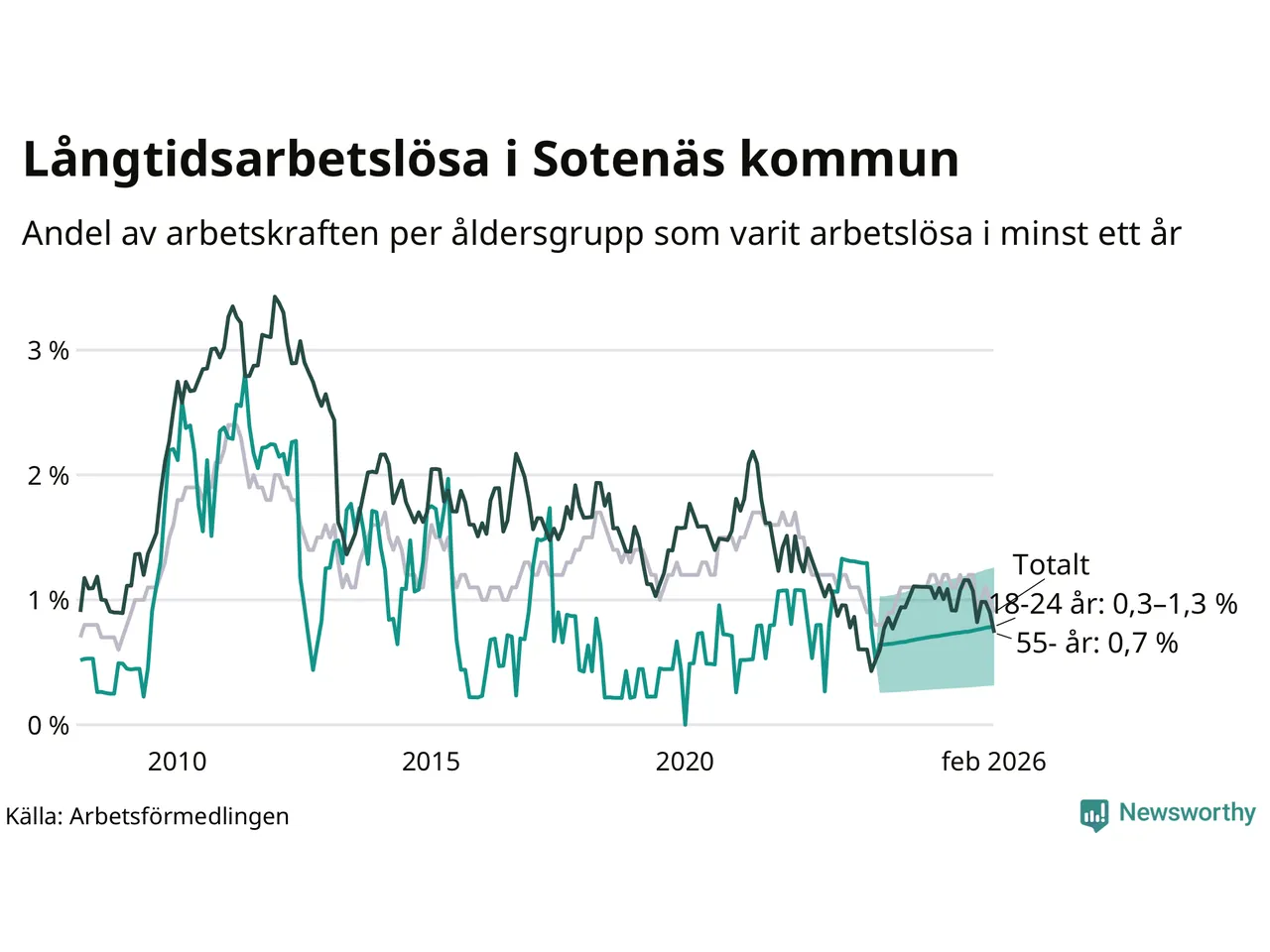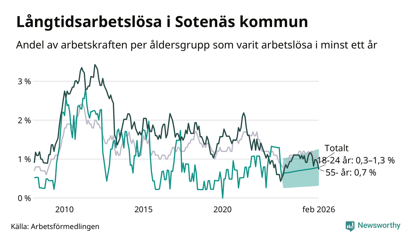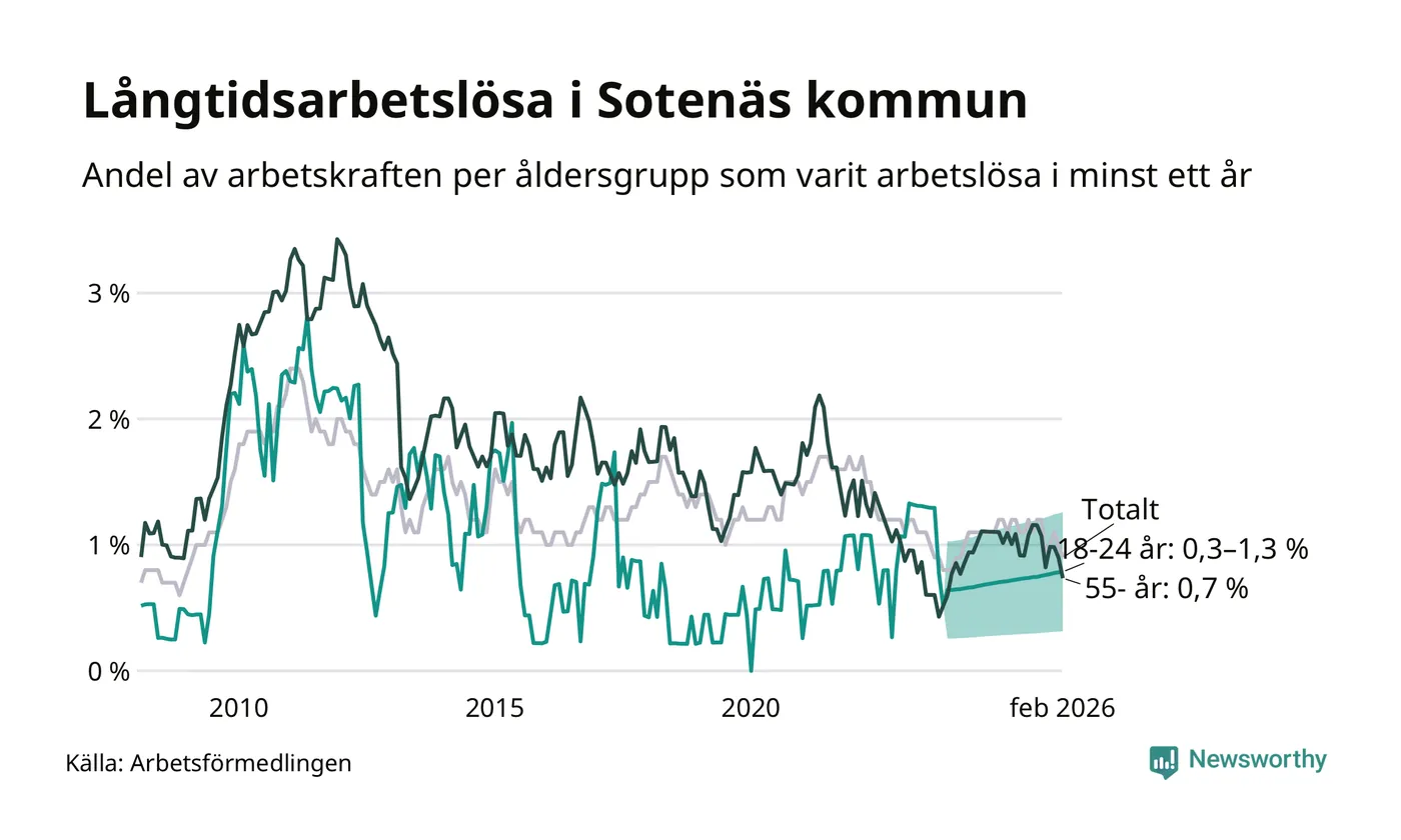 | Andel arbetslösa i minst två år | 0,5 % | 1,3 % | 1,6 % |