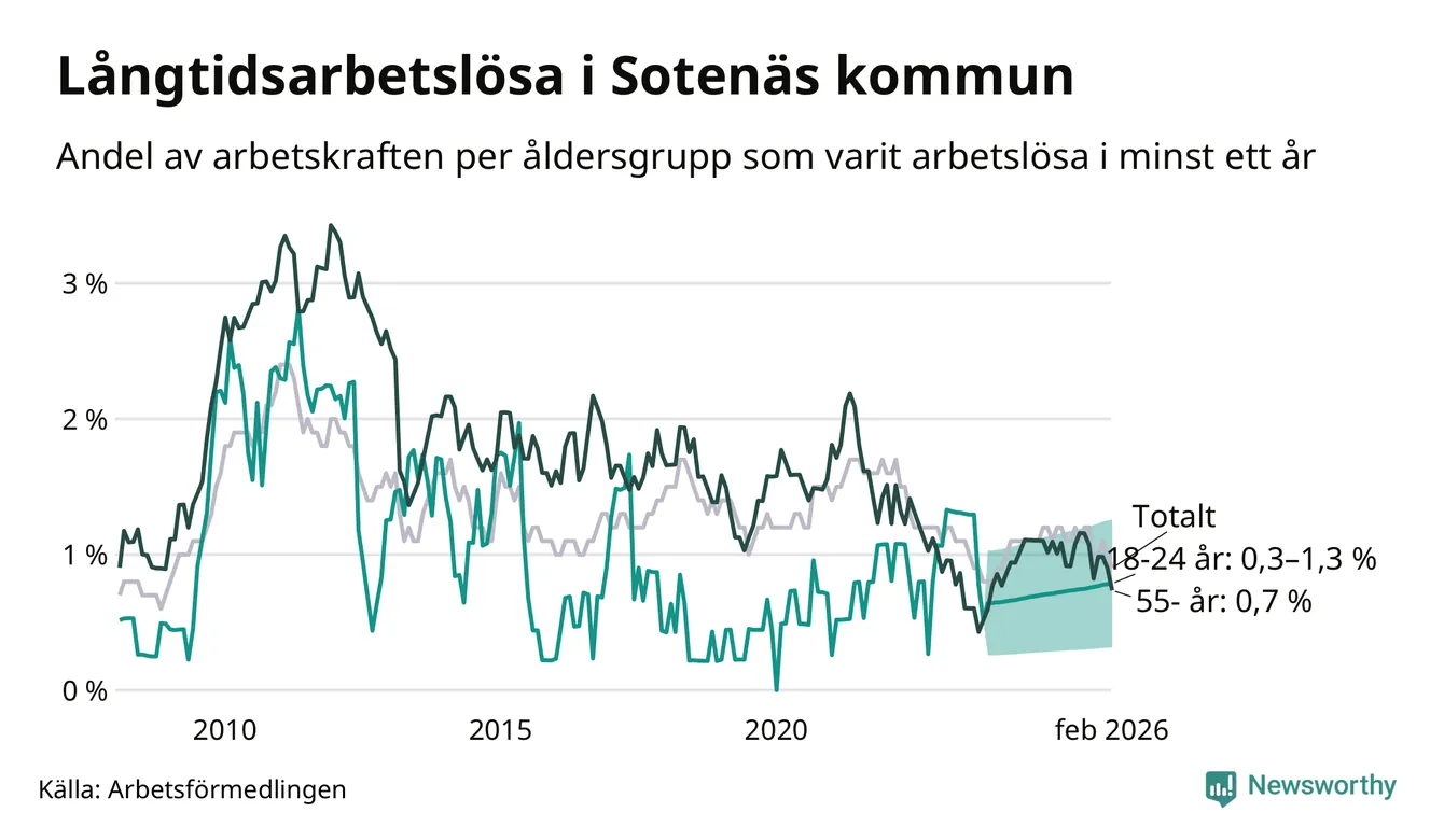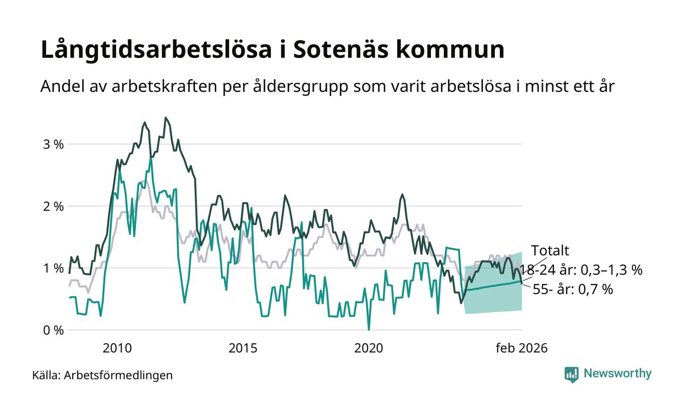 Av de 37 personerna som varit arbetslösa i mer än ett år i Sotenäs kommun är nio personer mellan 55 och 661 år och mellan en och fyra är mellan 18 och 24 år. Som andel av arbetskraften innebär det att långtidsarbetslöheten är lägre i de båda grupperna än i arbetskraften totalt. I riket som helhet är andelen långtidsarbetslösa högre i den äldre gruppen.