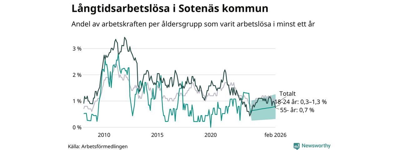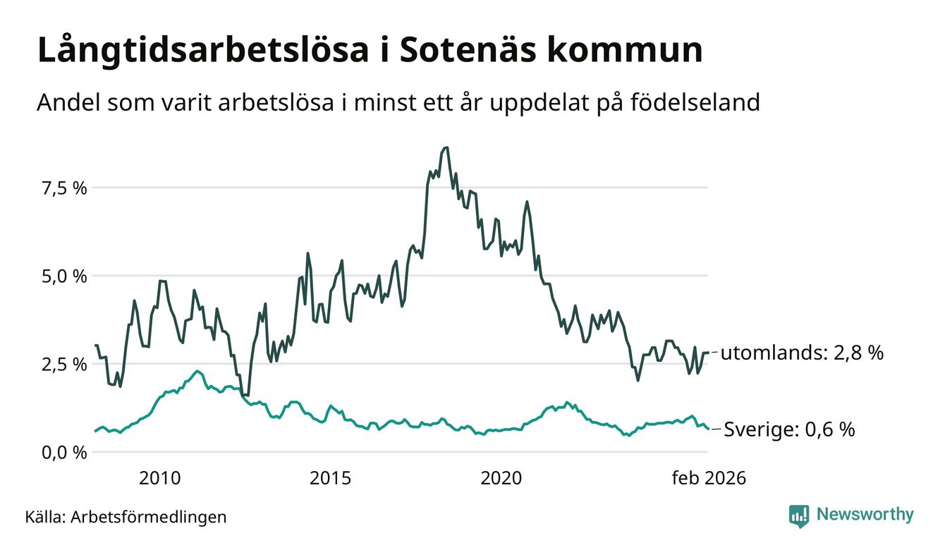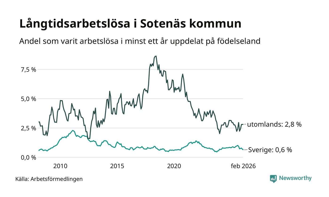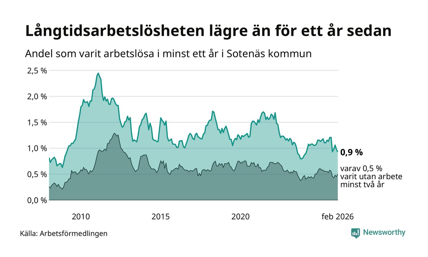 I februari hade 37 Sotenäsbor varit arbetslösa i minst ett år, vilket är två färre än månaden innan. 37 personer motsvarar 0,9 procent av arbetskraften i kommunen – andelen långtidsarbetslösa är 0,3 procentenheter lägre än samma månad för ett år sedan. Sotenäs tillhör de kommuner som har lägst andel långtidsarbetslösa i hela landet just nu.