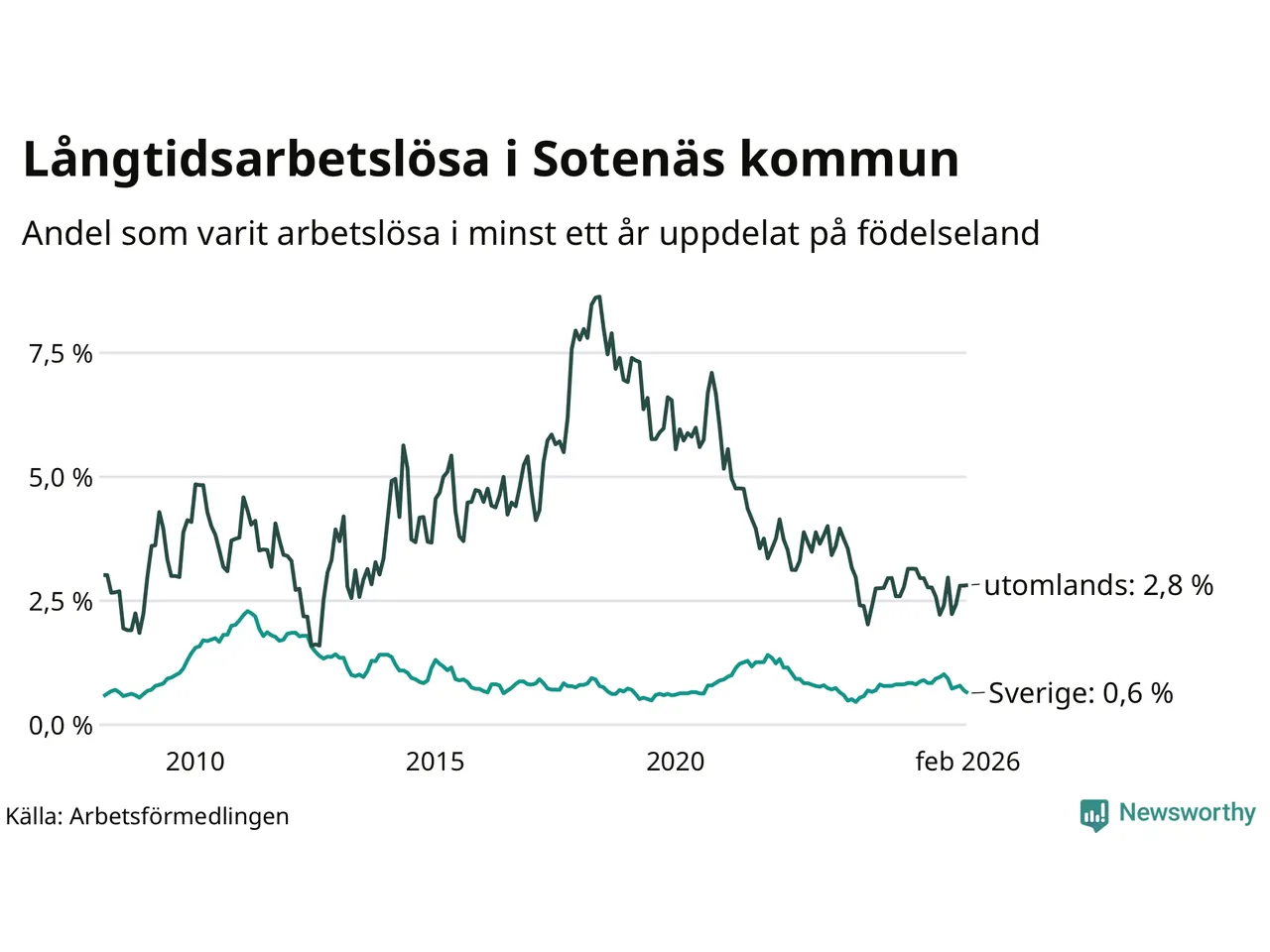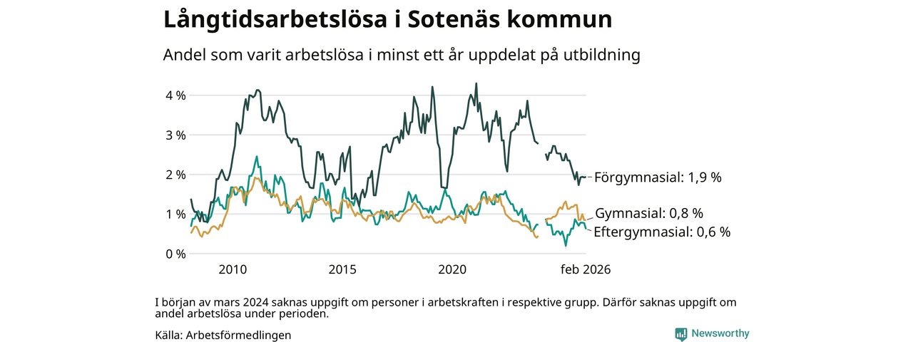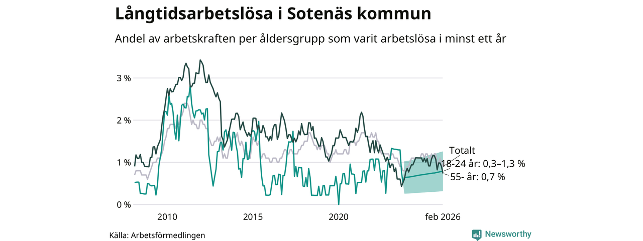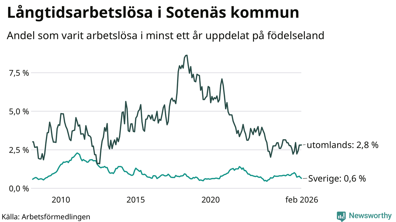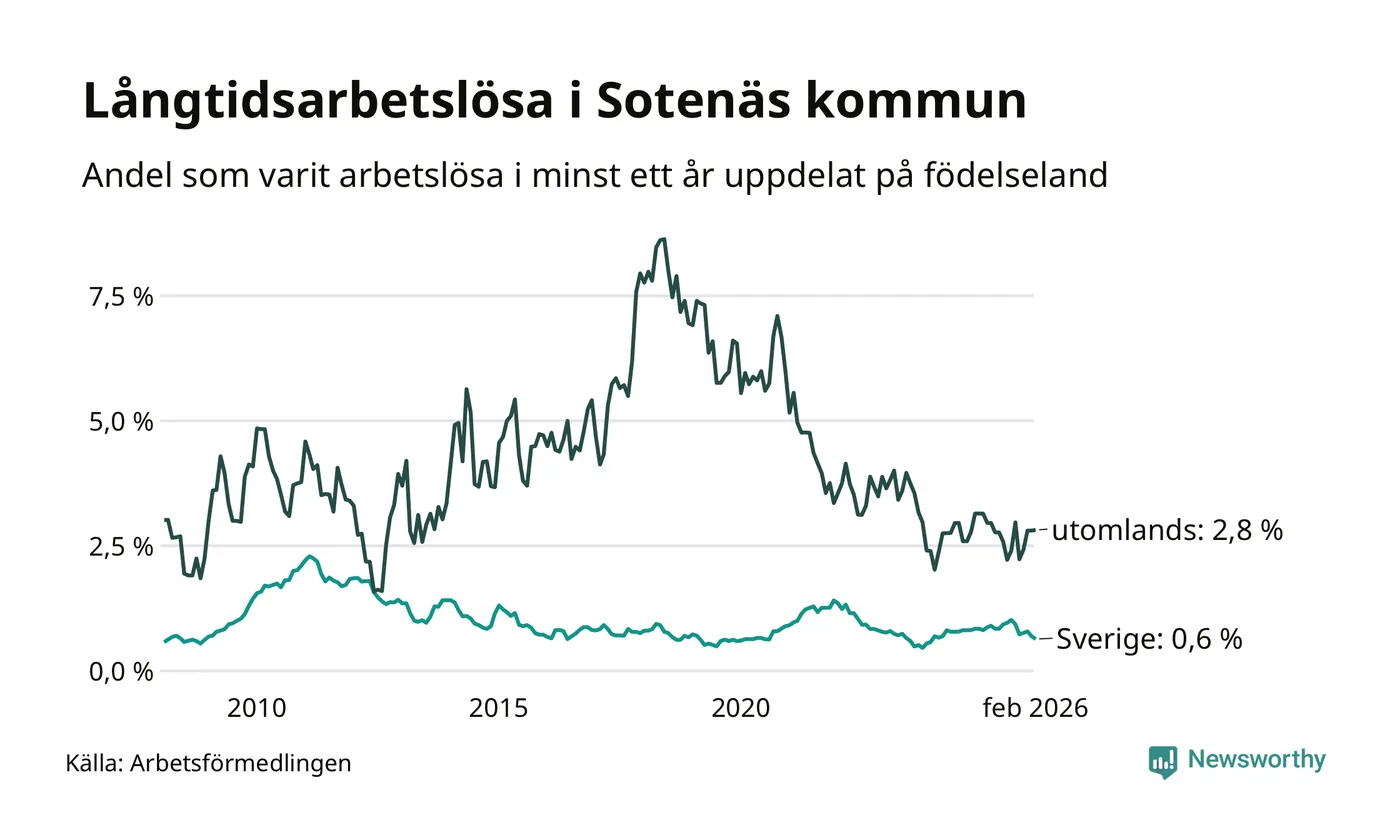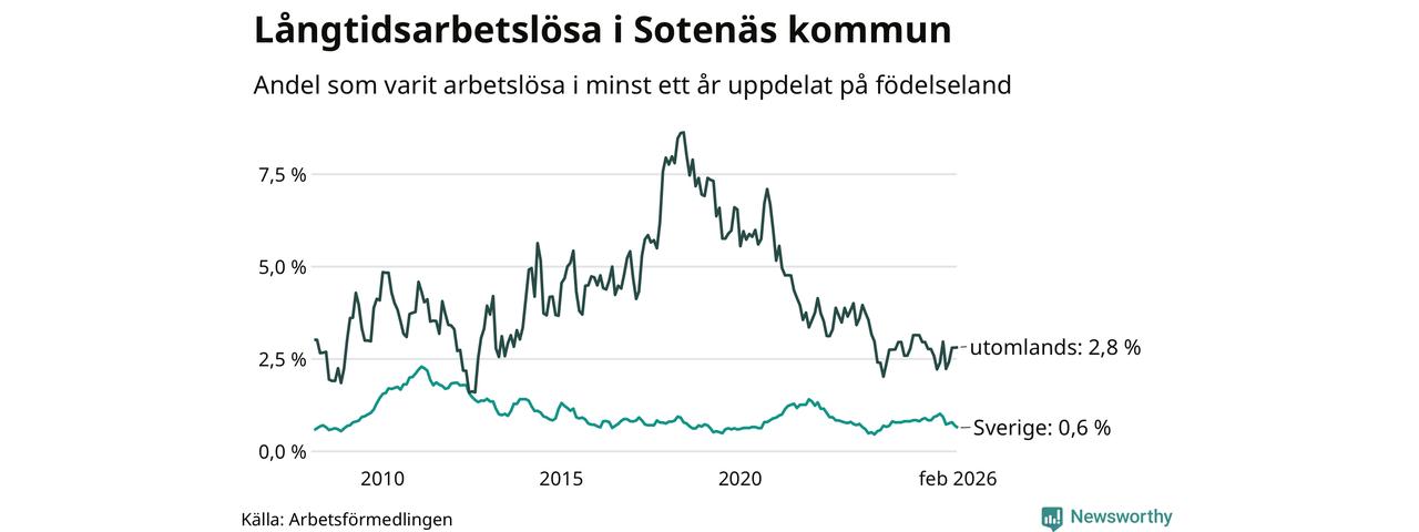 Andelen långtidsarbetslösa i Sotenäs är den lägsta i Västra Götalands län. I Gullspång finns länets högsta långtidsarbetslöshet, 4,4 procent. I Västra Götaland som helhet hade 22 944 personer (2,5 procent) varit arbetslösa i minst ett år i februari. Det är 39 personer fler än månaden innan.