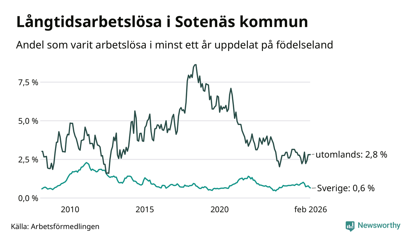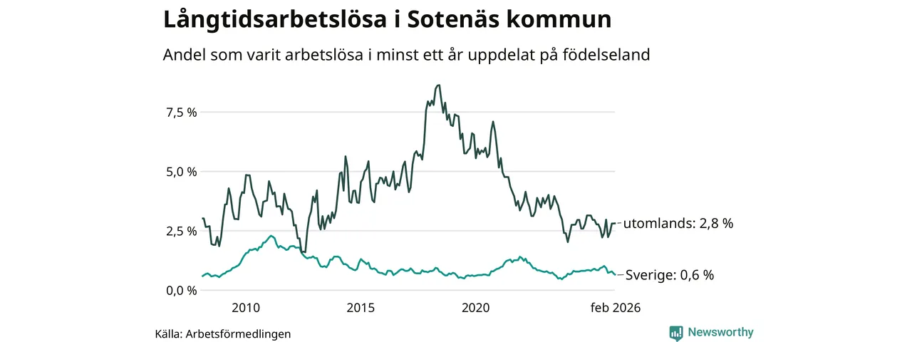 22 av de långtidsarbetslösa i Sotenäs är födda i Sverige, medan 15 är födda utomlands. Det innebär att långtidsarbetslösheten bland Sverigefödda är 0,6 procent, medan den är fem gånger så hög – 2,8 procent – bland födda utomlands. Även i riket som helhet är arbetslösheten högre bland utrikesfödda.