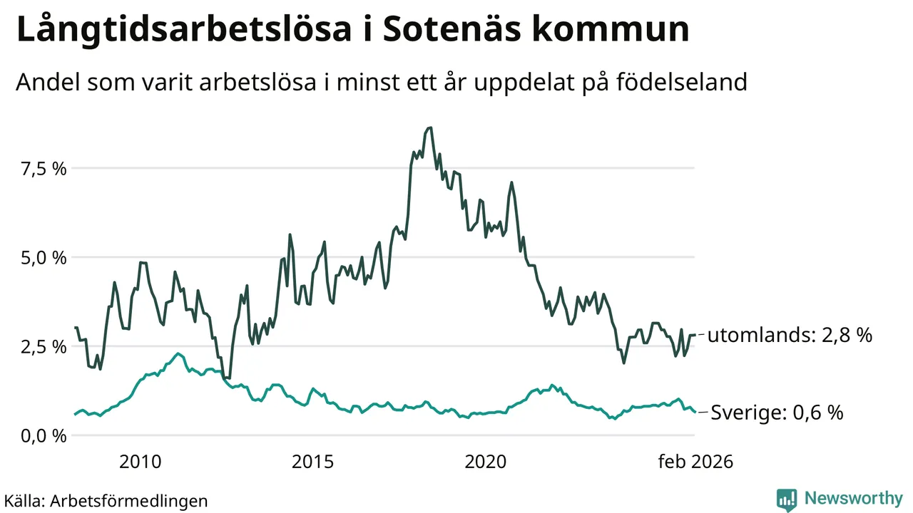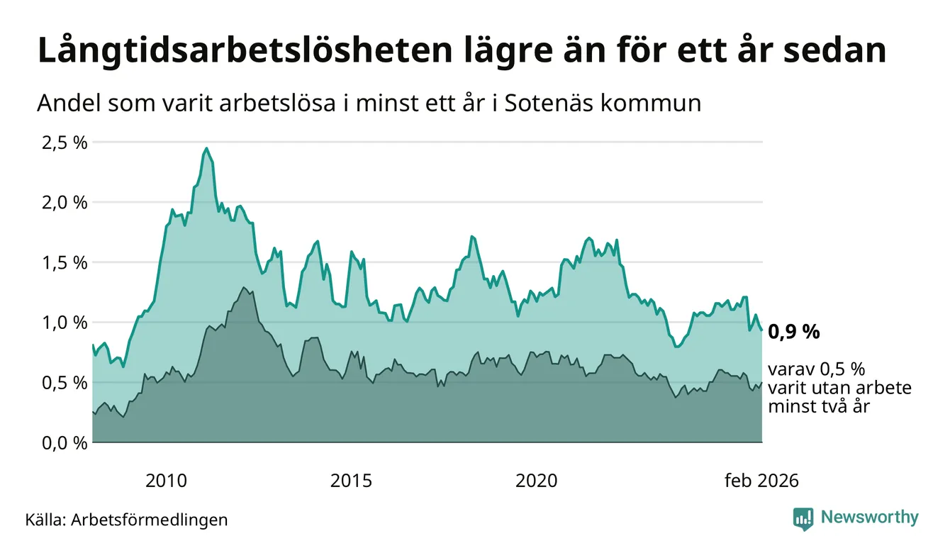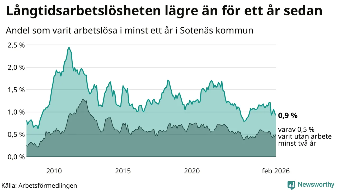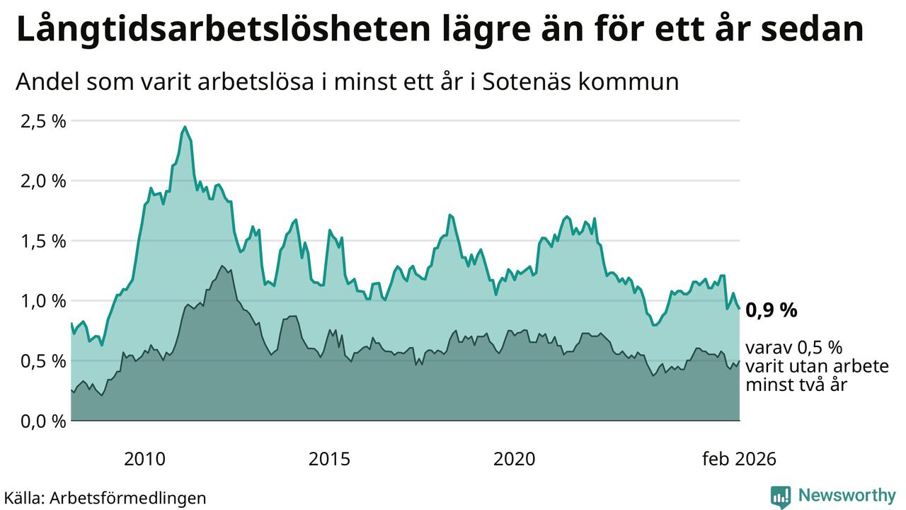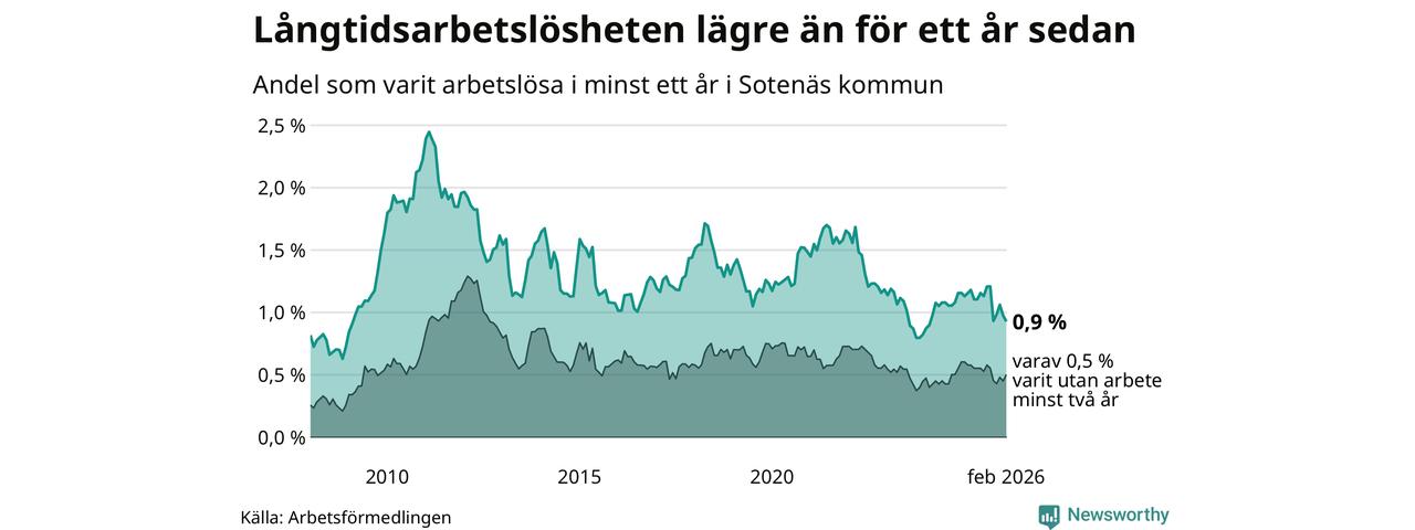 Andelen som varit utan arbete i minst ett år i Sotenäs var lägre i februari jämfört med samma månad för ett år sedan. Det visar Arbetsfömedlingens senaste månadsstatistik.
