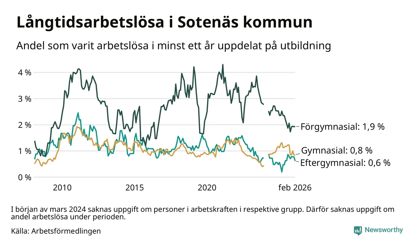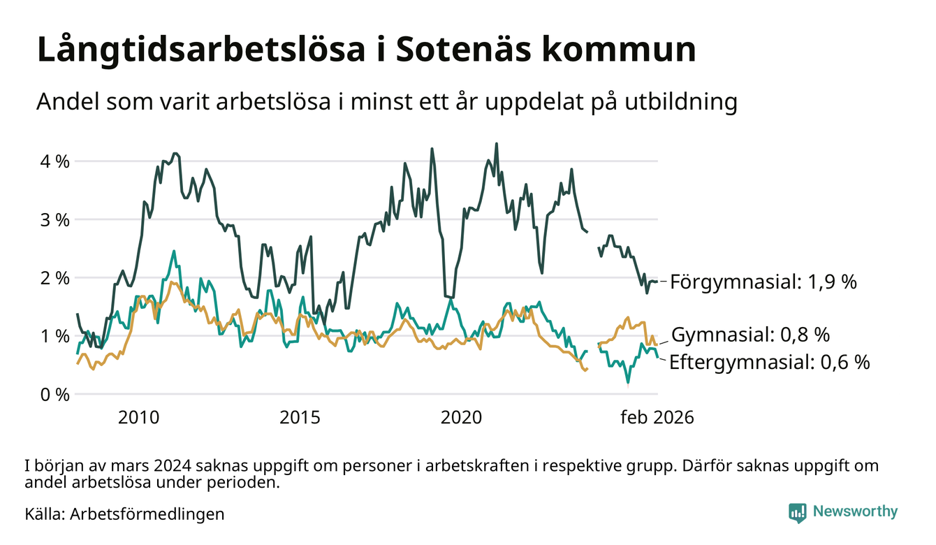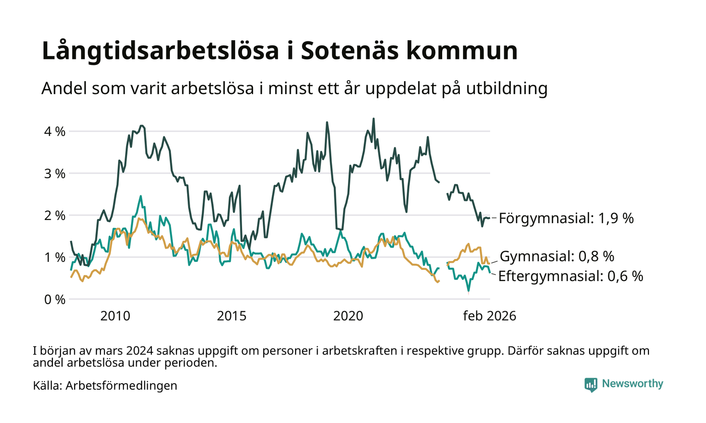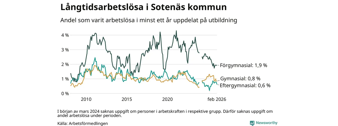 Andelen som varit utan arbete i minst ett år i Sotenäs var lägre i februari jämfört med samma månad för ett år sedan. Det visar Arbetsfömedlingens senaste månadsstatistik.