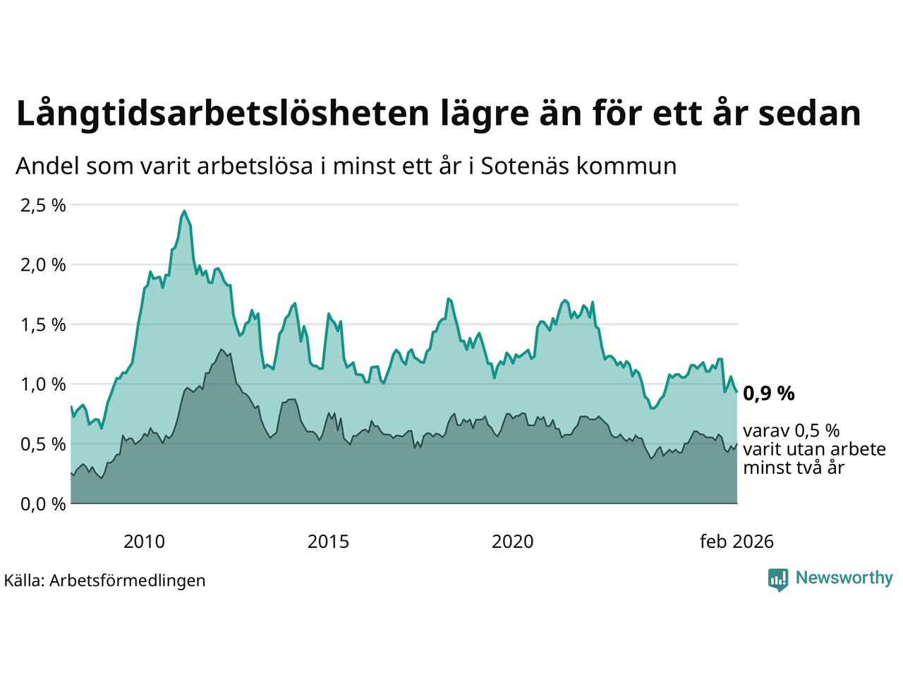 | Andel arbetslösa i minst ett år | 0,9 % | 2,5 % | 2,9 % |