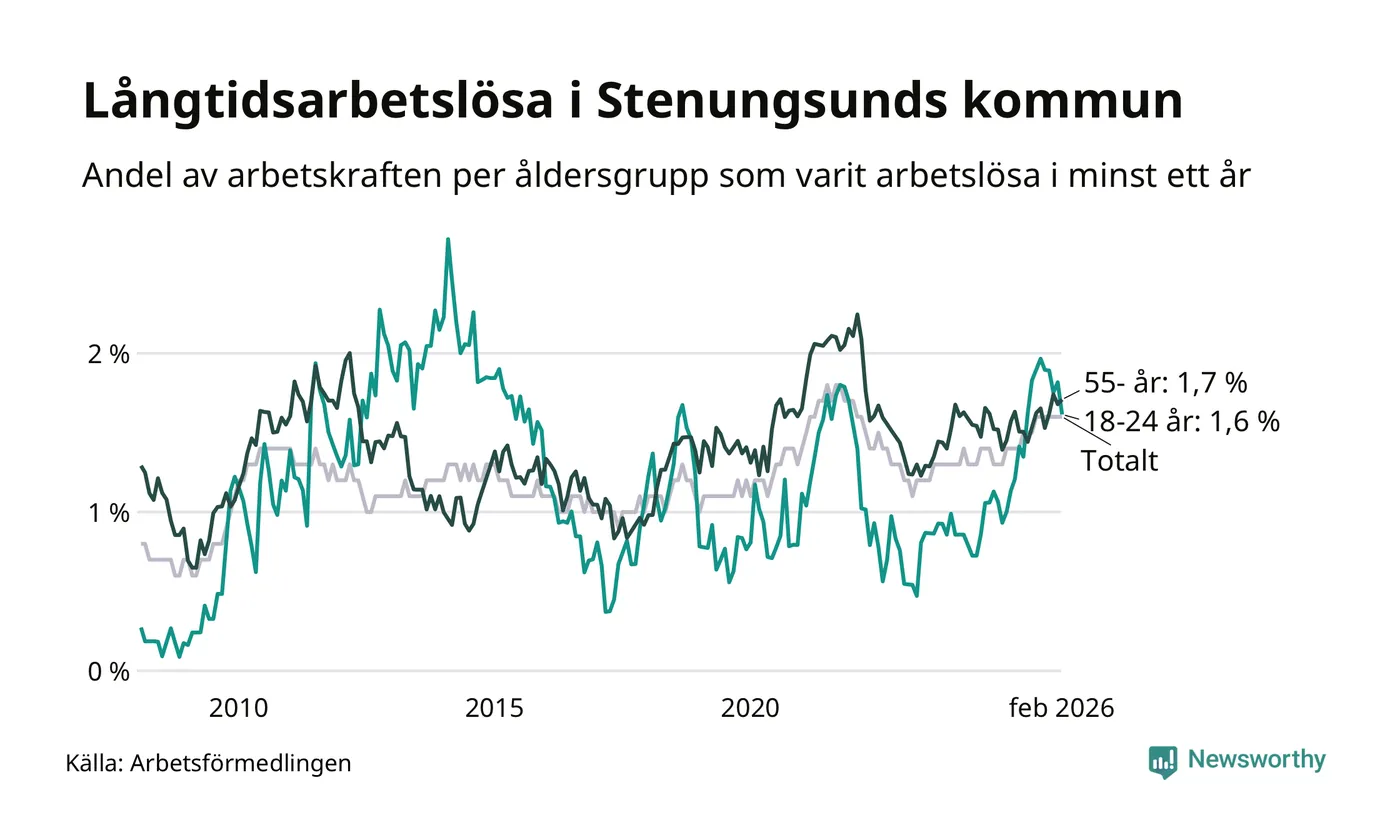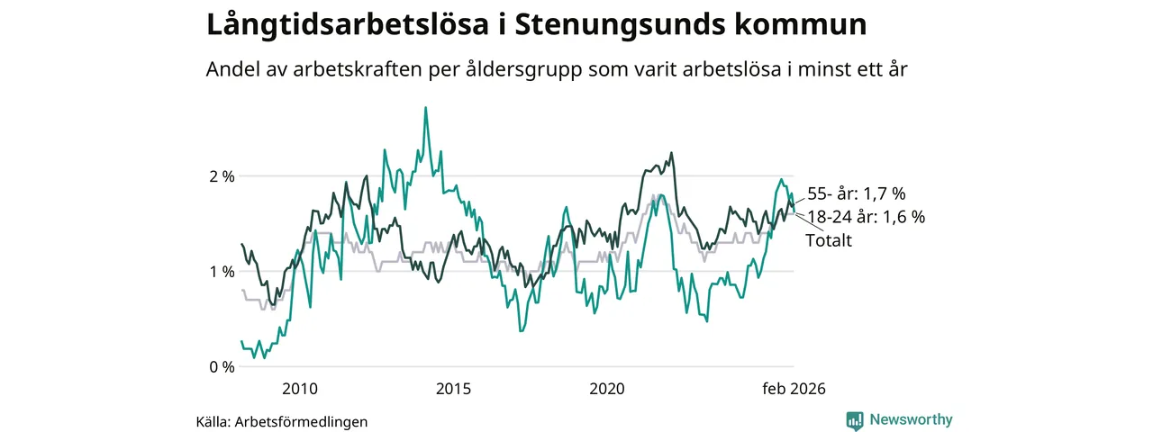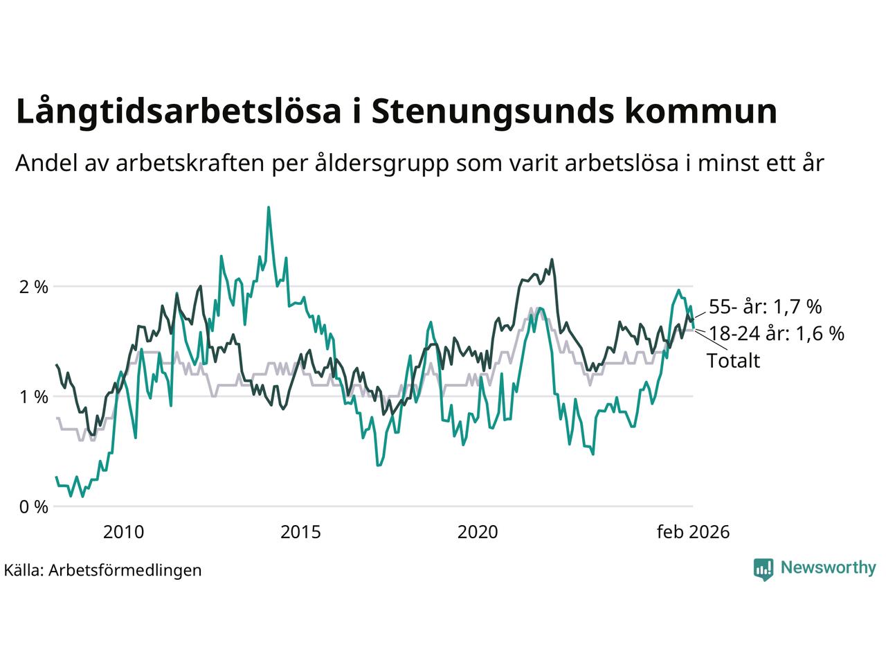 Av de 225 personerna som varit arbetslösa i mer än ett år i Stenungsunds kommun är 56 personer mellan 55 och 661 år och 24 är mellan 18 och 24 år. För den äldre gruppen är andelen arbetslösa 1,7 procent medan den i den yngre gruppen är 1,6 procent. Även i riket som helhet är långtidsarbetslösheten högre i gruppen äldre.