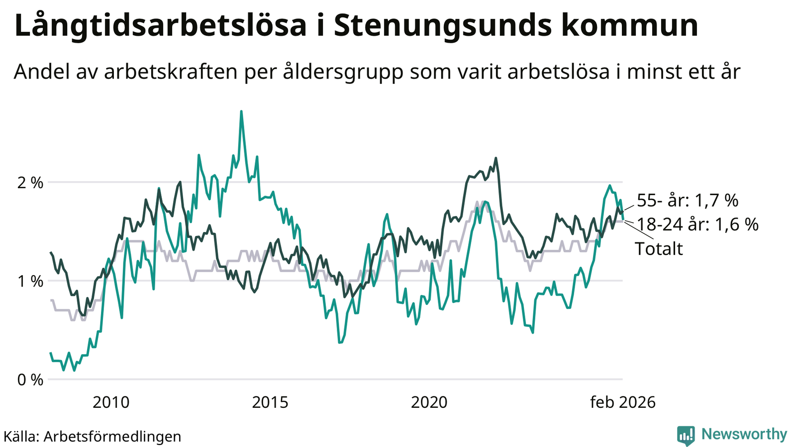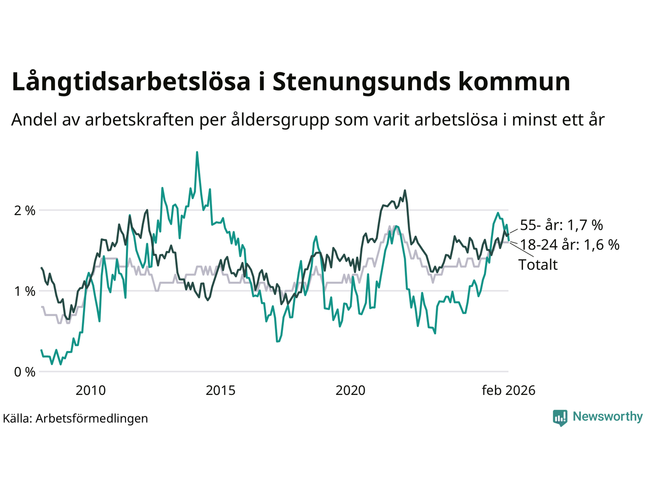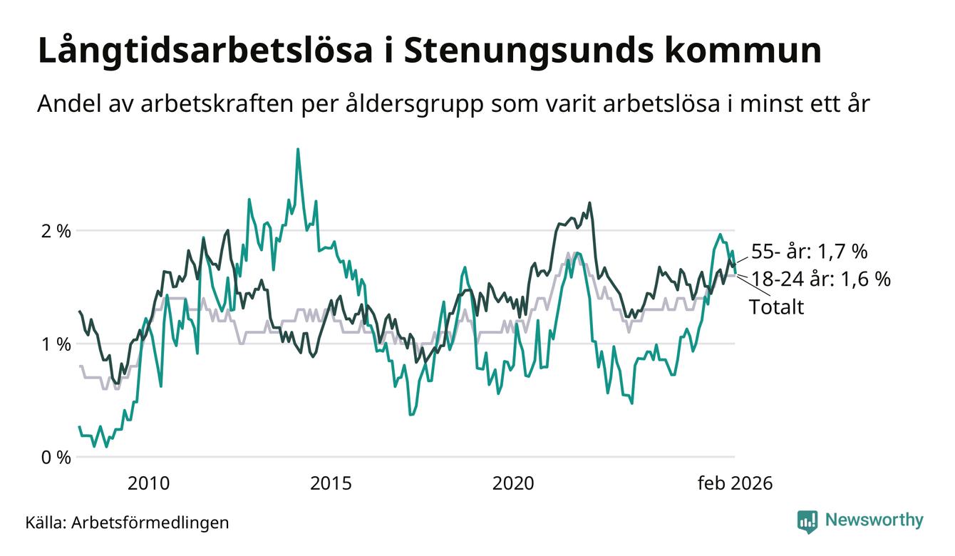 Av de 225 personerna som varit arbetslösa i mer än ett år i Stenungsunds kommun är 56 personer mellan 55 och 661 år och 24 är mellan 18 och 24 år. För den äldre gruppen är andelen arbetslösa 1,7 procent medan den i den yngre gruppen är 1,6 procent. Även i riket som helhet är långtidsarbetslösheten högre i gruppen äldre.