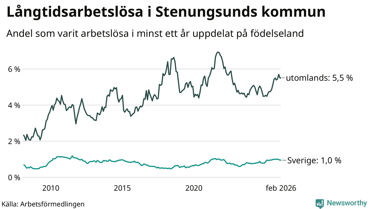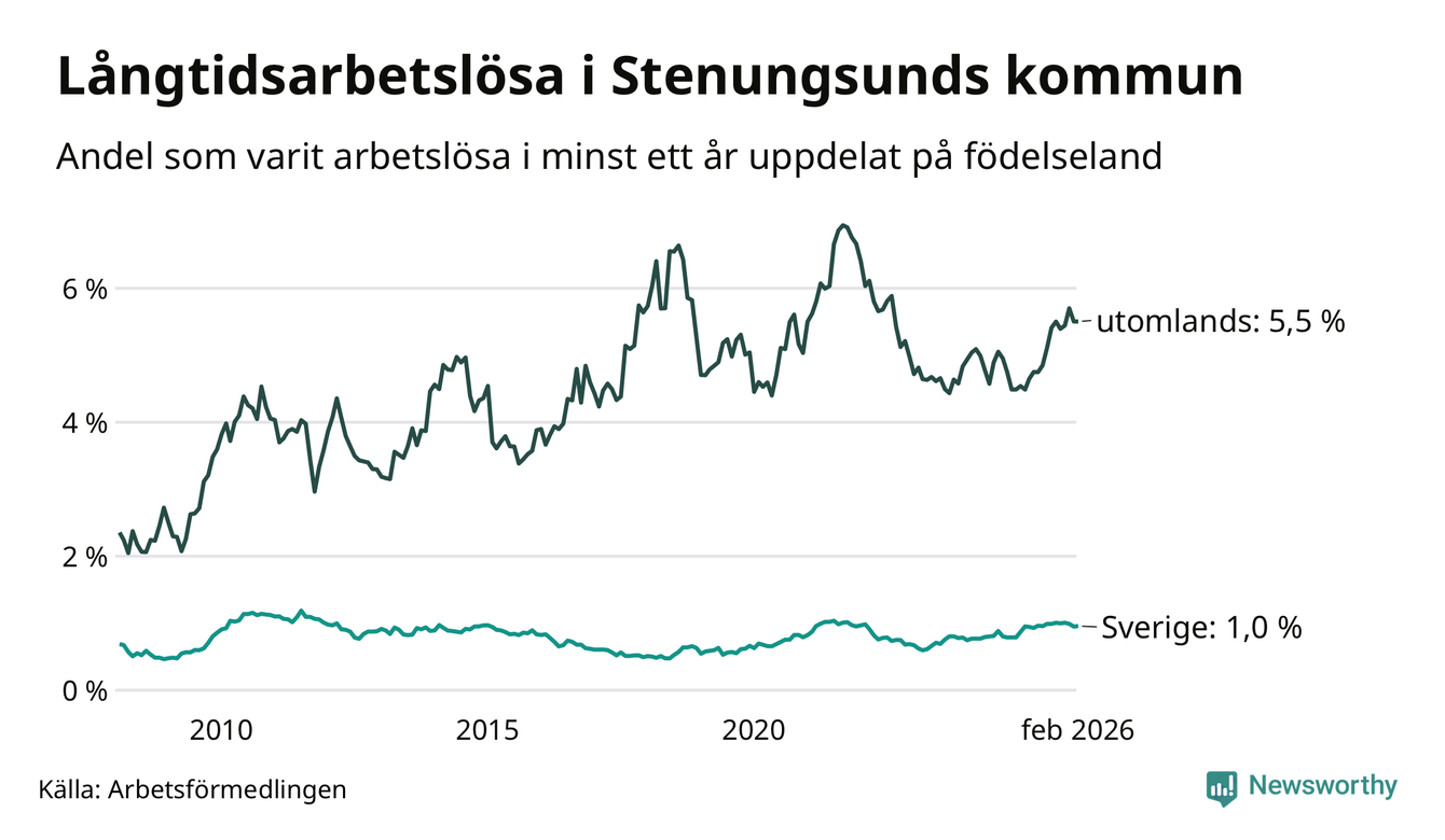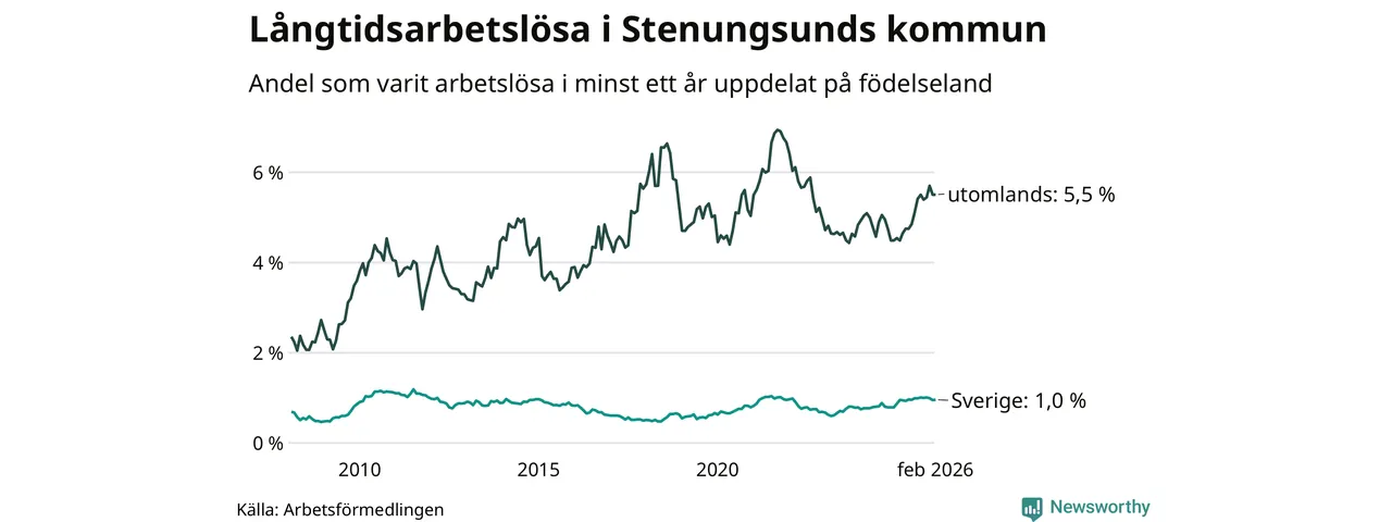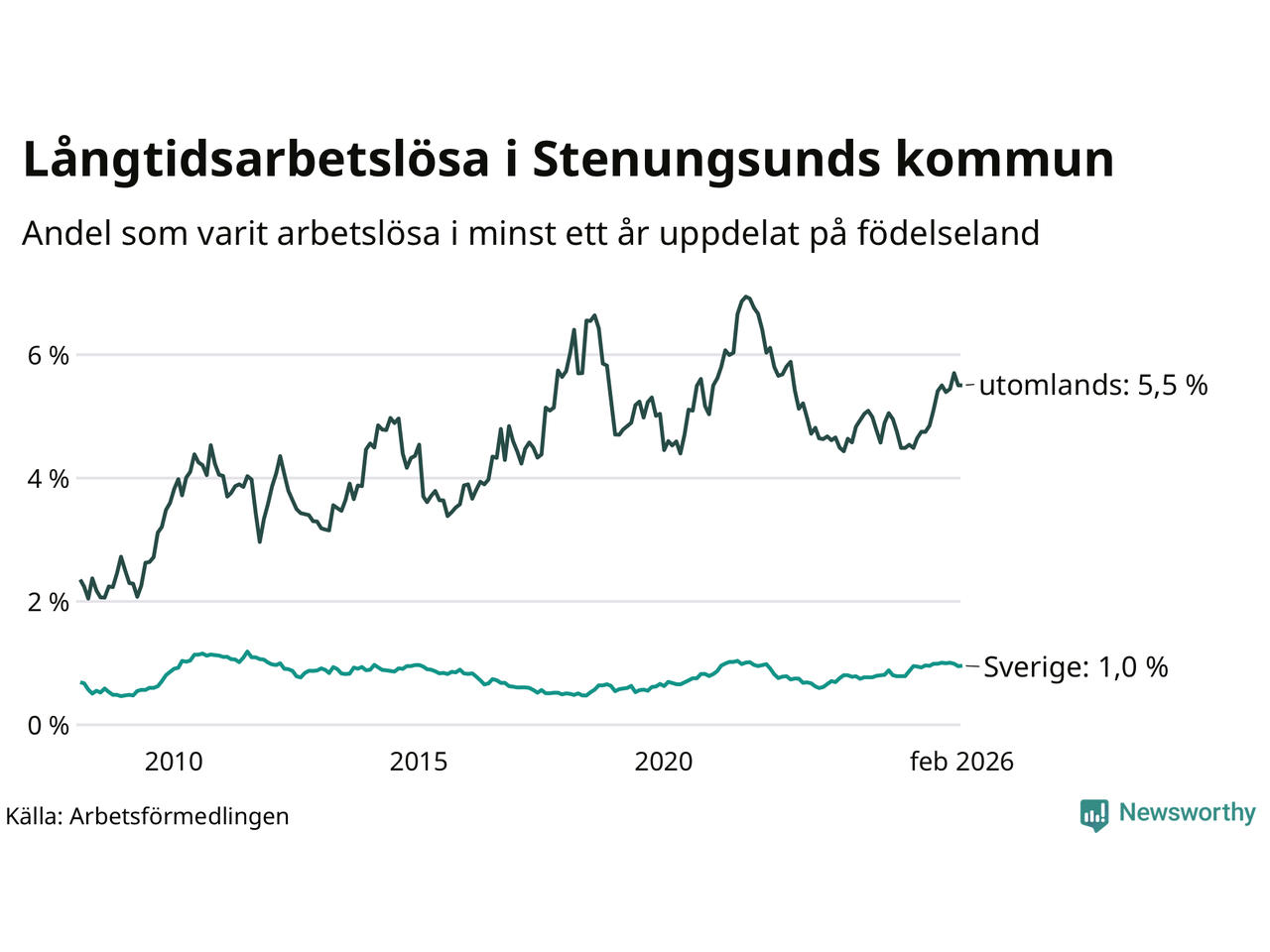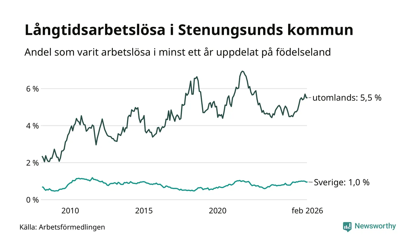 118 av de långtidsarbetslösa i Stenungsund är födda i Sverige, medan 107 är födda utomlands. Det innebär att långtidsarbetslösheten bland Sverigefödda är 1,0 procent, medan den är sex gånger så hög – 5,5 procent – bland födda utomlands. Även i riket som helhet är arbetslösheten högre bland utrikesfödda.