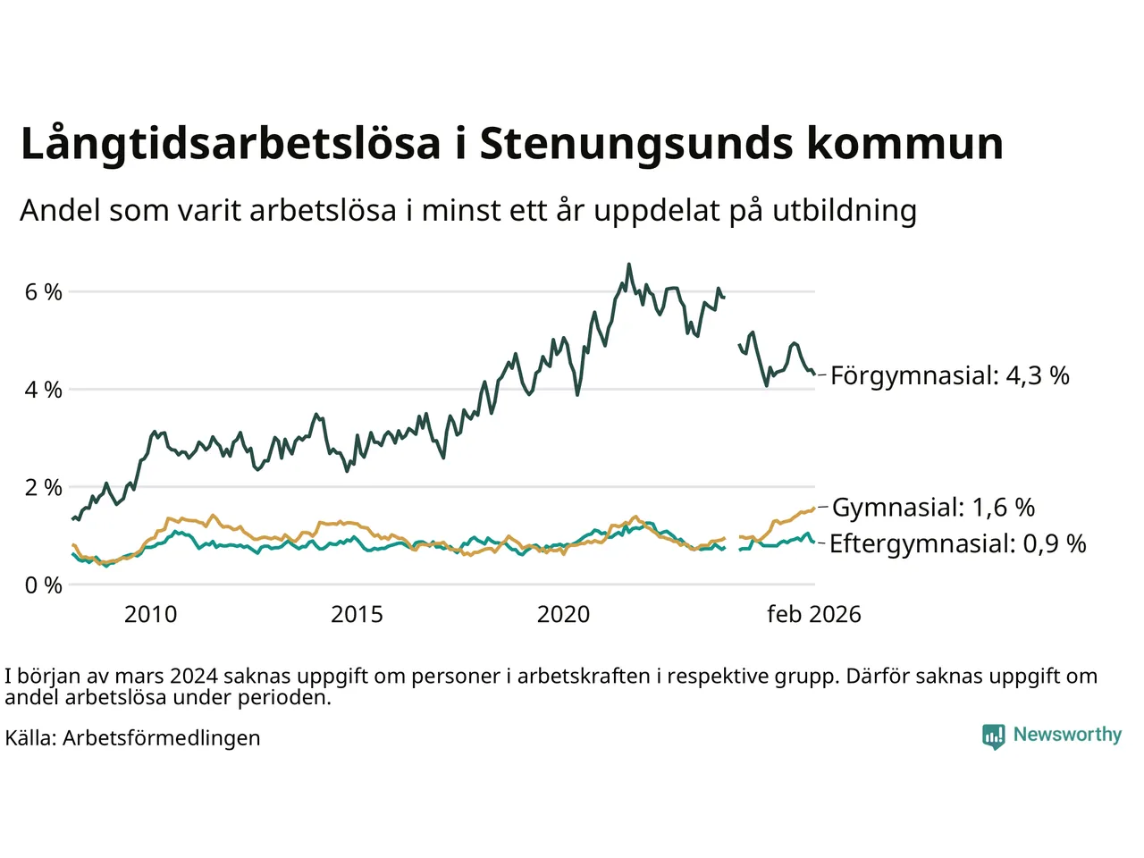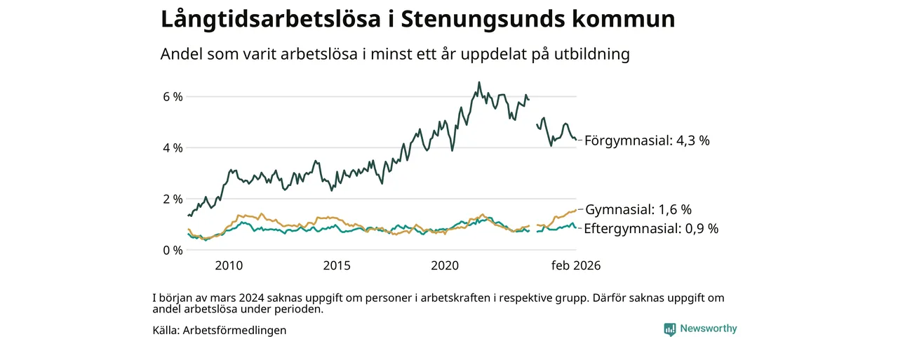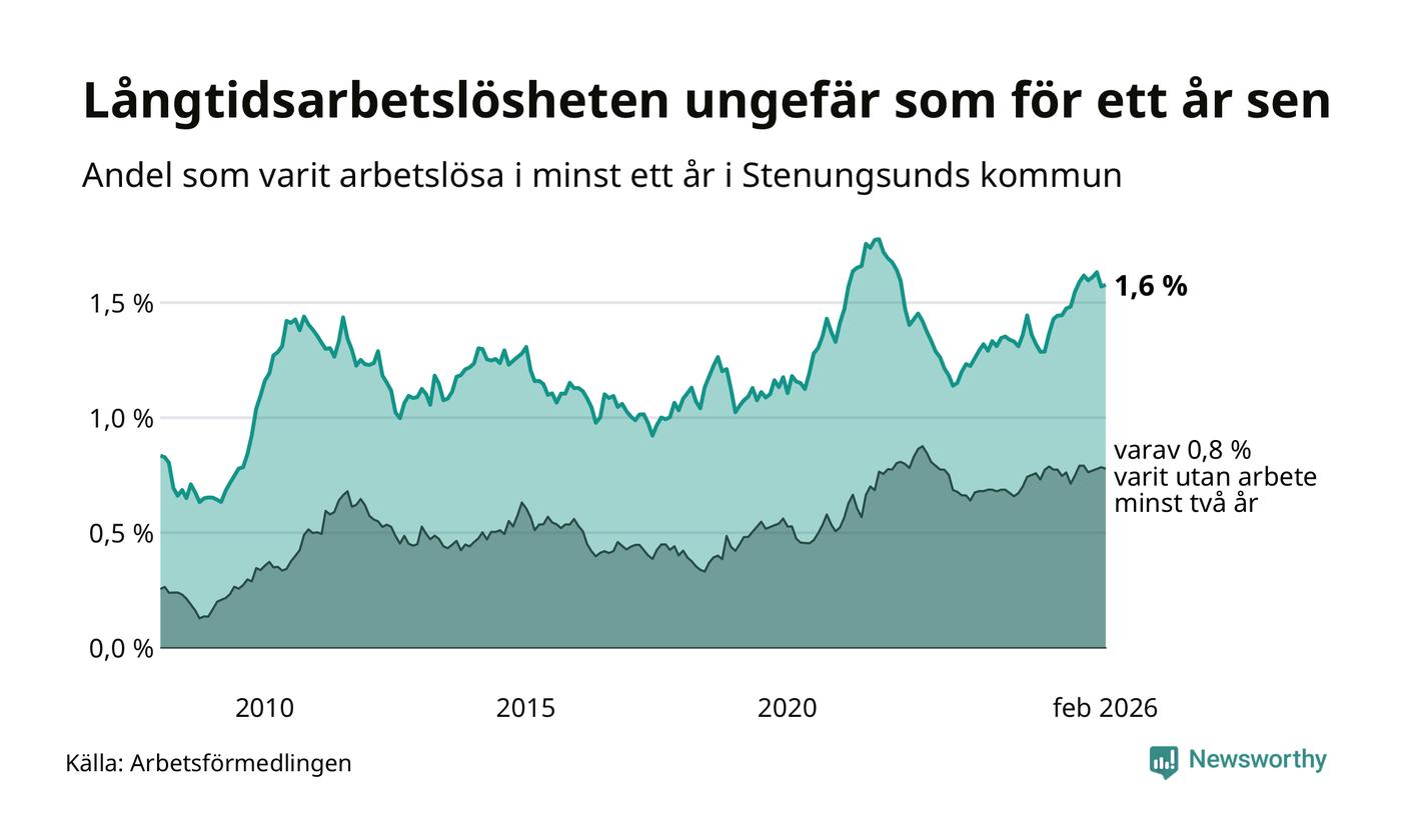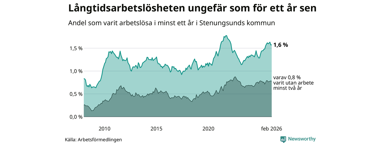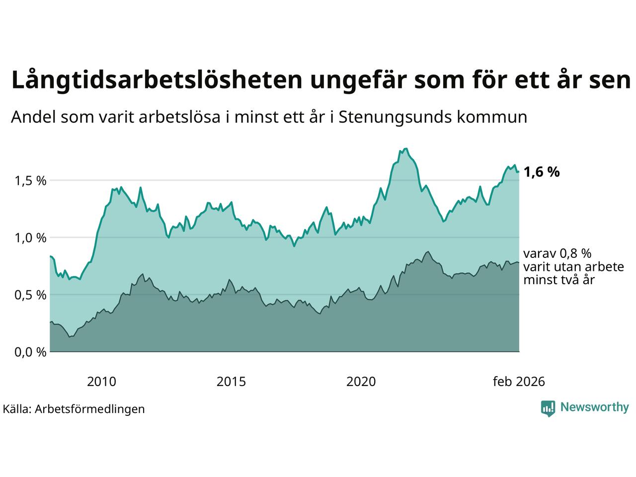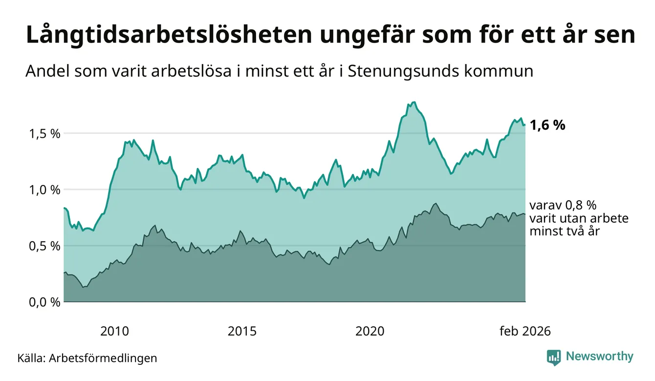 Andelen som varit utan arbete i minst ett år i Stenungsund var ungefär lika stor i februari jämfört med samma månad för ett år sedan. Det visar Arbetsfömedlingens senaste månadsstatistik.