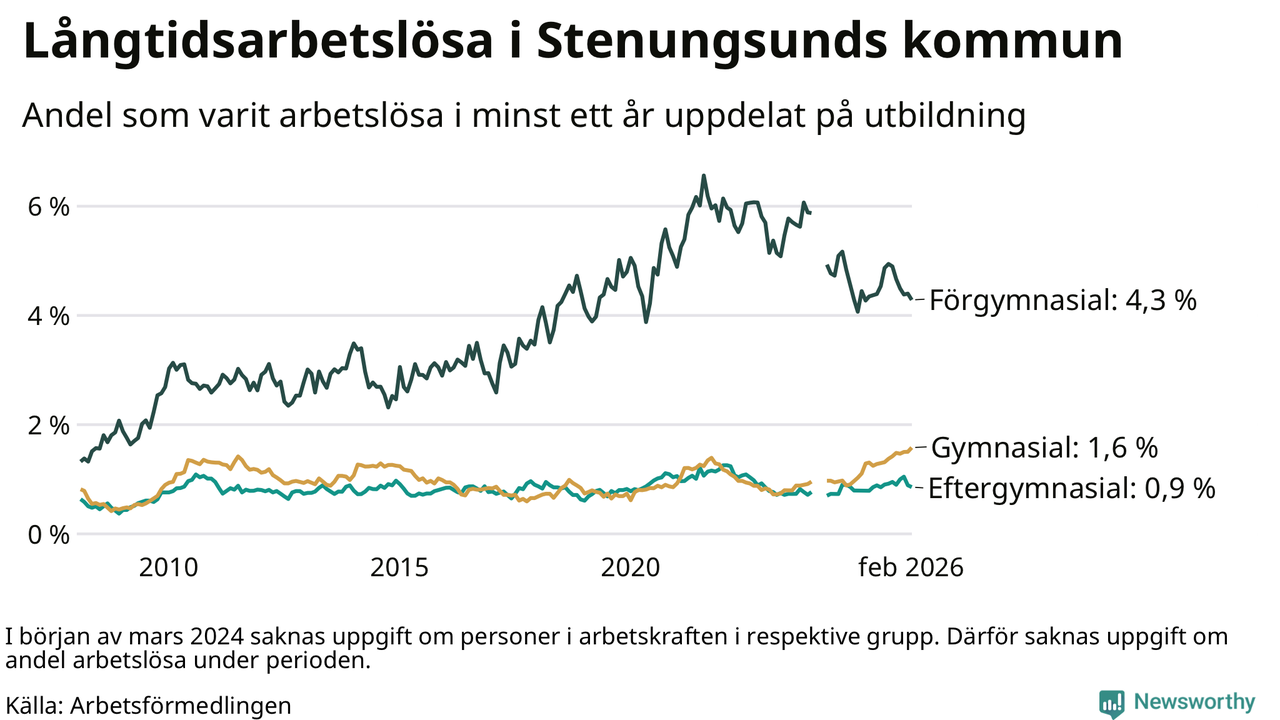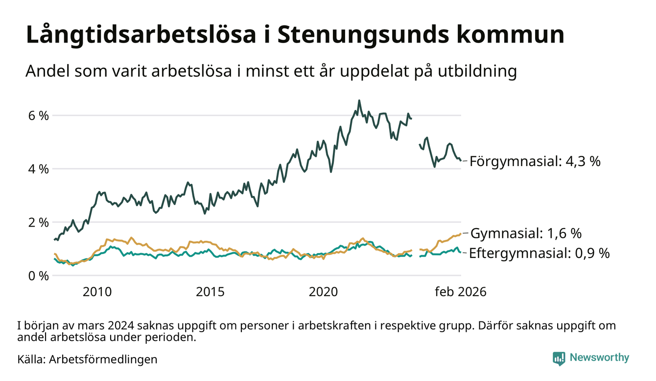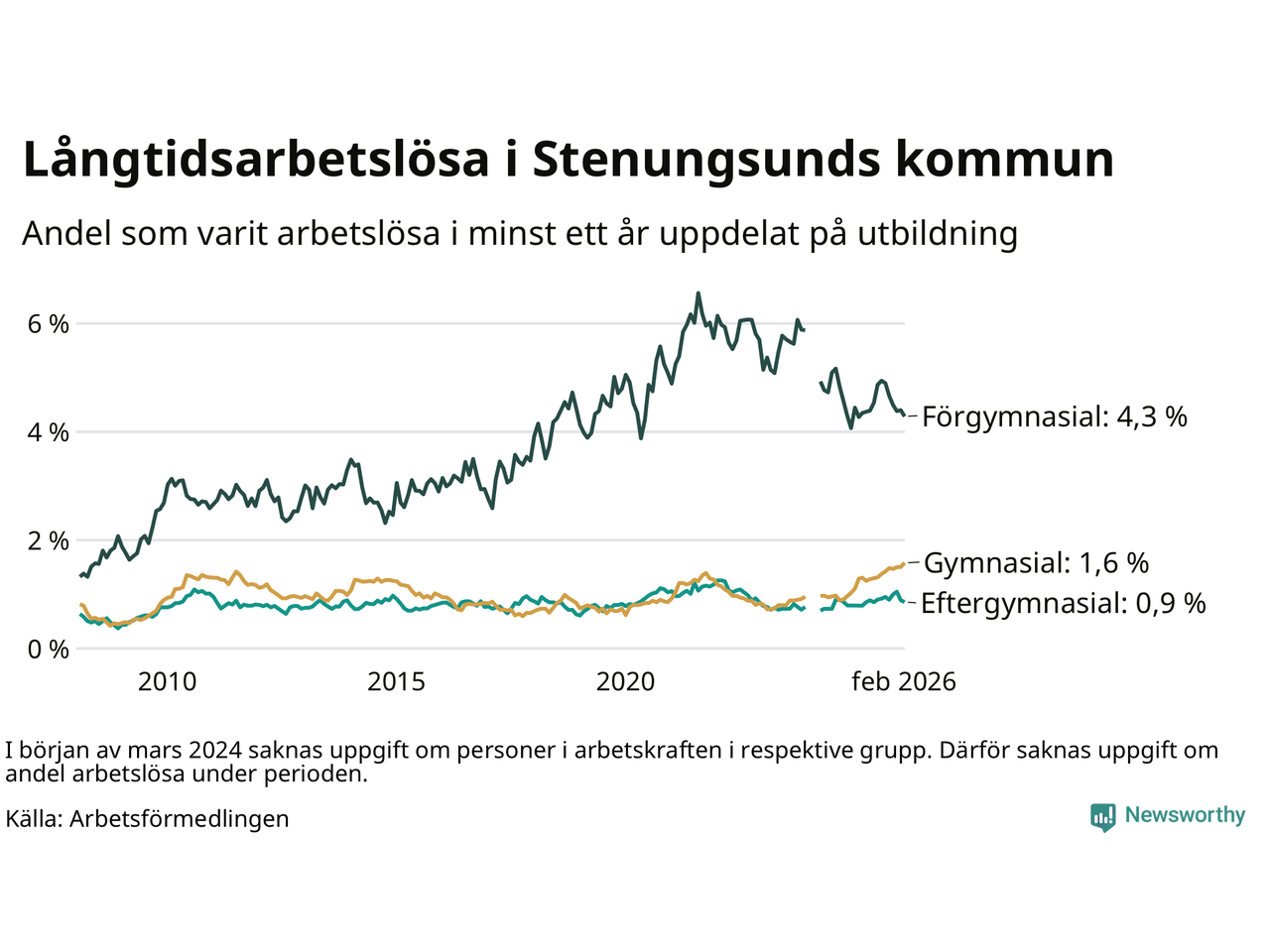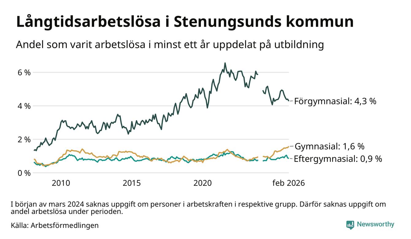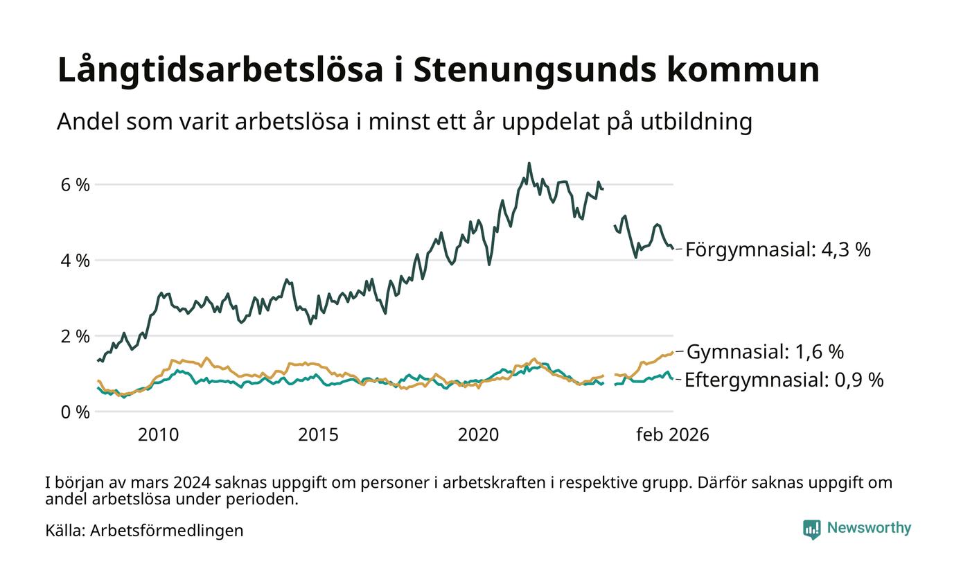 Andelen som varit utan arbete i minst ett år i Stenungsund var ungefär lika stor i februari jämfört med samma månad för ett år sedan. Det visar Arbetsfömedlingens senaste månadsstatistik.