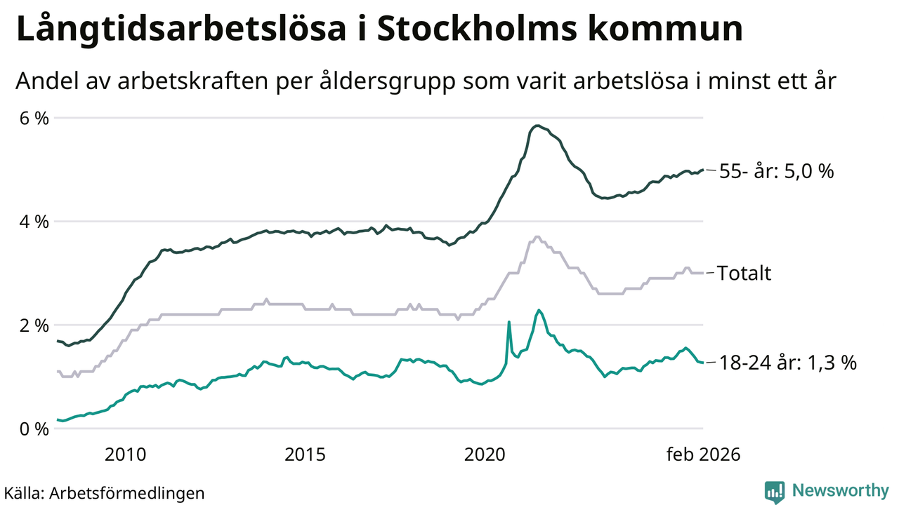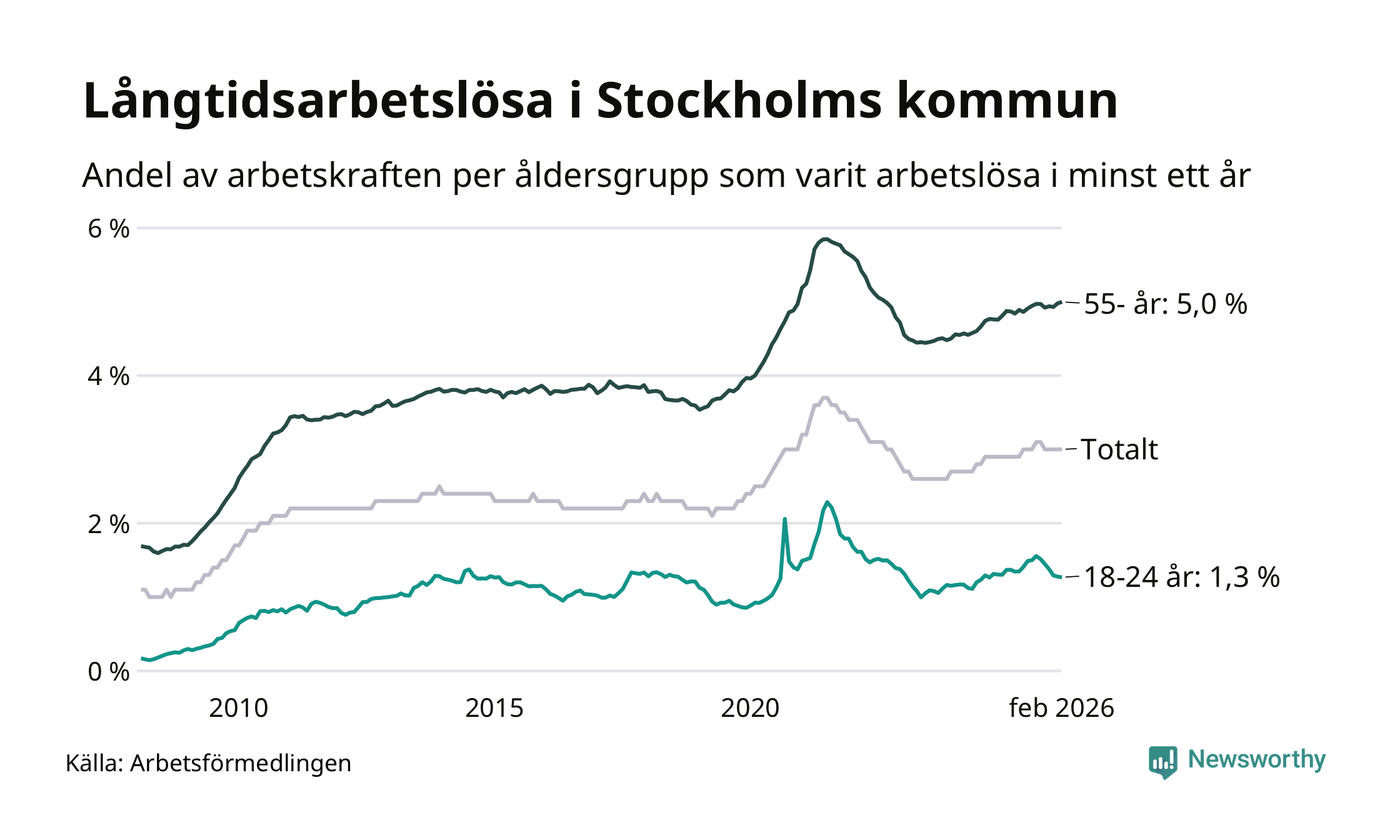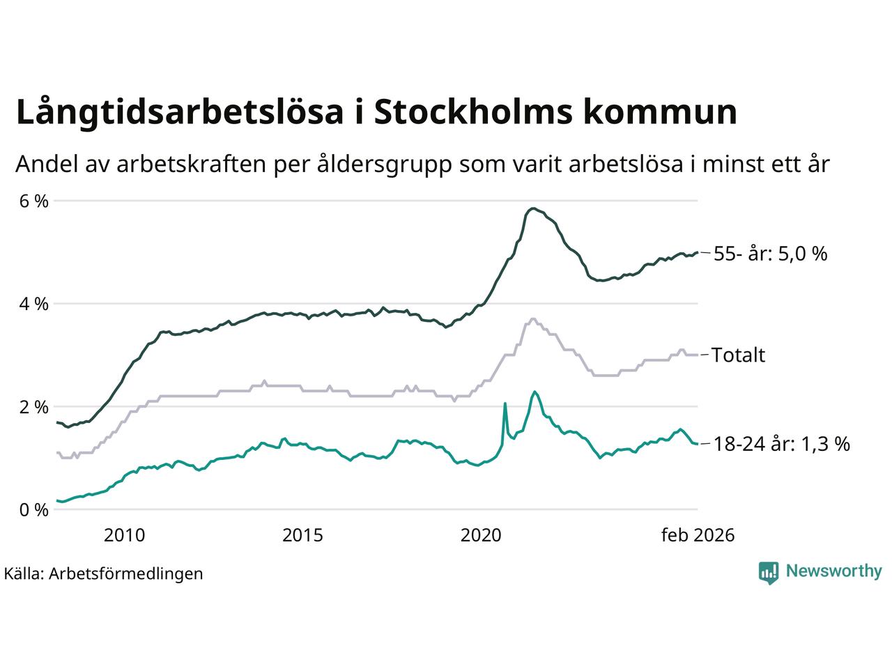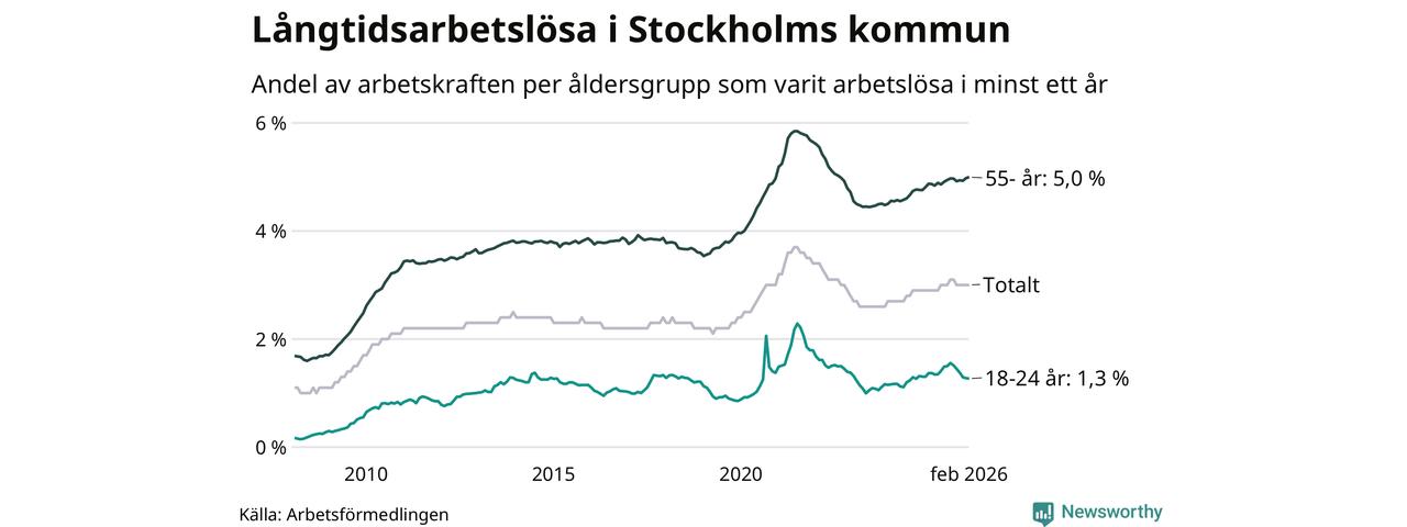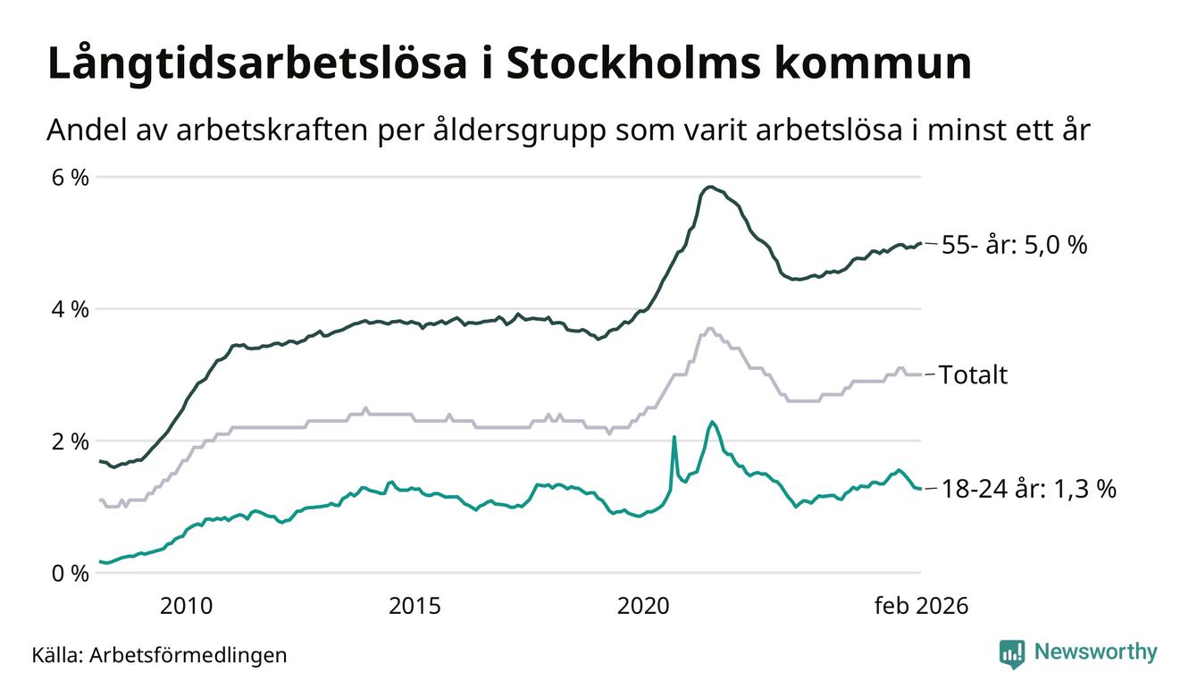 Av de 16 508 personerna som varit arbetslösa i mer än ett år i Stockholms kommun är 4 967 personer mellan 55 och 661 år och 559 är mellan 18 och 24 år. För den äldre gruppen är andelen arbetslösa 5,0 procent medan den i den yngre gruppen är 1,3 procent. Även i riket som helhet är långtidsarbetslösheten högre i gruppen äldre.