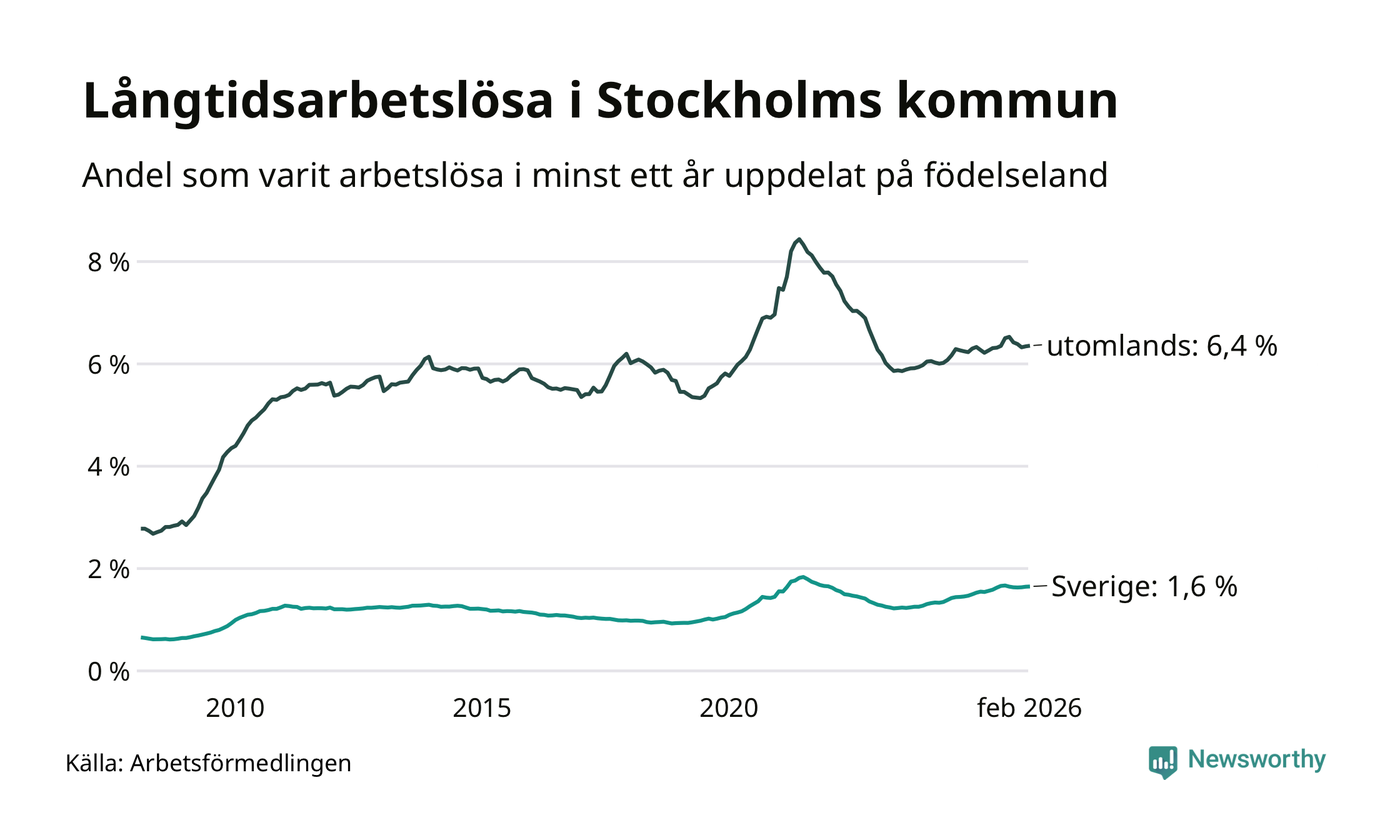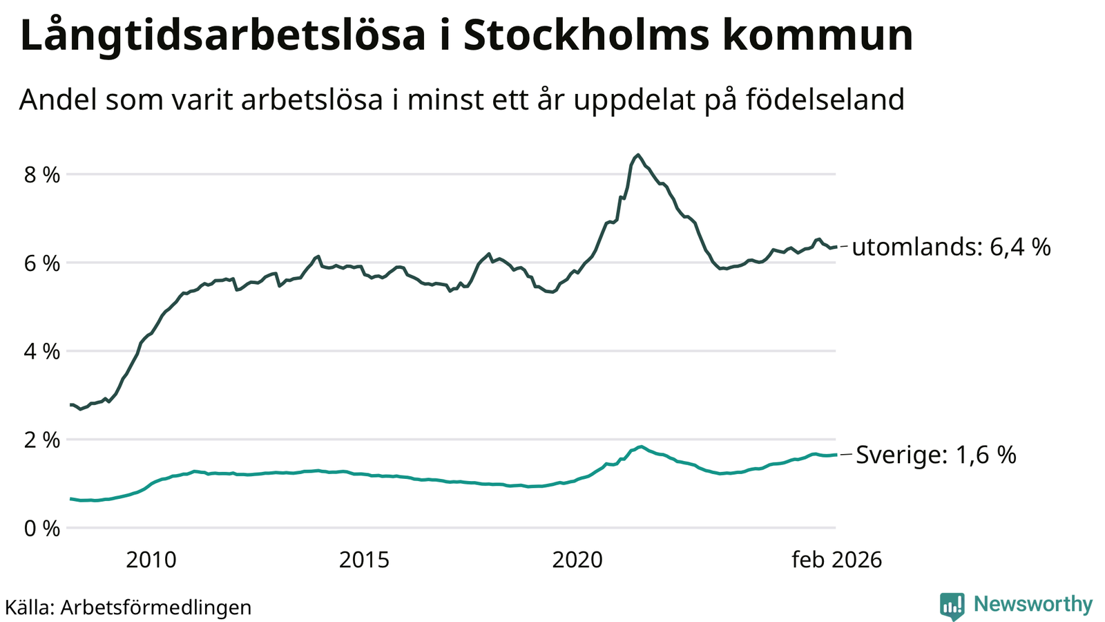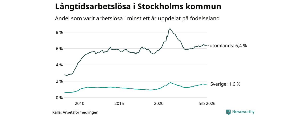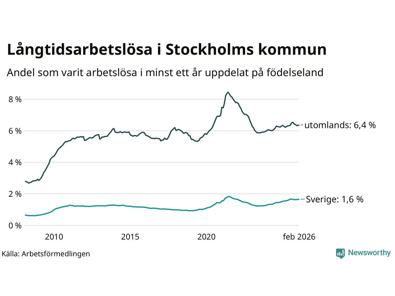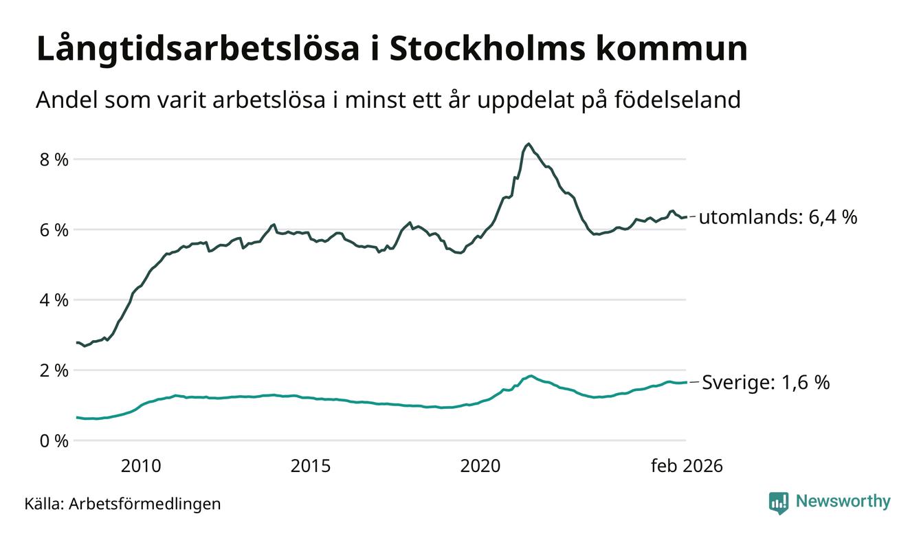 6 311 av de långtidsarbetslösa i Stockholms kommun är födda i Sverige, medan 10 197 är födda utomlands. Det innebär att långtidsarbetslösheten bland Sverigefödda är 1,6 procent, medan den är fyra gånger så hög – 6,4 procent – bland födda utomlands. Även i riket som helhet är arbetslösheten högre bland utrikesfödda.