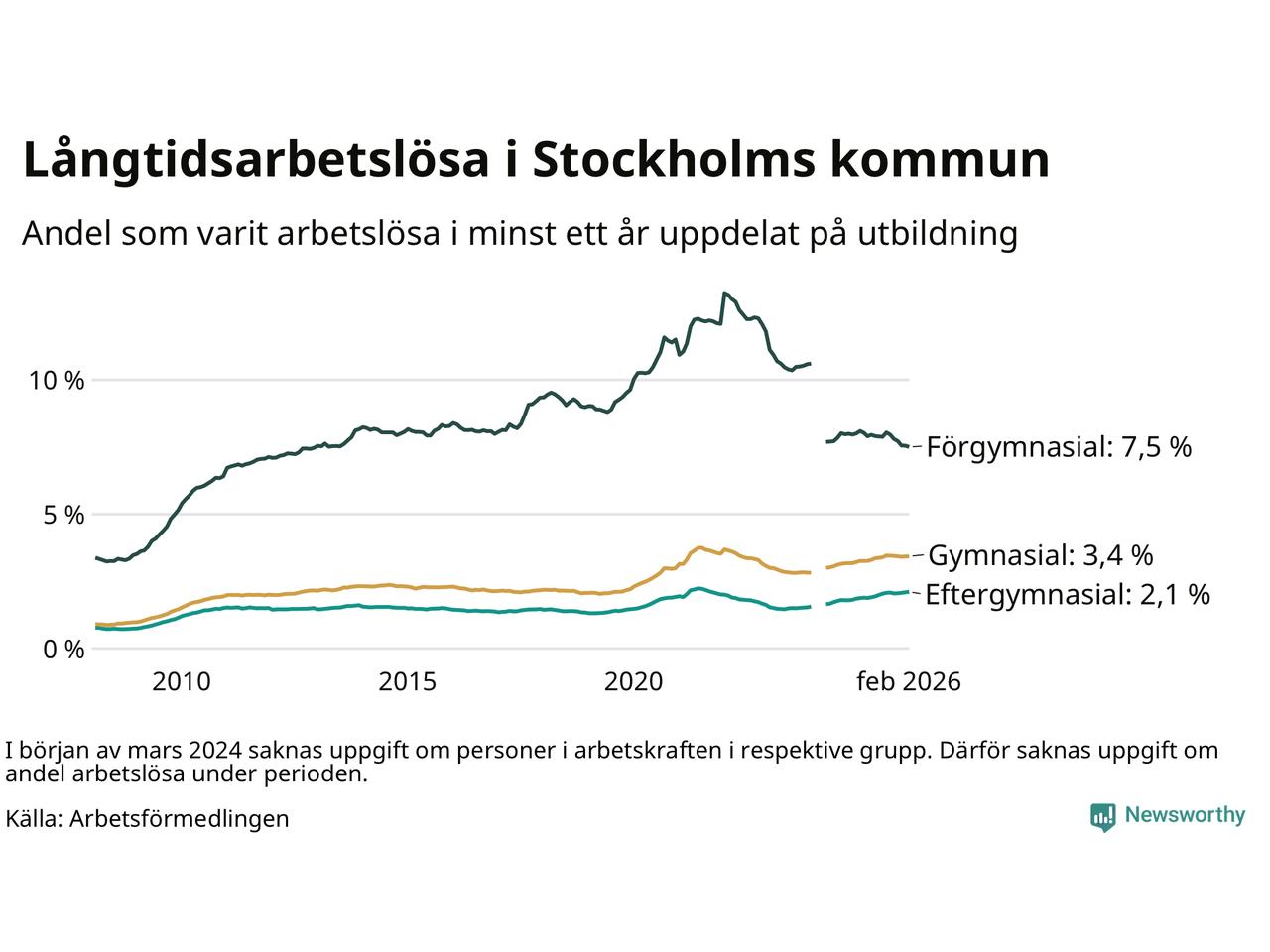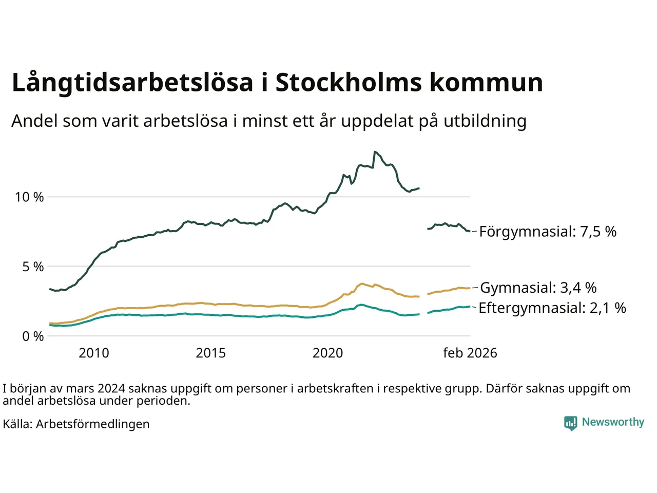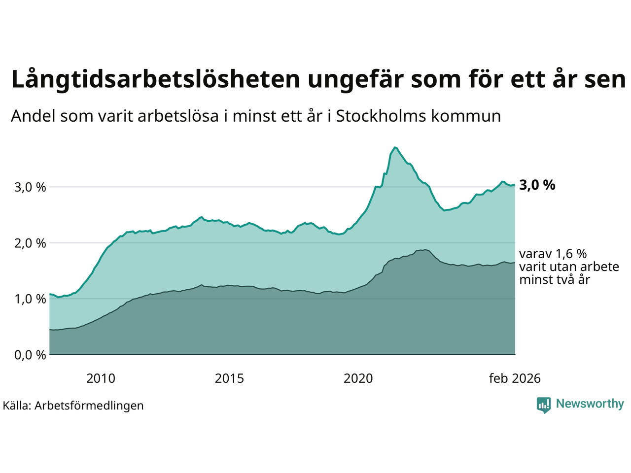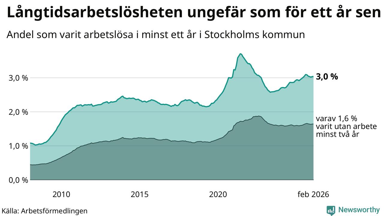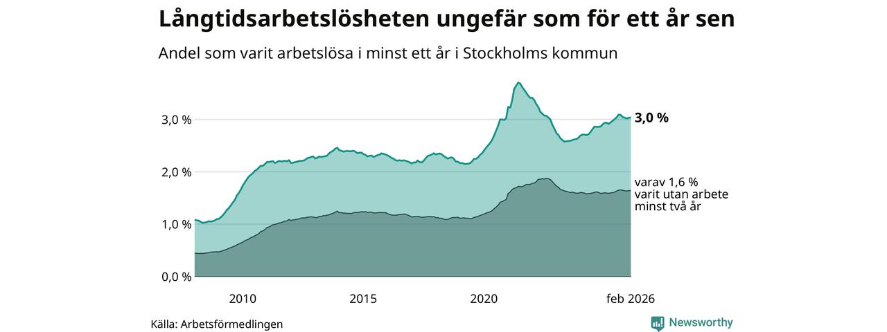 Andelen som varit utan arbete i minst ett år i Stockholms kommun var ungefär lika stor i februari jämfört med samma månad för ett år sedan. Det visar Arbetsfömedlingens senaste månadsstatistik.