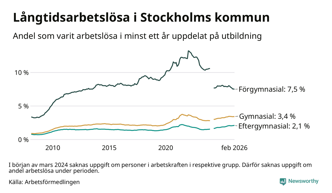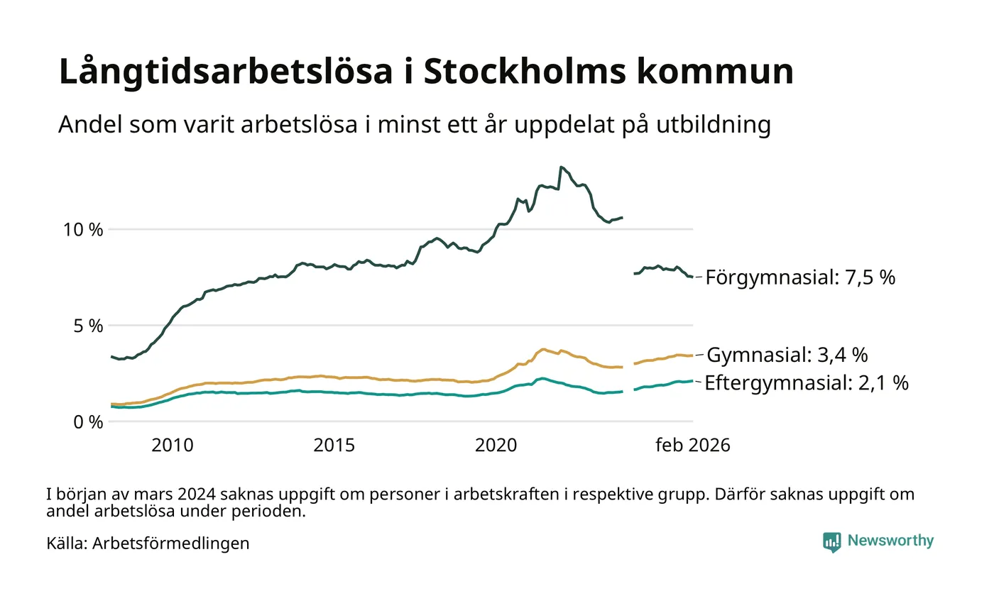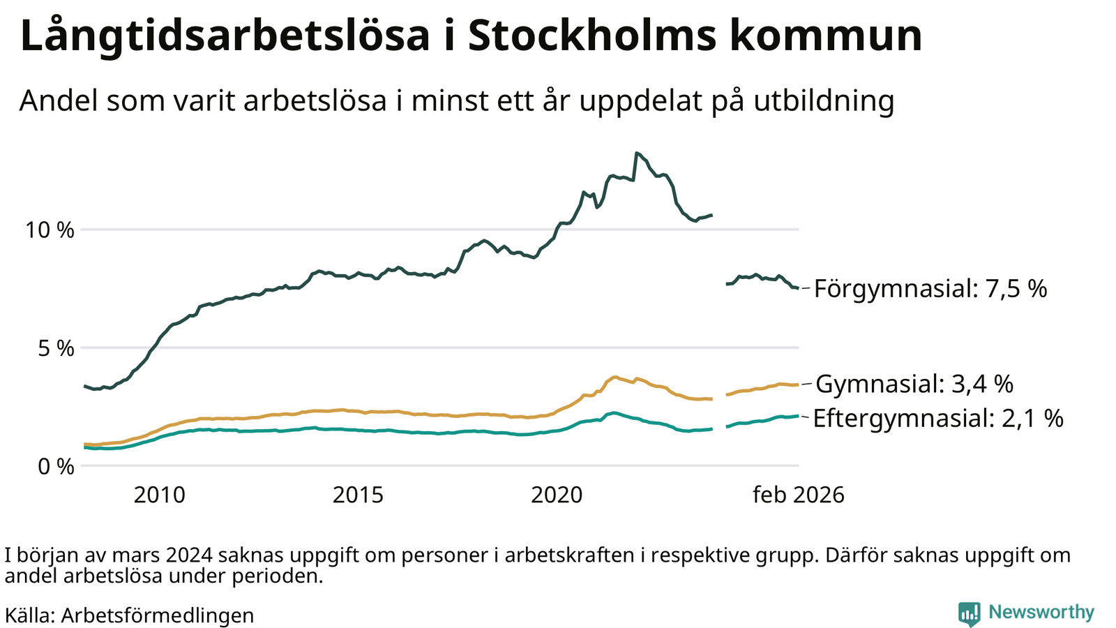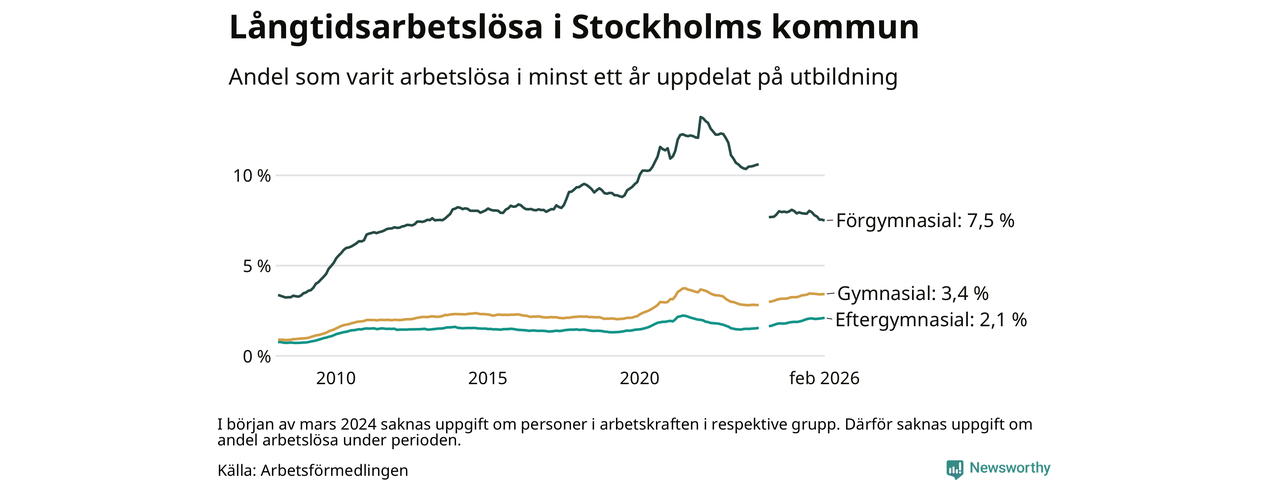 Andelen som varit utan arbete i minst ett år i Stockholms kommun var ungefär lika stor i februari jämfört med samma månad för ett år sedan. Det visar Arbetsfömedlingens senaste månadsstatistik.
