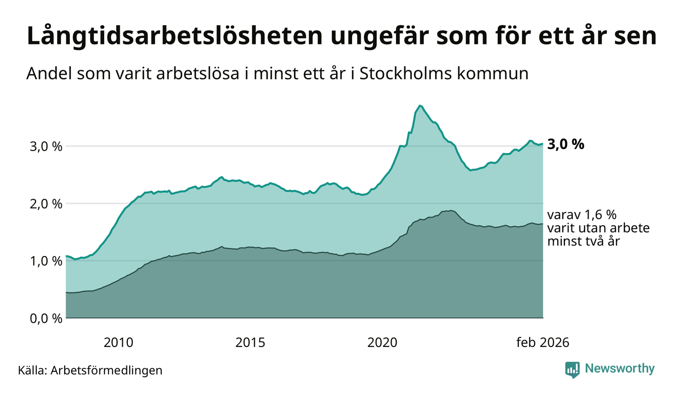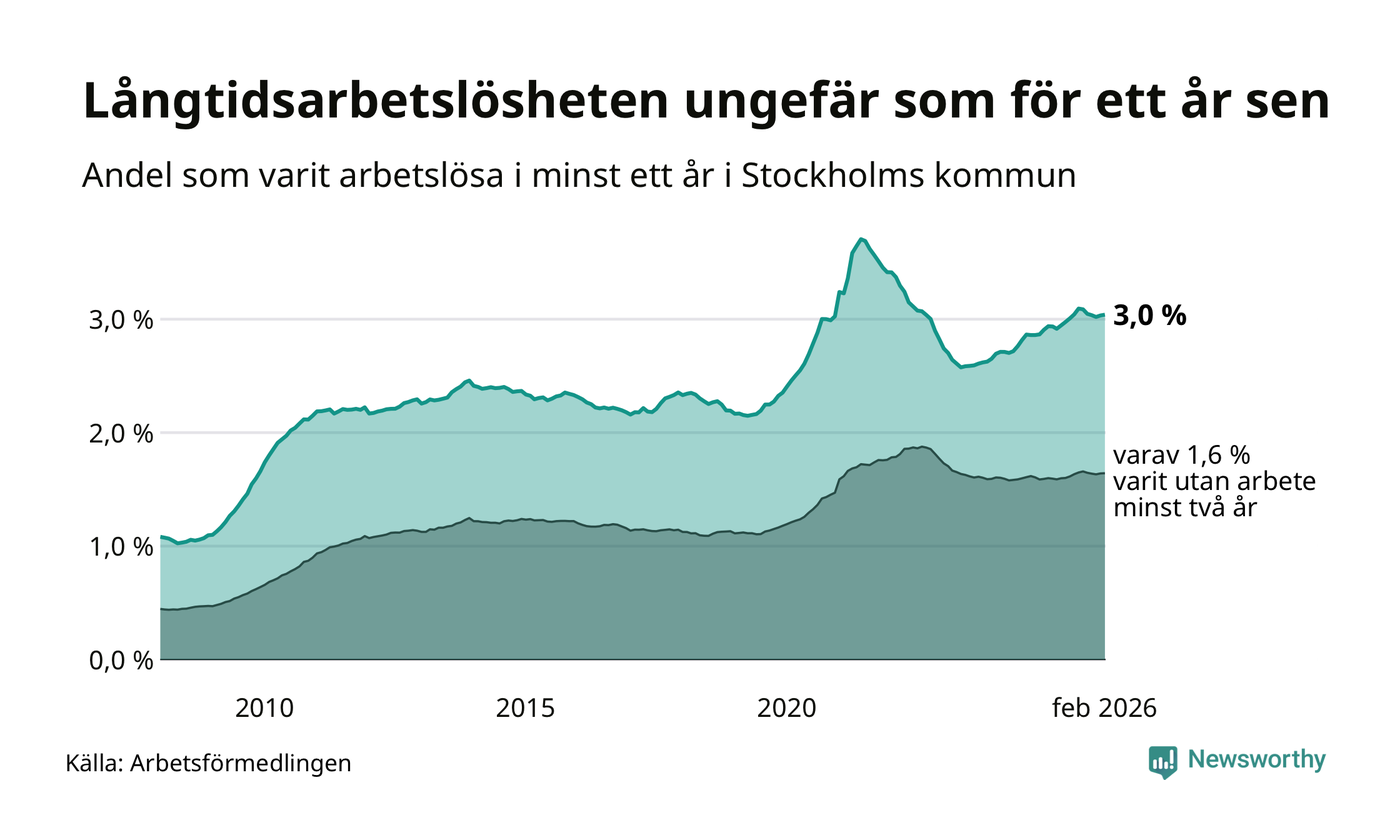I februari hade 16 508 Stockholmsbor varit arbetslösa i minst ett år, vilket är 45 fler än månaden innan. 16 508 personer motsvarar 3,0 procent av arbetskraften i kommunen – andelen långtidsarbetslösa är ungefär på samma nivå som för ett år sedan.