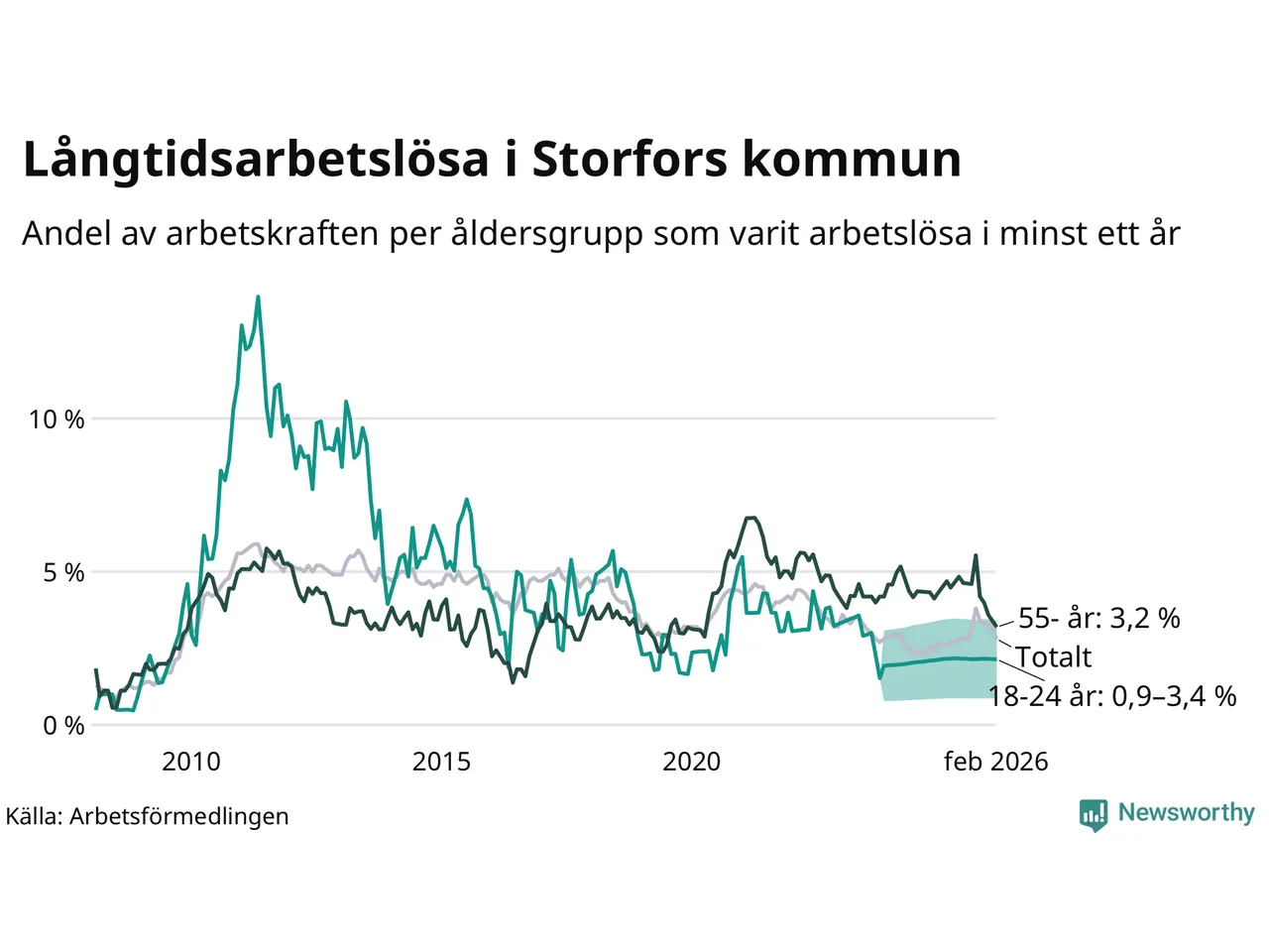 Graf: Andel arbetslösa uppdelat i åldersgrupper i Storfors