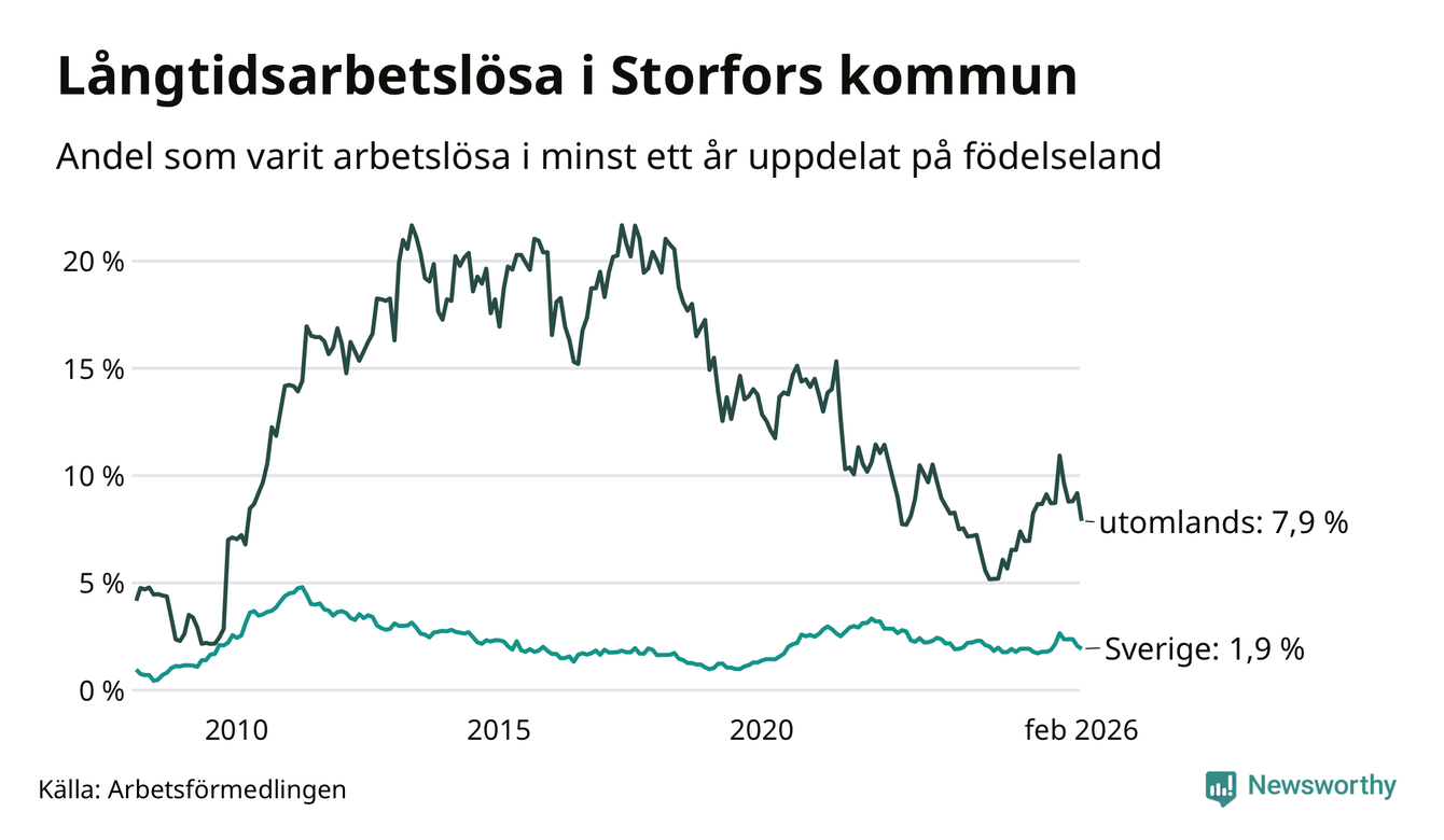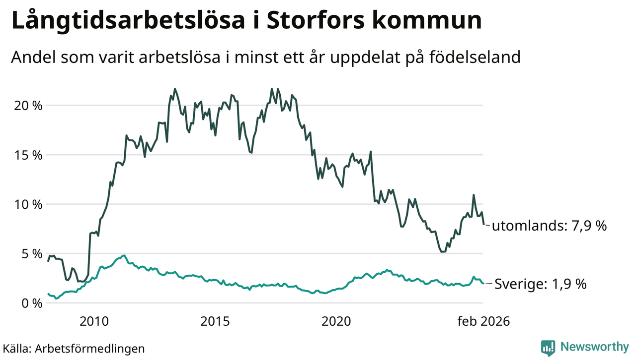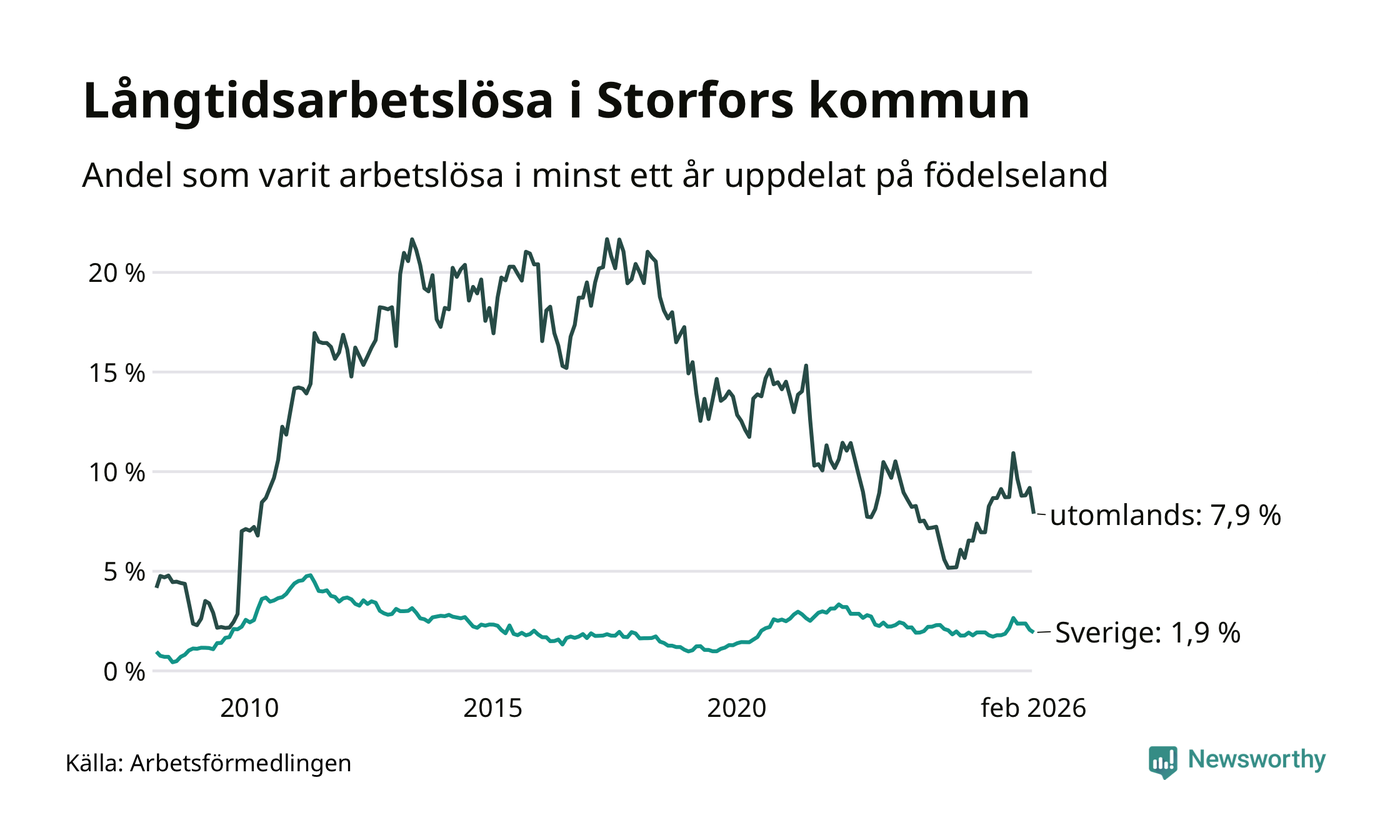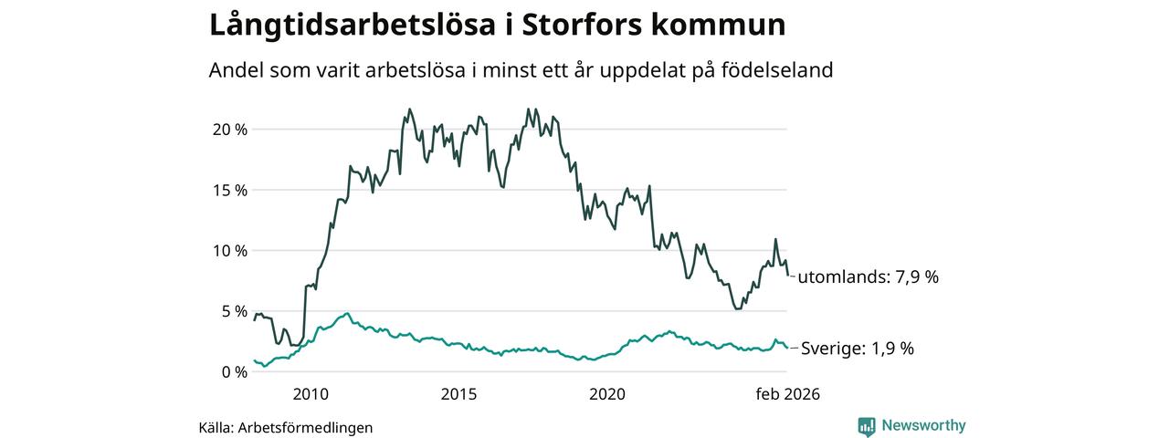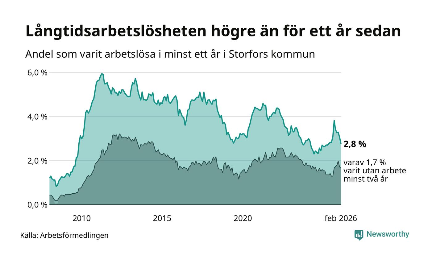I februari hade 45 Storforsbor varit arbetslösa i minst ett år, vilket är fem färre än månaden innan. Det är den femte månaden i rad med minskande antal långtidsarbetslösa. 45 personer motsvarar 2,8 procent av arbetskraften i kommunen – andelen långtidsarbetslösa är 0,2 procentenheter högre än samma månad för ett år sedan.