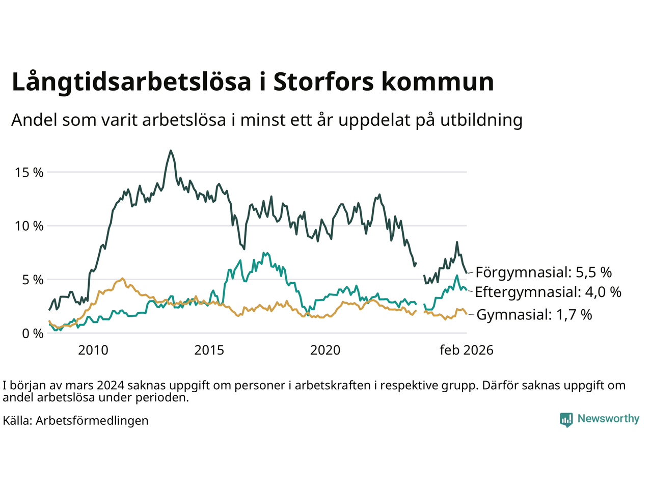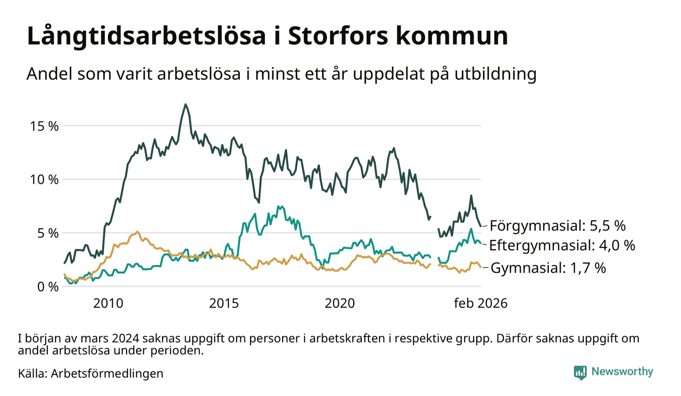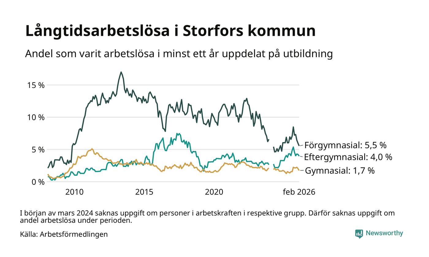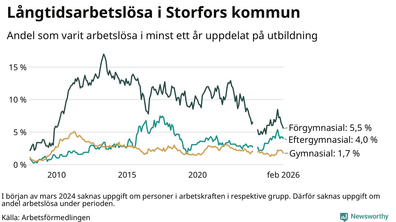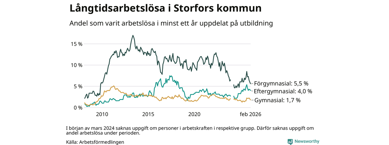 I februari hade 45 Storforsbor varit arbetslösa i minst ett år, vilket är fem färre än månaden innan. Det är den femte månaden i rad med minskande antal långtidsarbetslösa. 45 personer motsvarar 2,8 procent av arbetskraften i kommunen – andelen långtidsarbetslösa är 0,2 procentenheter högre än samma månad för ett år sedan.