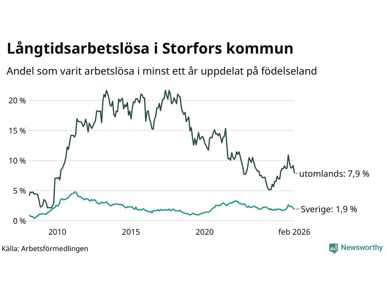 Graf: Andel arbetslösa uppdelat på födelseland i Storfors