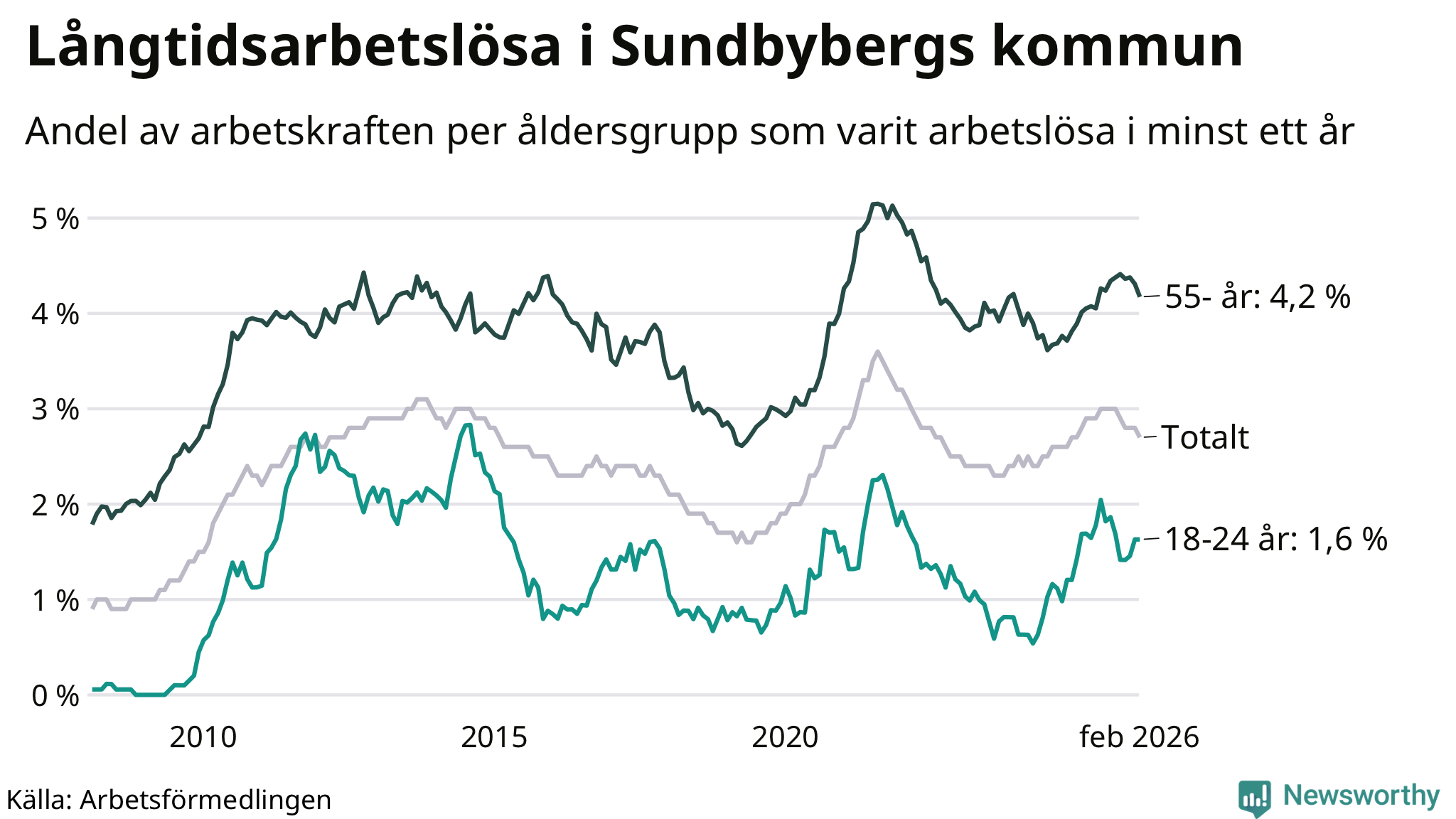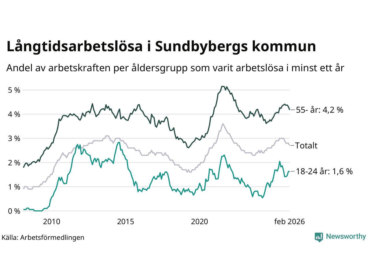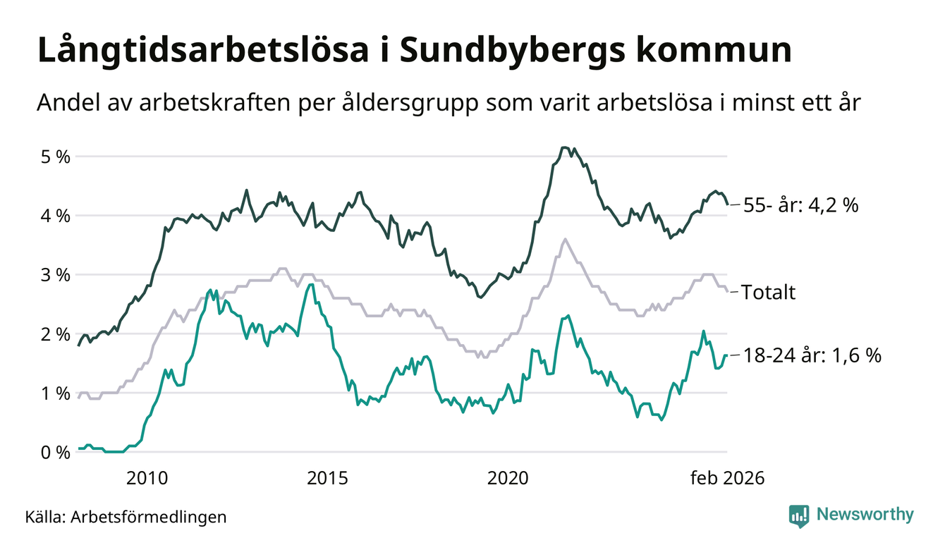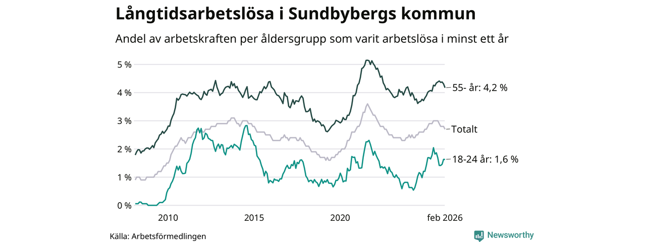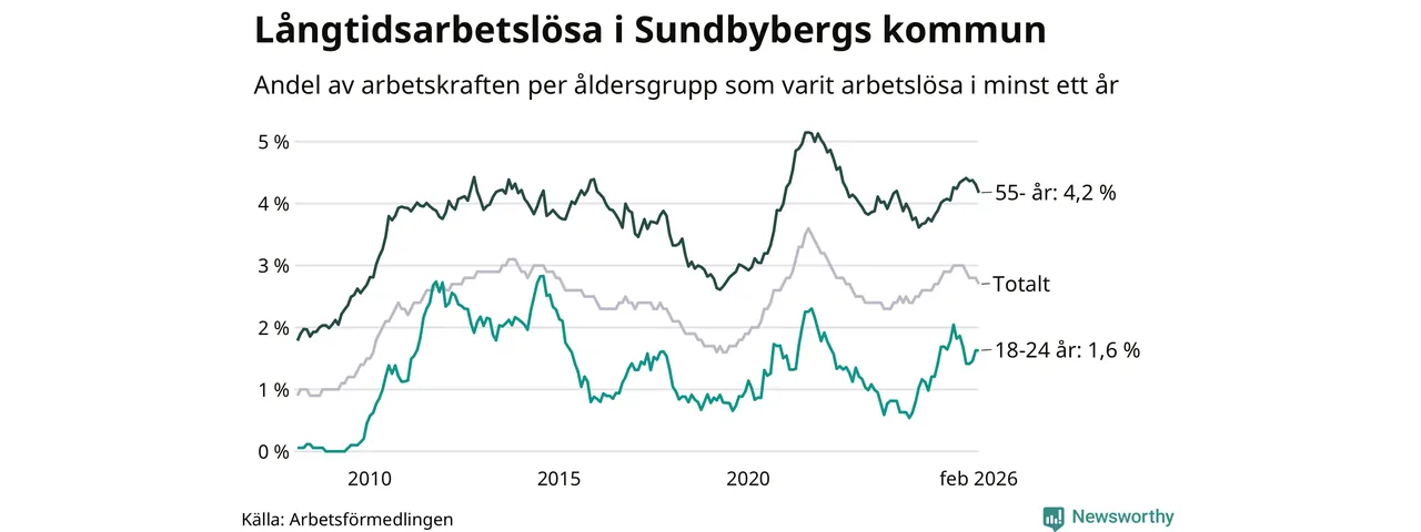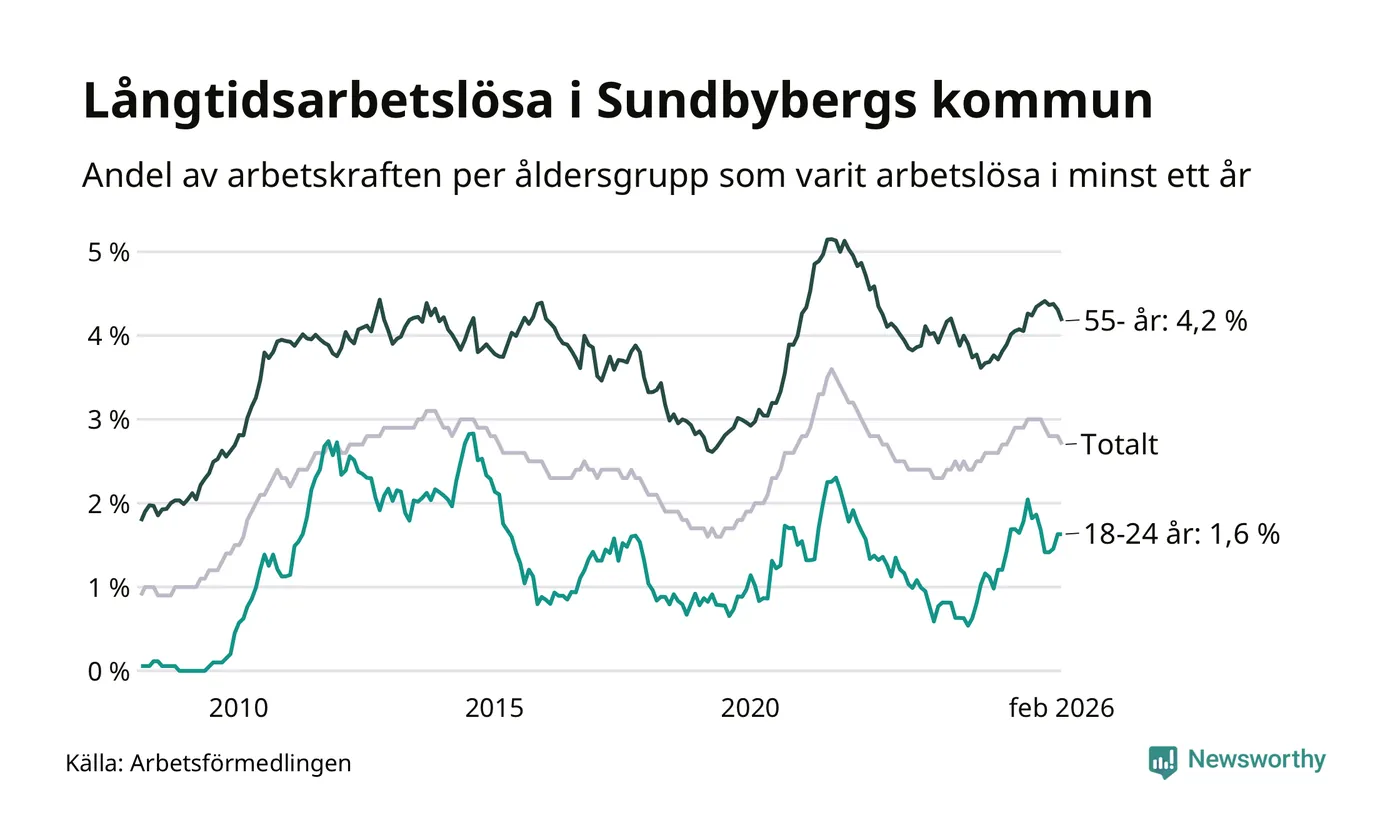 Av de 908 personerna som varit arbetslösa i mer än ett år i Sundbybergs kommun är 201 personer mellan 55 och 661 år och 37 är mellan 18 och 24 år. För den äldre gruppen är andelen arbetslösa 4,2 procent medan den i den yngre gruppen är 1,6 procent. Även i riket som helhet är långtidsarbetslösheten högre i gruppen äldre.