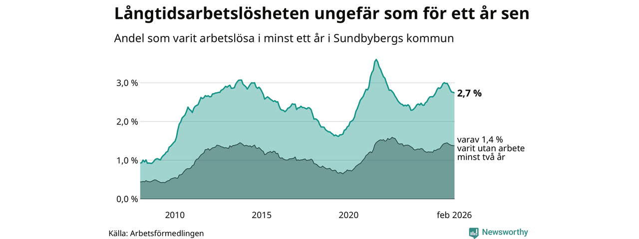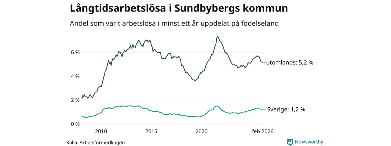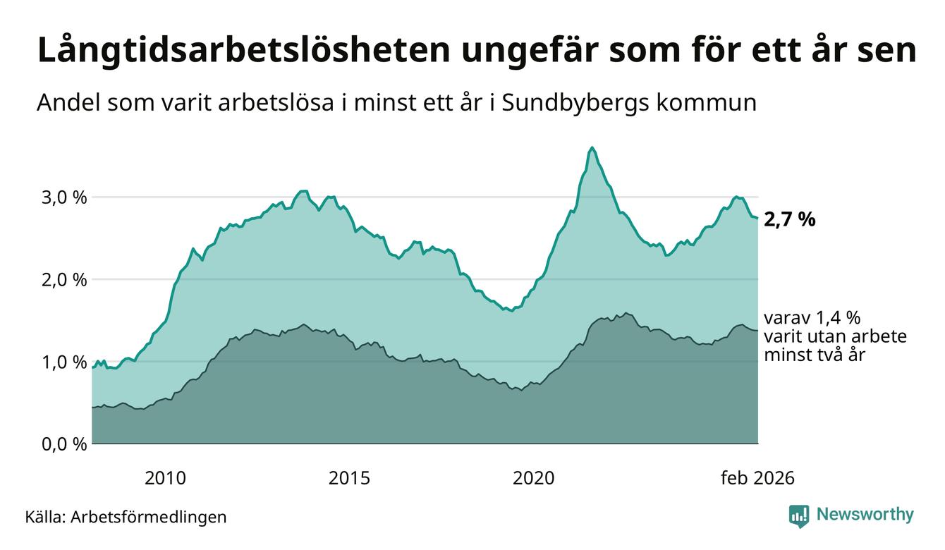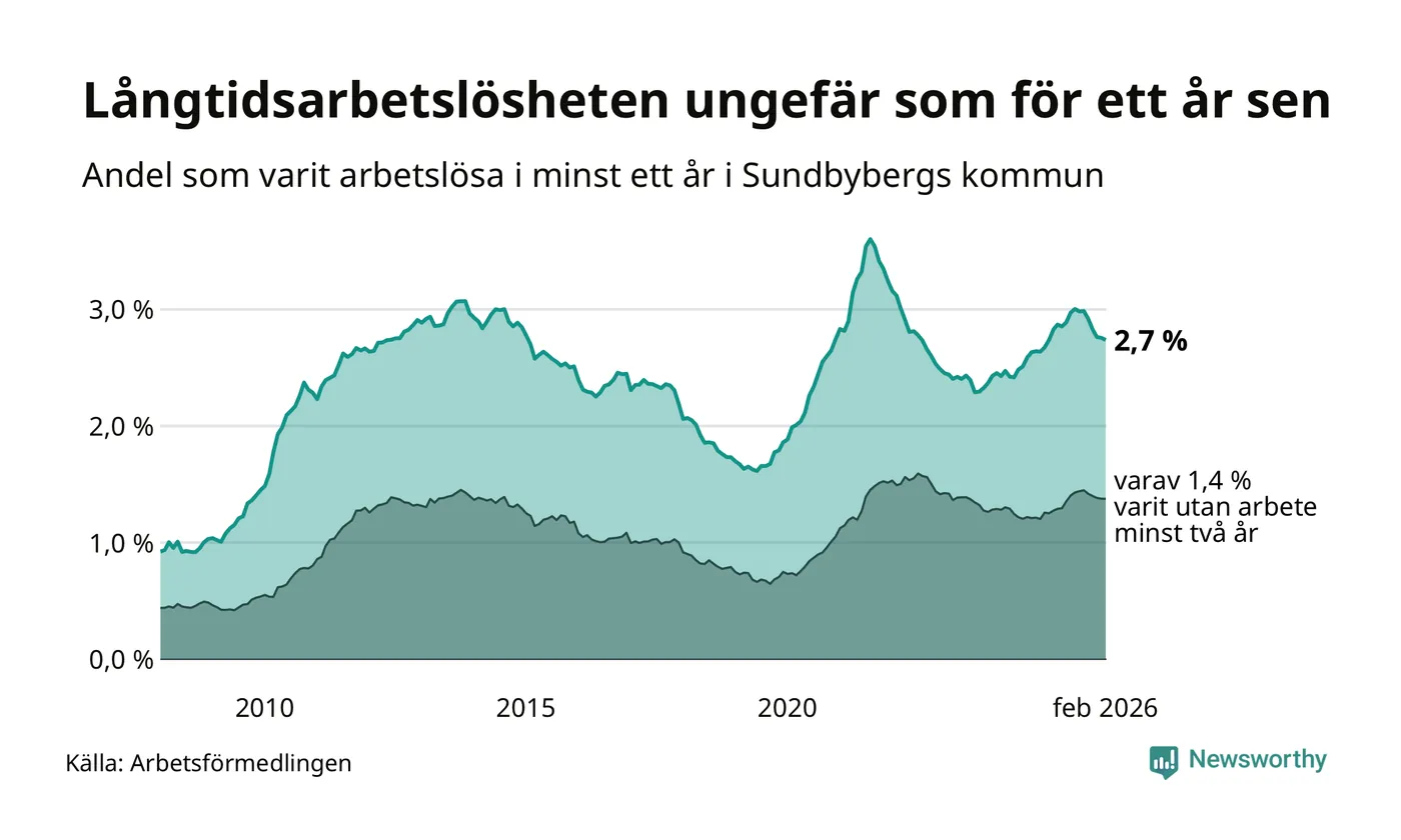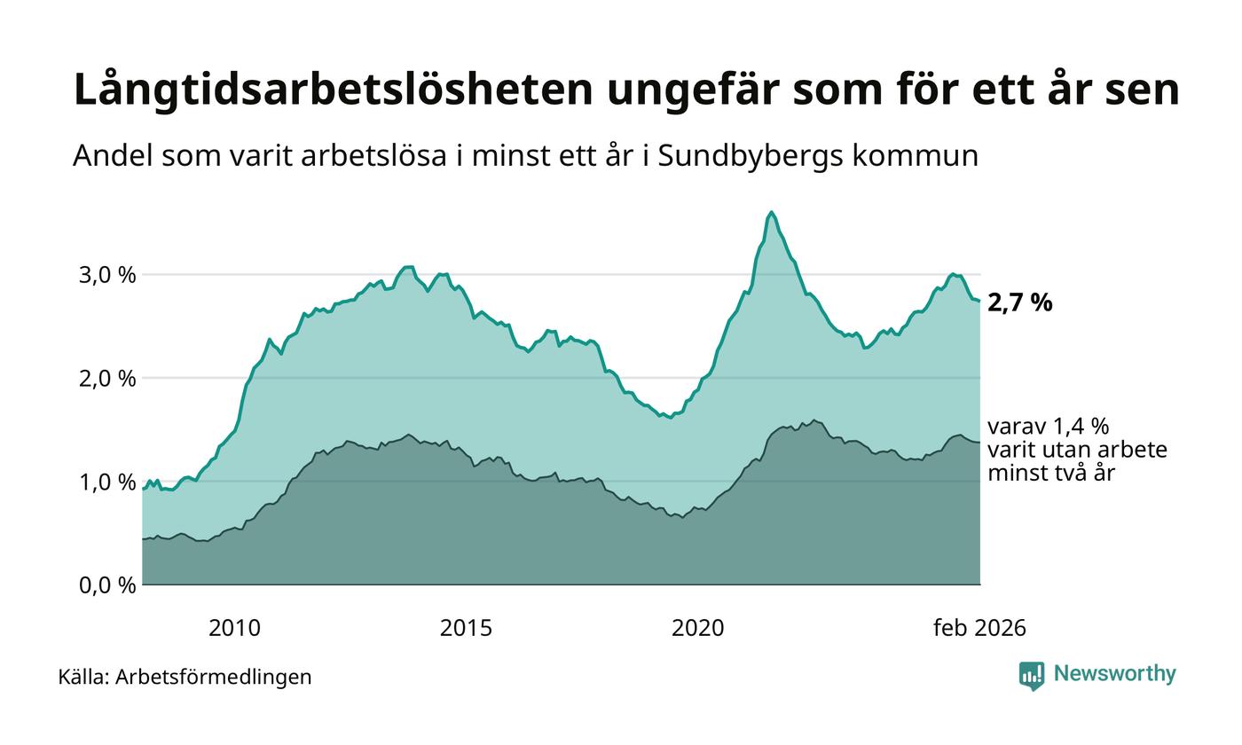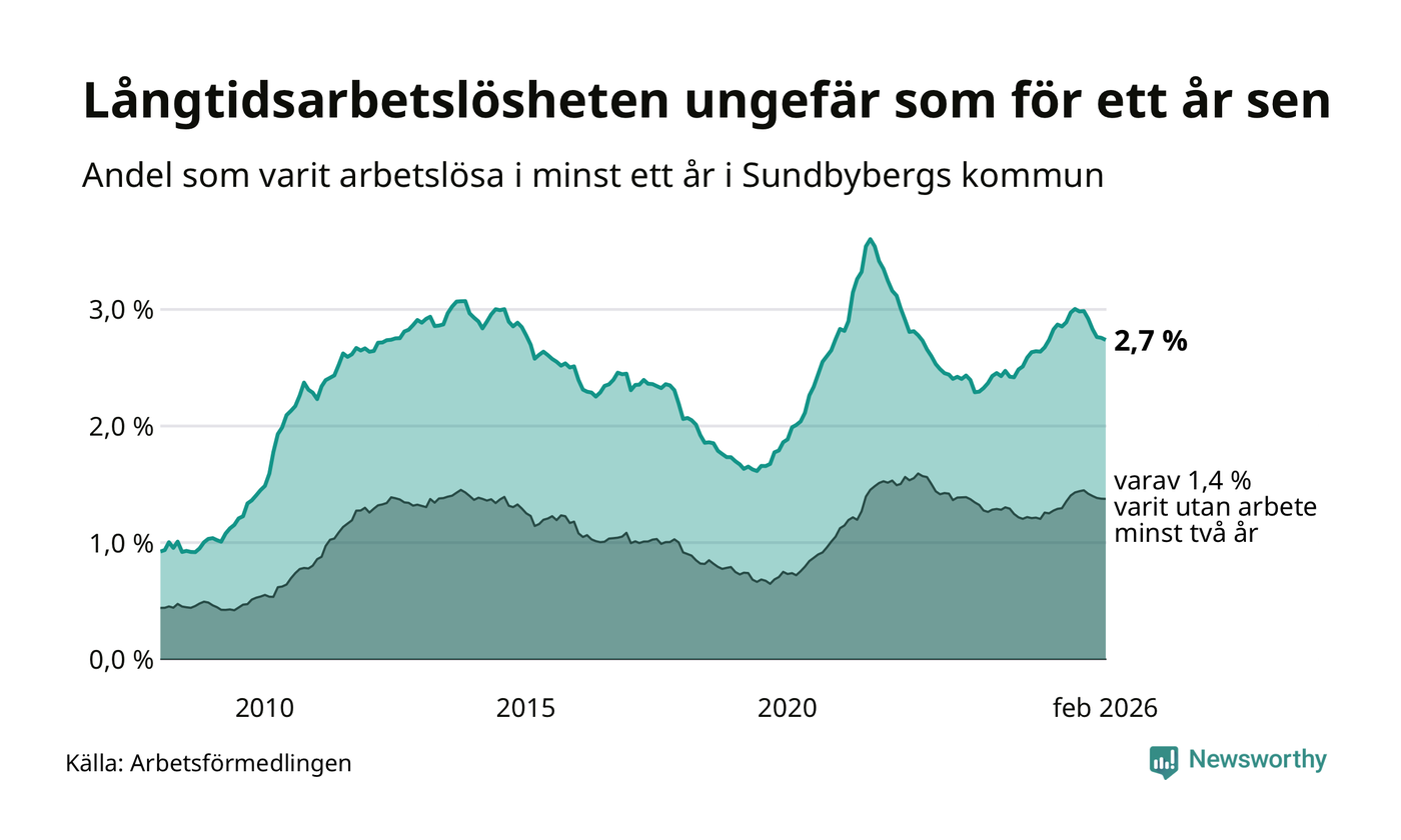 I februari hade 908 Sundbybergsbor varit arbetslösa i minst ett år, vilket är fem färre än månaden innan. 908 personer motsvarar 2,7 procent av arbetskraften i kommunen – andelen långtidsarbetslösa är ungefär på samma nivå som för ett år sedan.