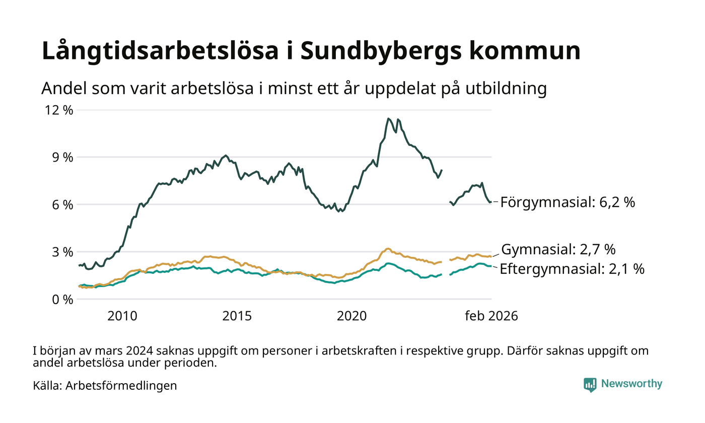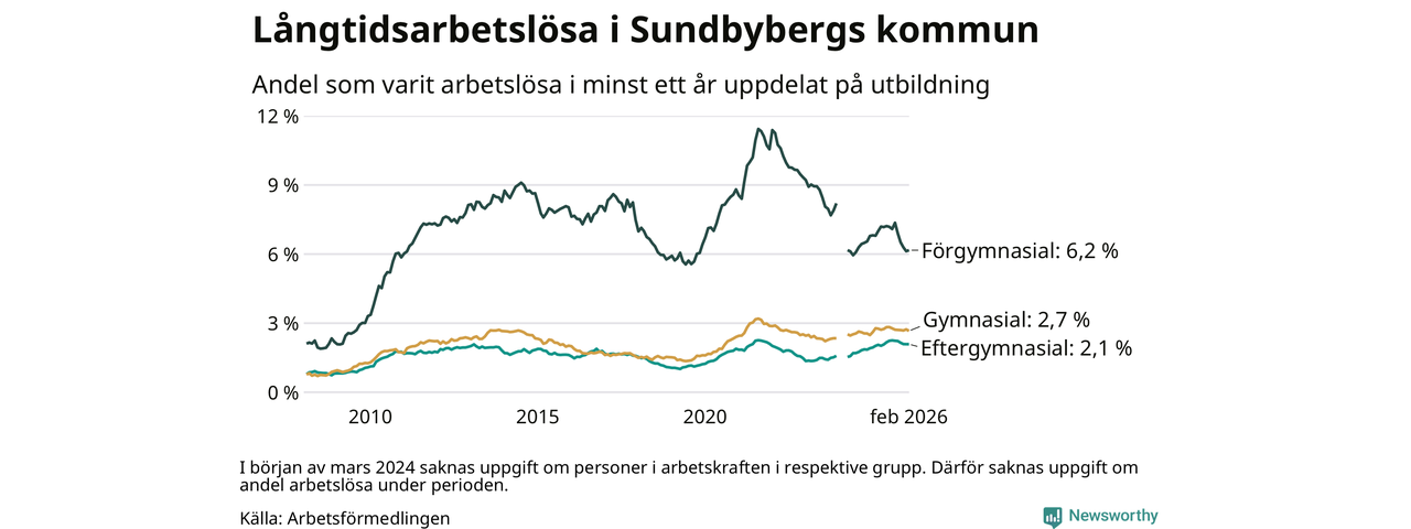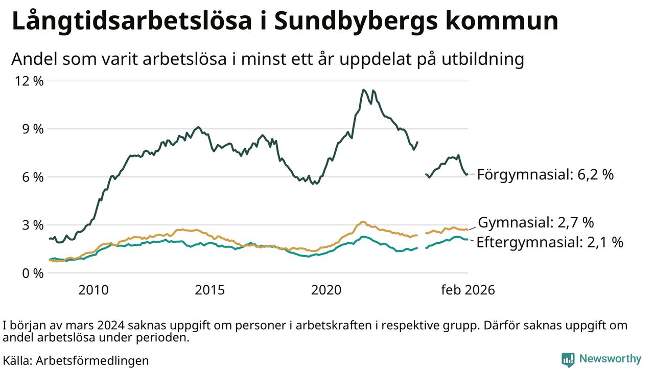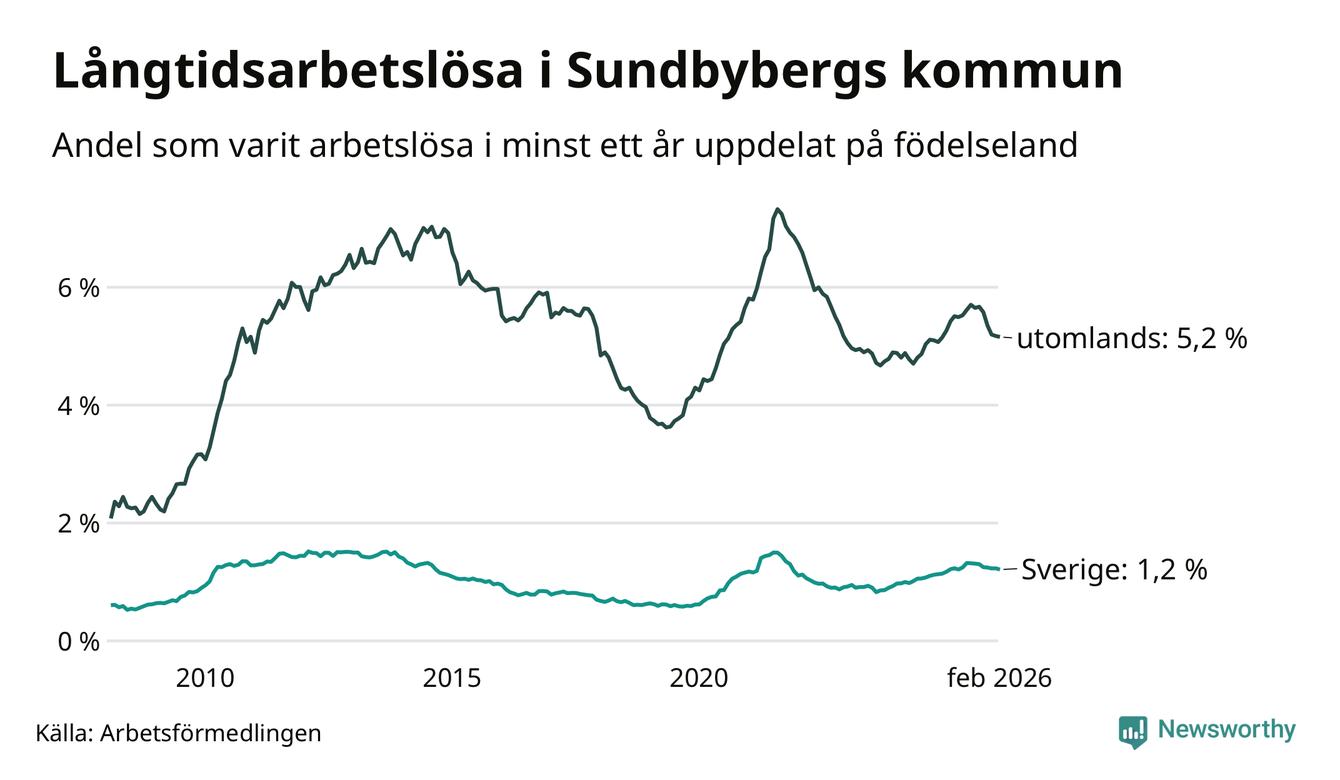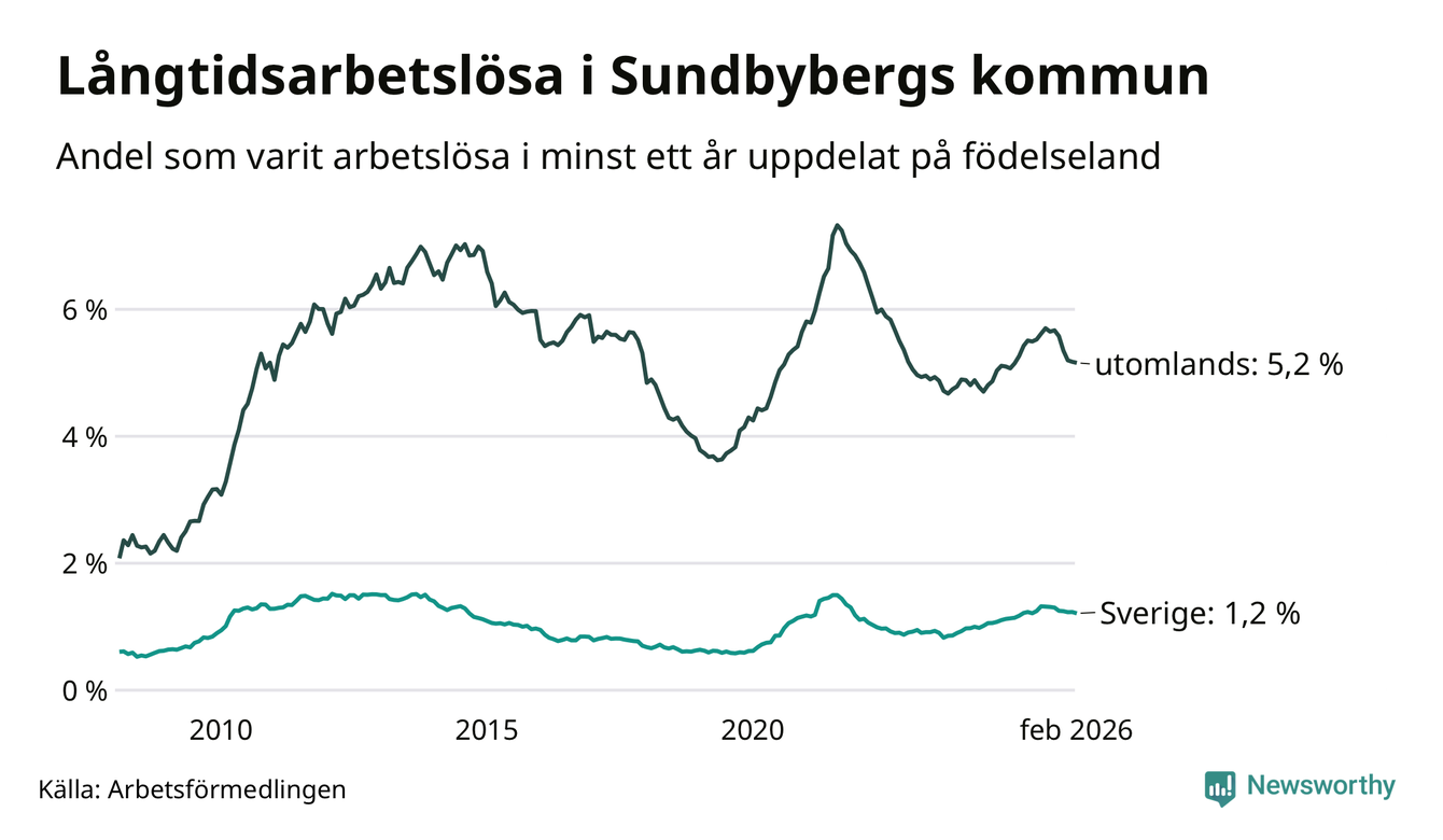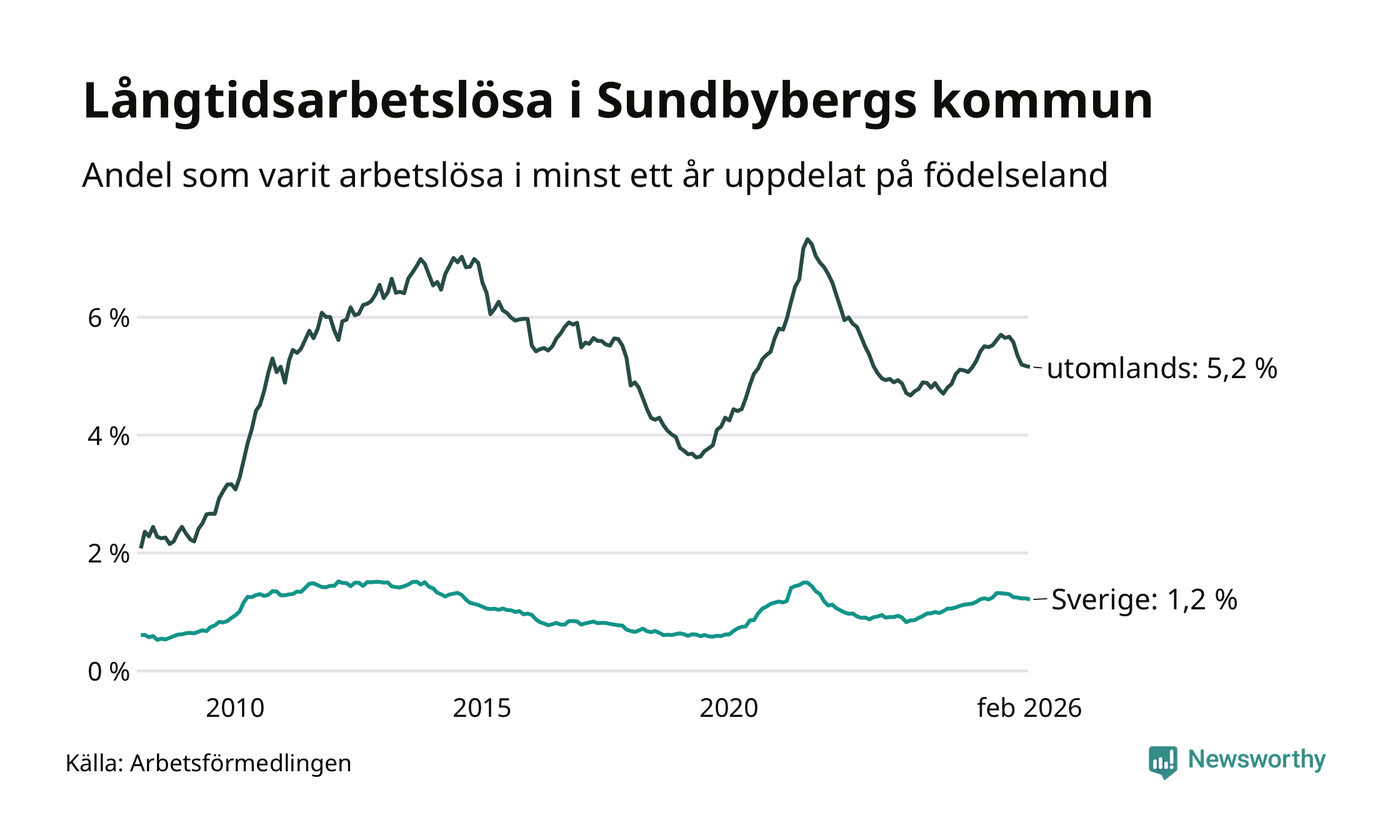 I februari hade 908 Sundbybergsbor varit arbetslösa i minst ett år, vilket är fem färre än månaden innan. 908 personer motsvarar 2,7 procent av arbetskraften i kommunen – andelen långtidsarbetslösa är ungefär på samma nivå som för ett år sedan.