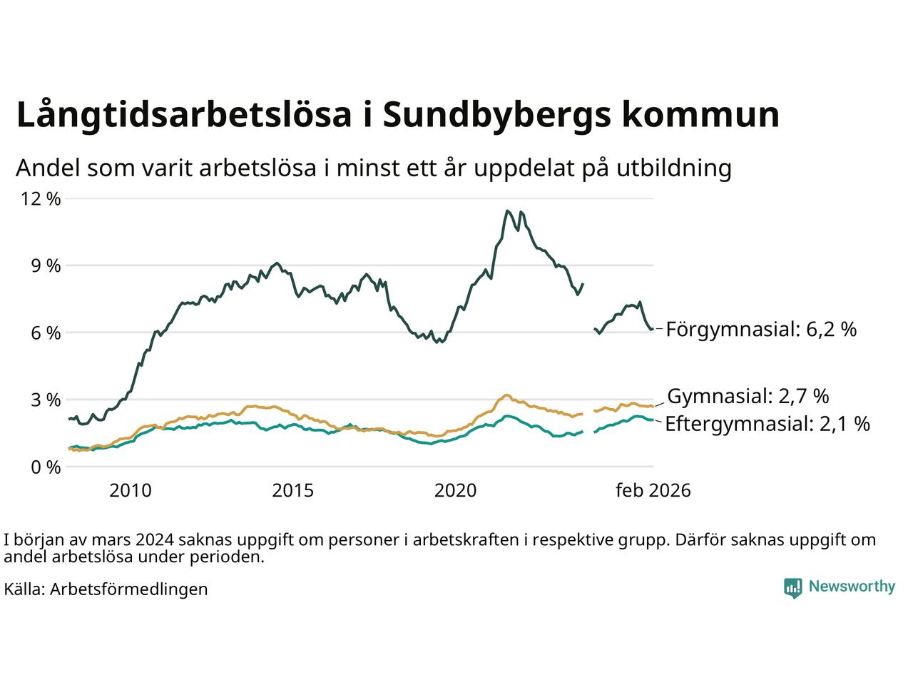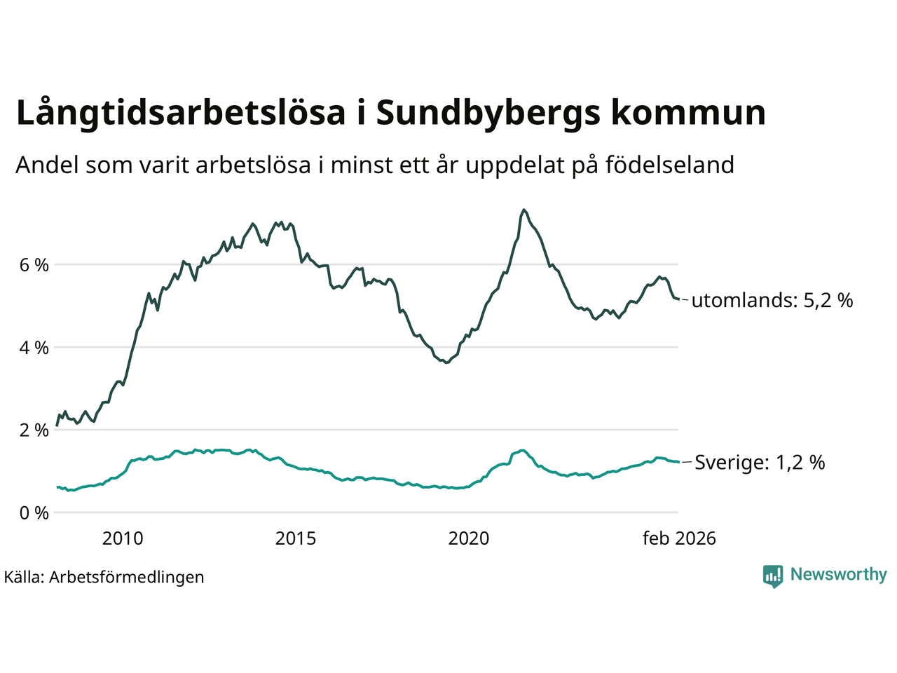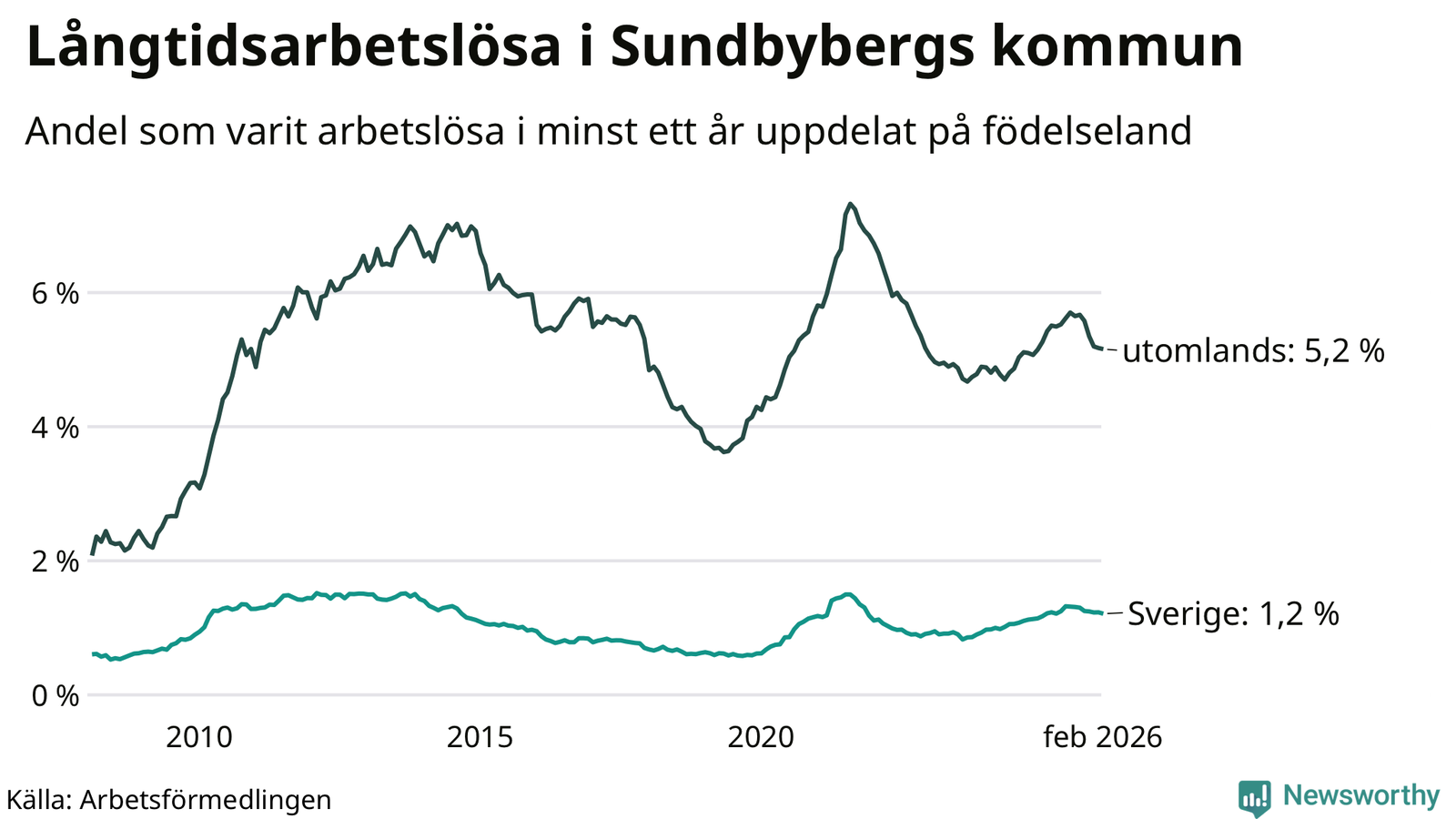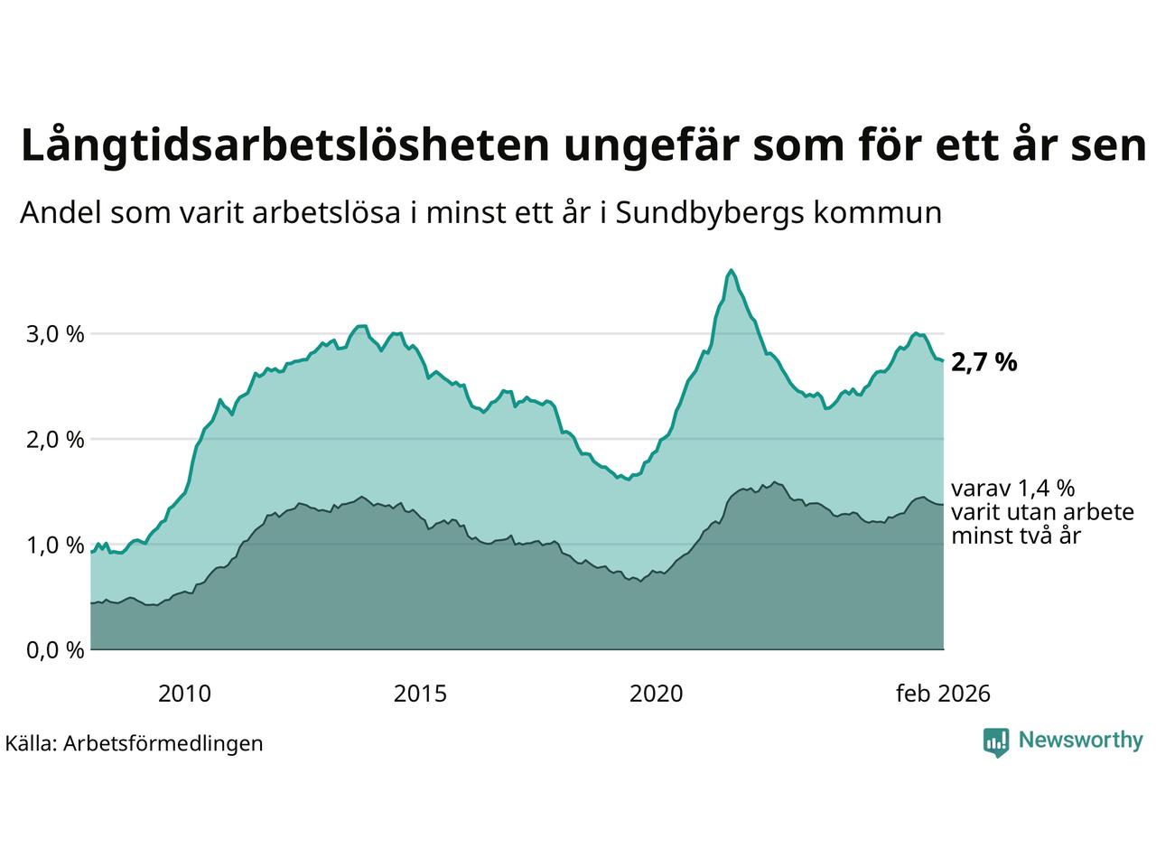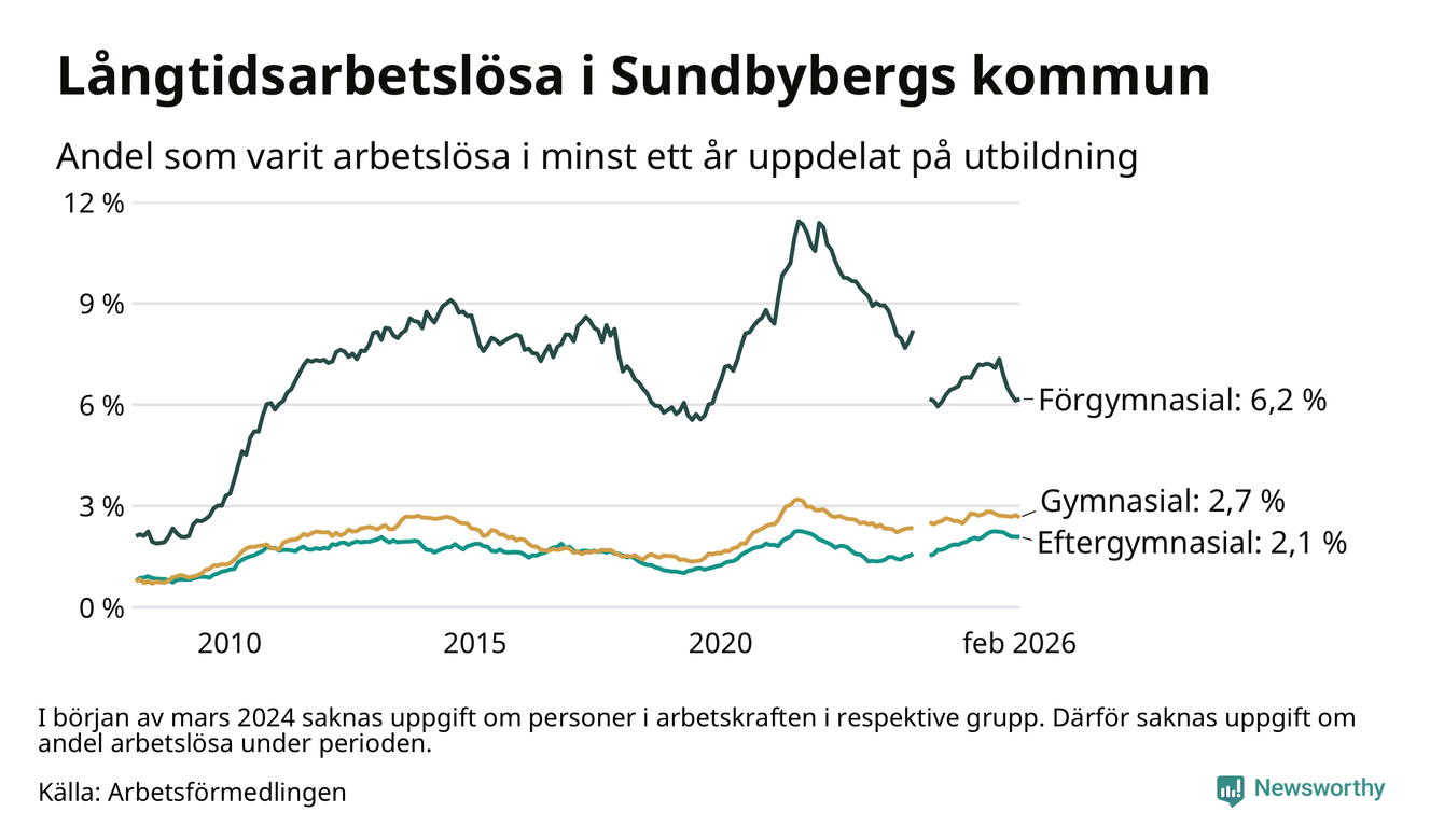 I februari hade 908 Sundbybergsbor varit arbetslösa i minst ett år, vilket är fem färre än månaden innan. 908 personer motsvarar 2,7 procent av arbetskraften i kommunen – andelen långtidsarbetslösa är ungefär på samma nivå som för ett år sedan.