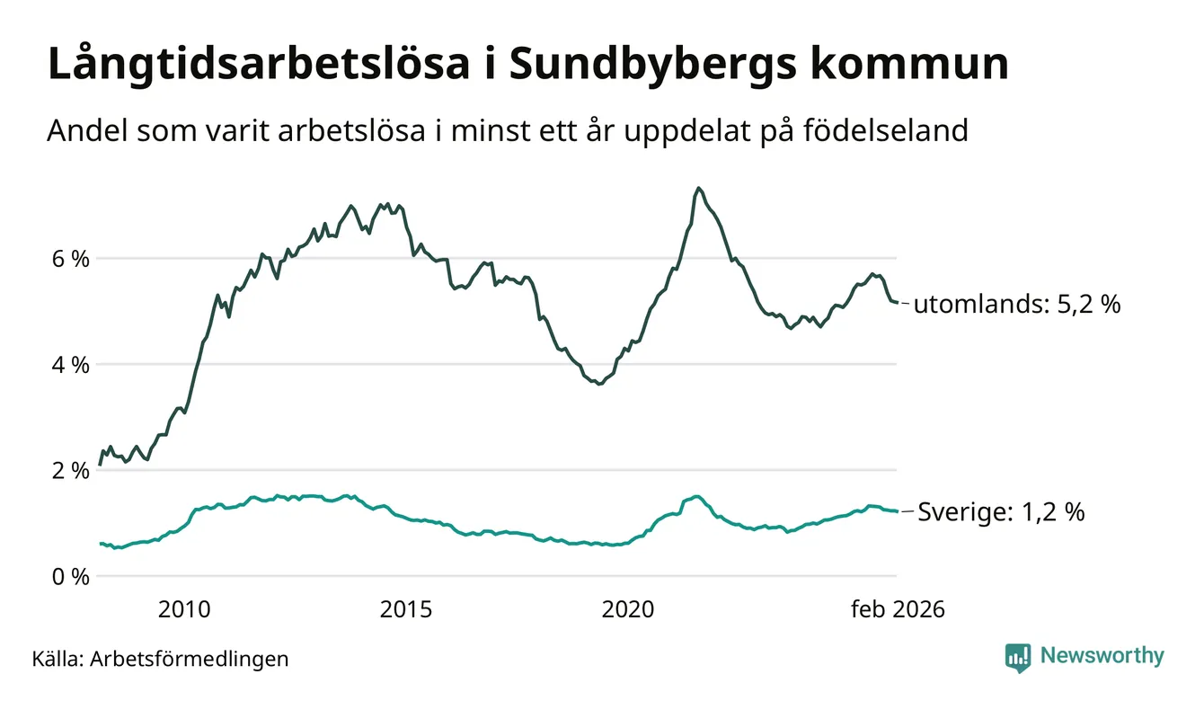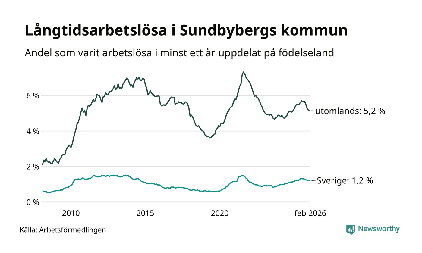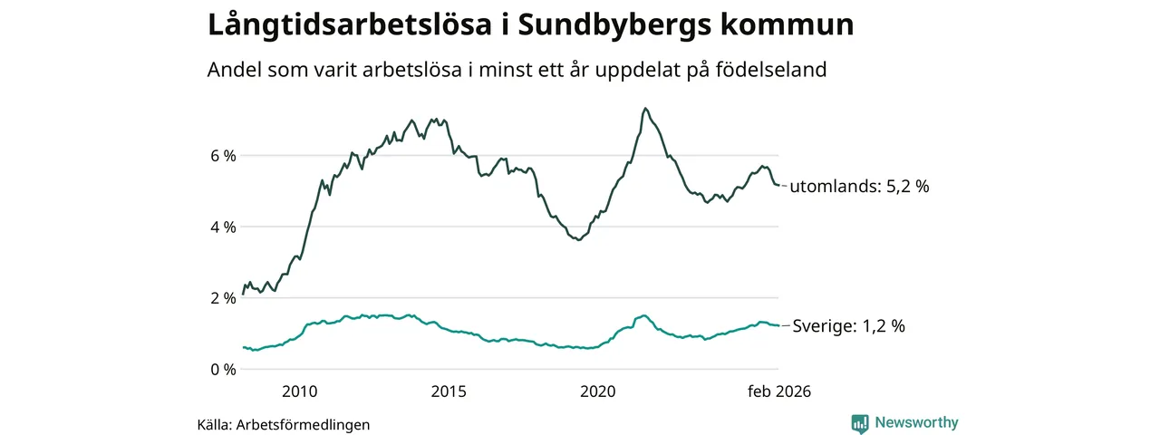 246 av de långtidsarbetslösa i Sundbyberg är födda i Sverige, medan 662 är födda utomlands. Det innebär att långtidsarbetslösheten bland Sverigefödda är 1,2 procent, medan den är fyra gånger så hög – 5,2 procent – bland födda utomlands. Även i riket som helhet är arbetslösheten högre bland utrikesfödda.