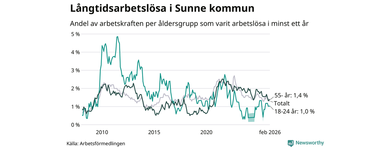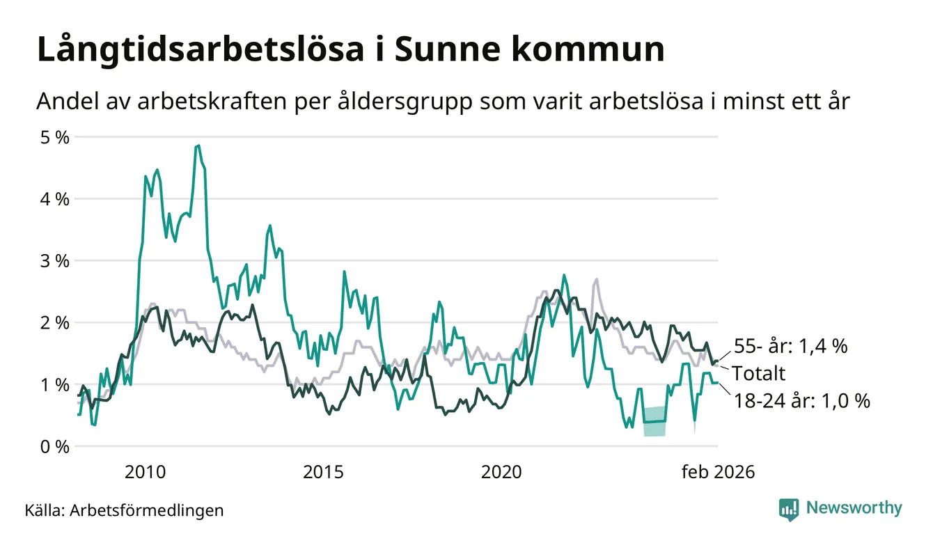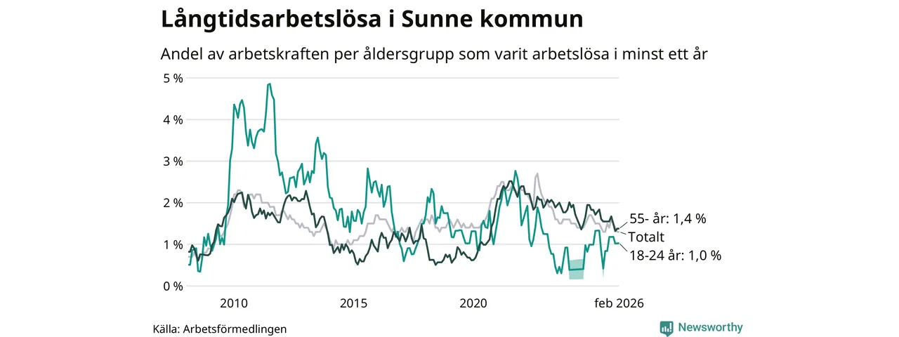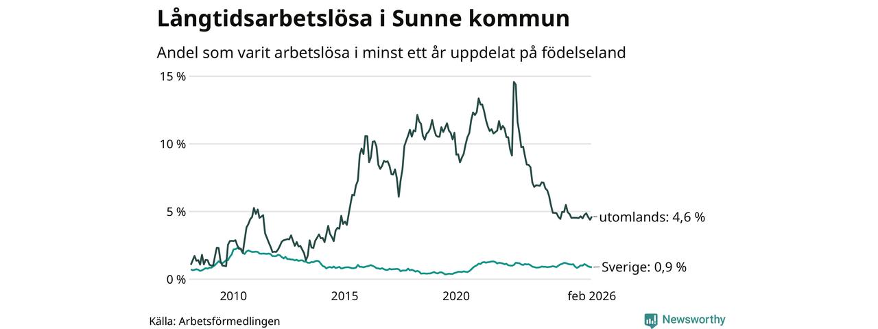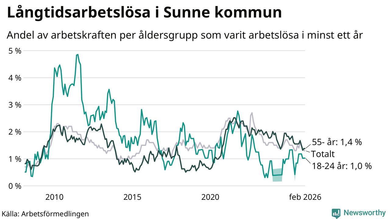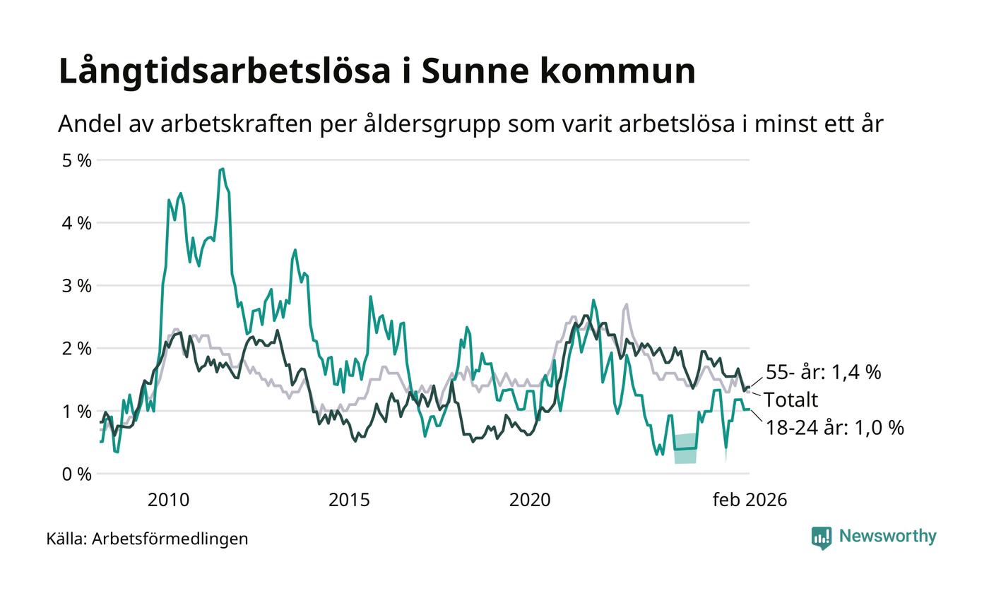 I februari hade 84 Sunnebor varit arbetslösa i minst ett år, vilket är en fler än månaden innan. 84 personer motsvarar 1,3 procent av arbetskraften i kommunen – andelen långtidsarbetslösa är ungefär på samma nivå som för ett år sedan.