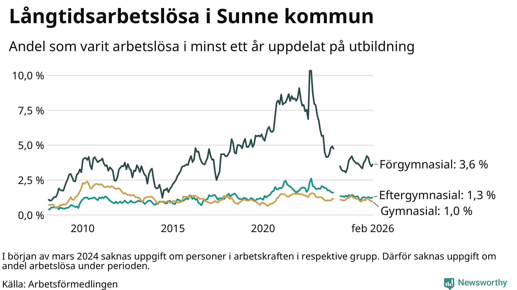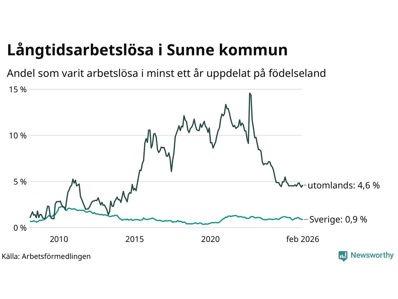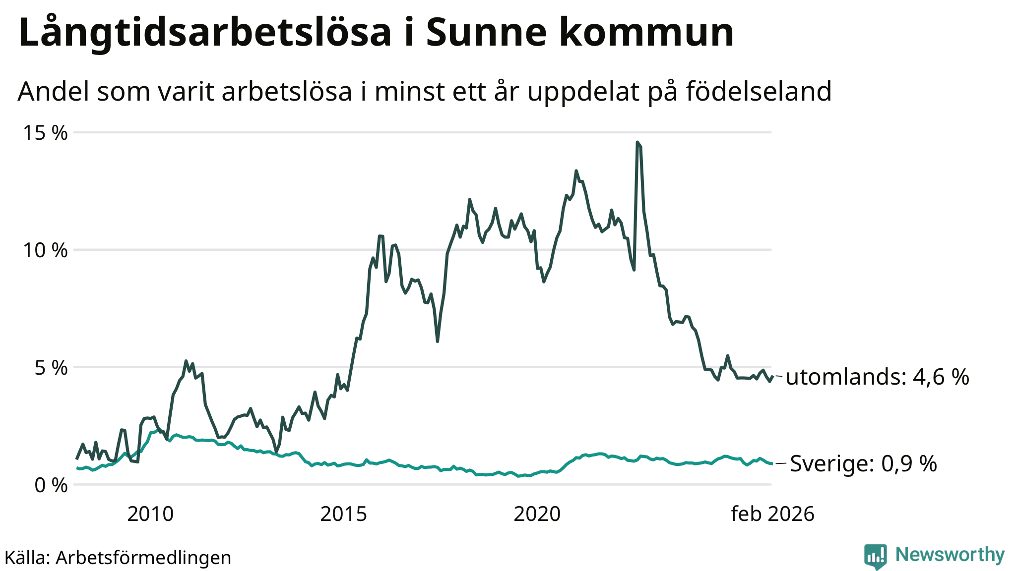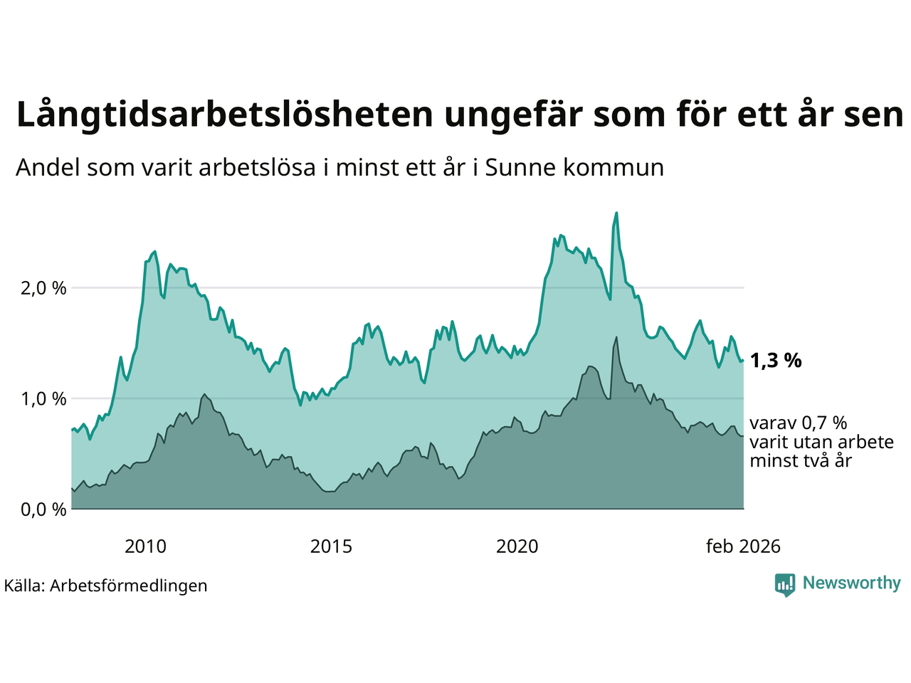 I februari hade 84 Sunnebor varit arbetslösa i minst ett år, vilket är en fler än månaden innan. 84 personer motsvarar 1,3 procent av arbetskraften i kommunen – andelen långtidsarbetslösa är ungefär på samma nivå som för ett år sedan.