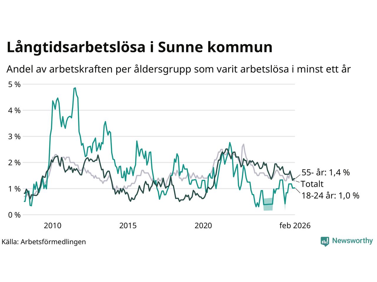 | Andel arbetslösa i minst två år | 0,7 % | 1,3 % | 1,6 % |