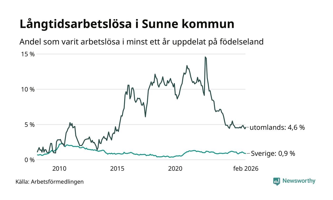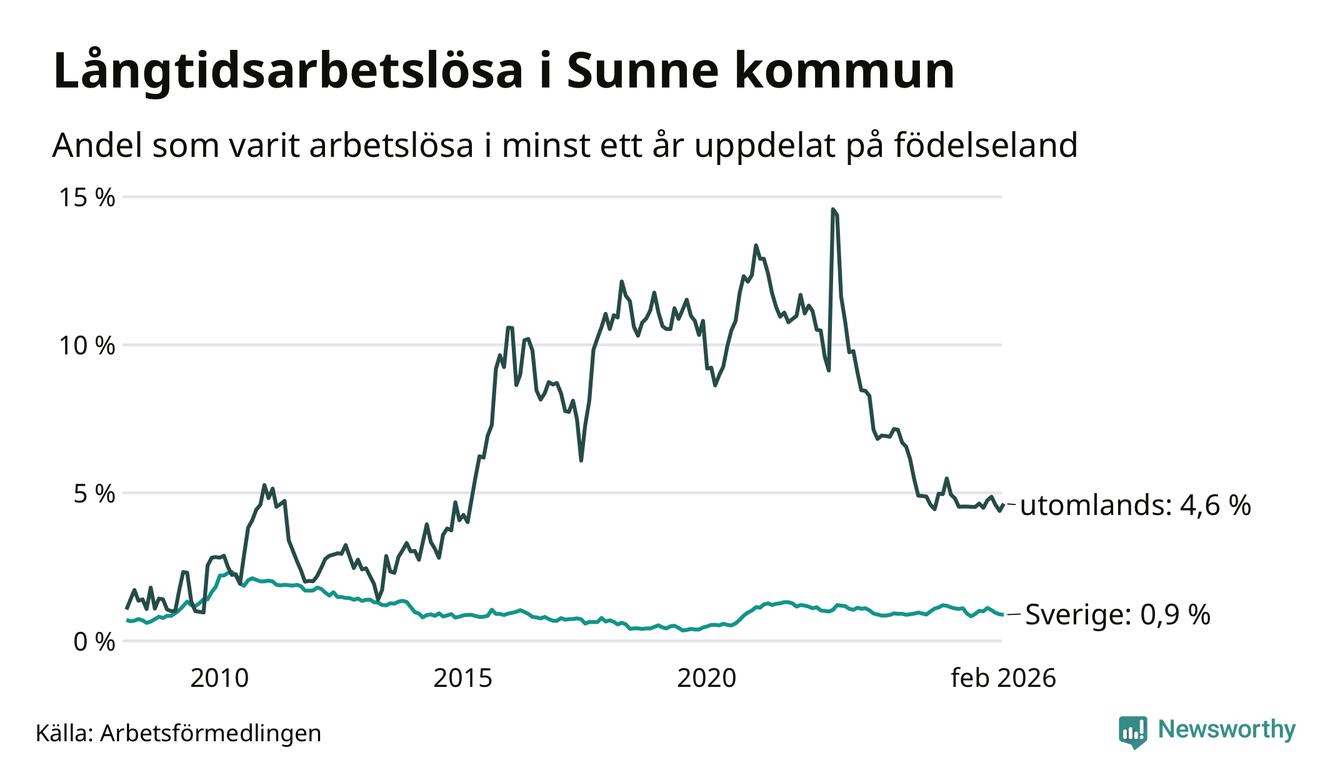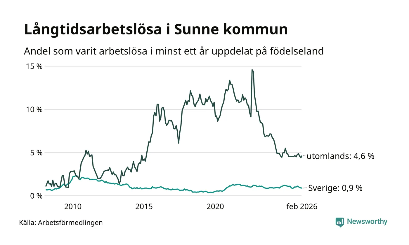 48 av de långtidsarbetslösa i Sunne är födda i Sverige, medan 36 är födda utomlands. Det innebär att långtidsarbetslösheten bland Sverigefödda är 0,9 procent, medan den är fem gånger så hög – 4,6 procent – bland födda utomlands. Även i riket som helhet är arbetslösheten högre bland utrikesfödda.